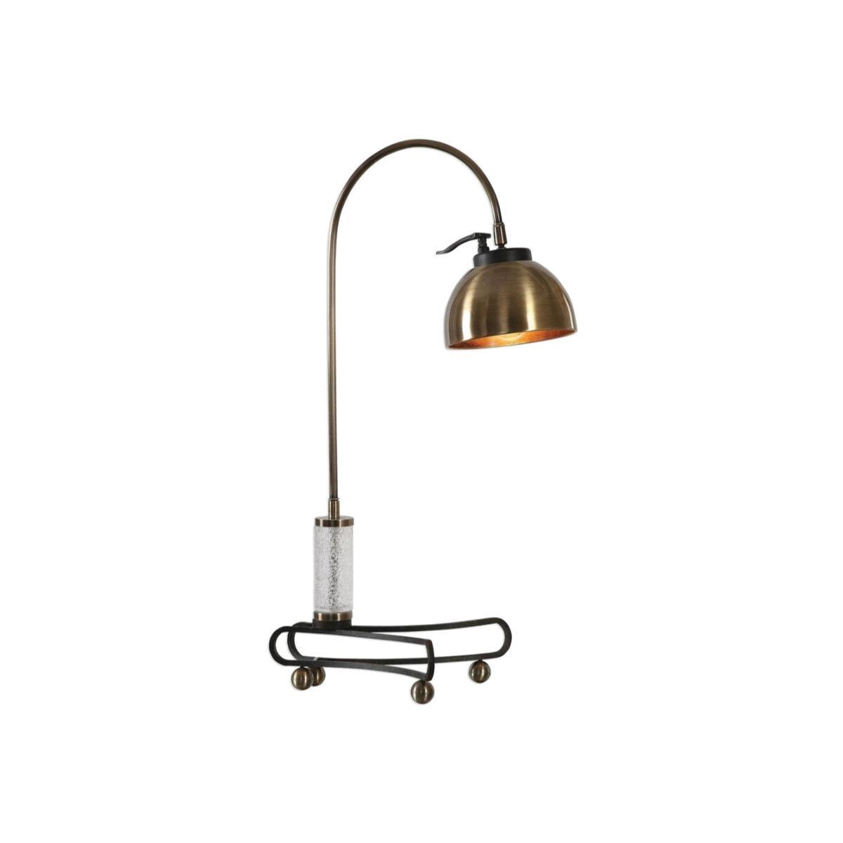 Boldly curved, antique brass plated, iron arch, placed on a heavily seeded glass column accent, and unique rust bronze iron feet. The coordinating iron dome shade features an industrial inspired handle for easy up and down placement. *Moot Trading Ltd is not a lender and acts only as an introducer. The credit product is provided by Klarna Bank AB (publ). Credit is only available to permanent UK residents aged 18 and over, subject to status. Terms and conditions apply. Please note that the following products are not regulated by the FCA: Pay in 30 days and Pay in 3 instalments. Read More.