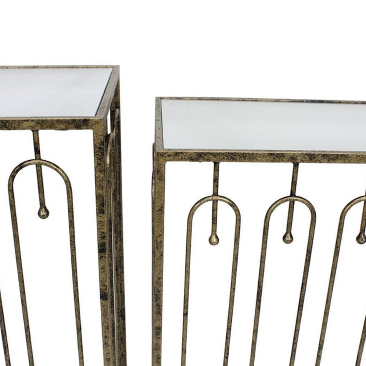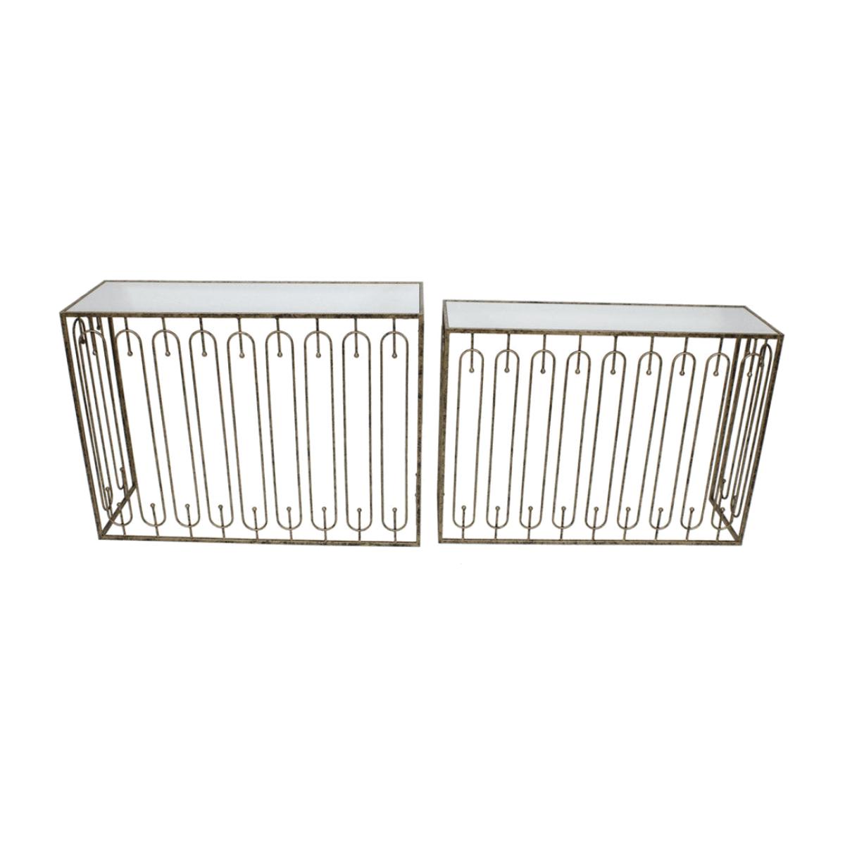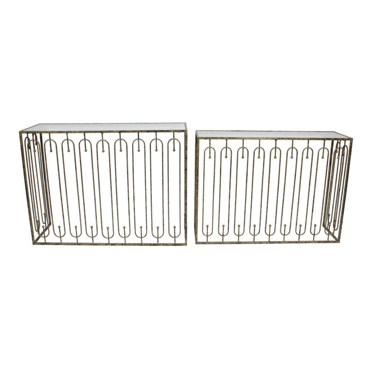Two is always better than one. A beautiful set of two console tables that can slide into each other Rectangular in design with oblong detailing on the outer surround and finished with a mirrored to. View More. Two is always better than one. A beautiful set of two console tables that can slide into each other Rectangular in design with oblong detailing on the outer surround and finished with a mirrored top and distressed antique gold Ideal used together or in two different areas of the home for additional styling. The perfect choice for when space is limited.