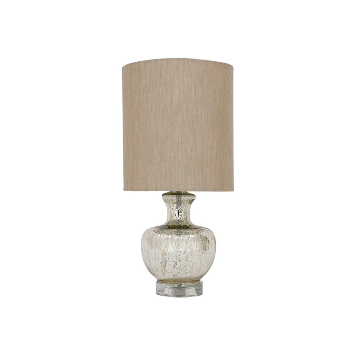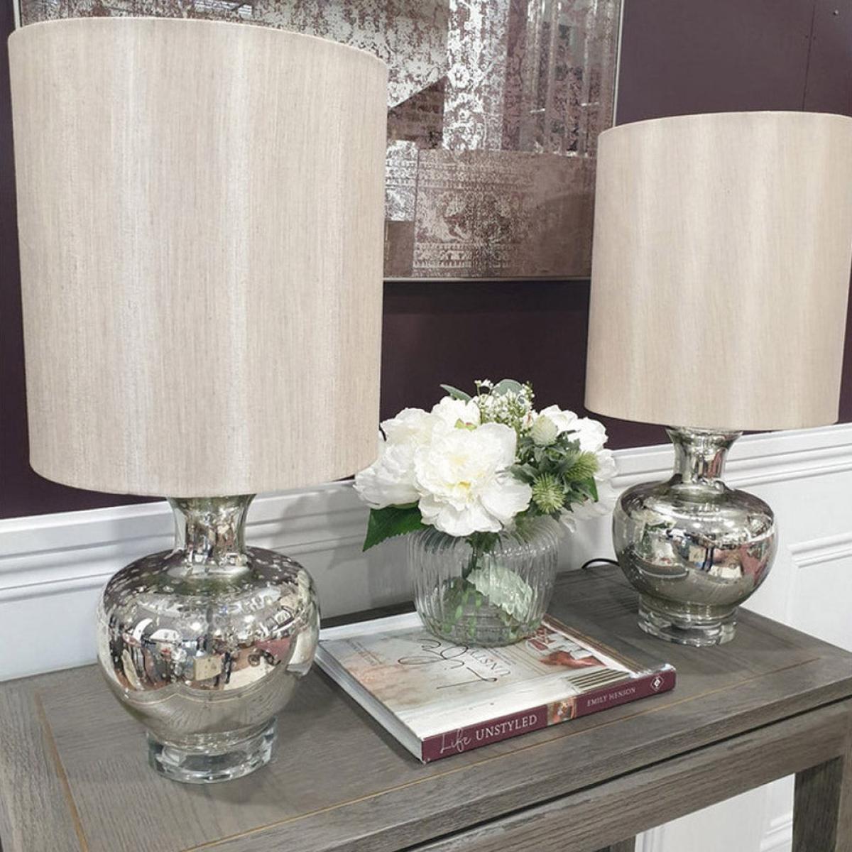 Mercury glass with silver tones, crystal base and linen shade. Outlet items may show some signs of minor cosmetic imperfections. Dimensions: W:24 x D:24 x H:48cm. View More. Mercury glass with silver tones, crystal base and linen shade. Outlet items may show some signs of minor cosmetic imperfections. .