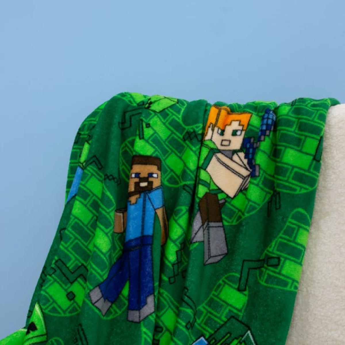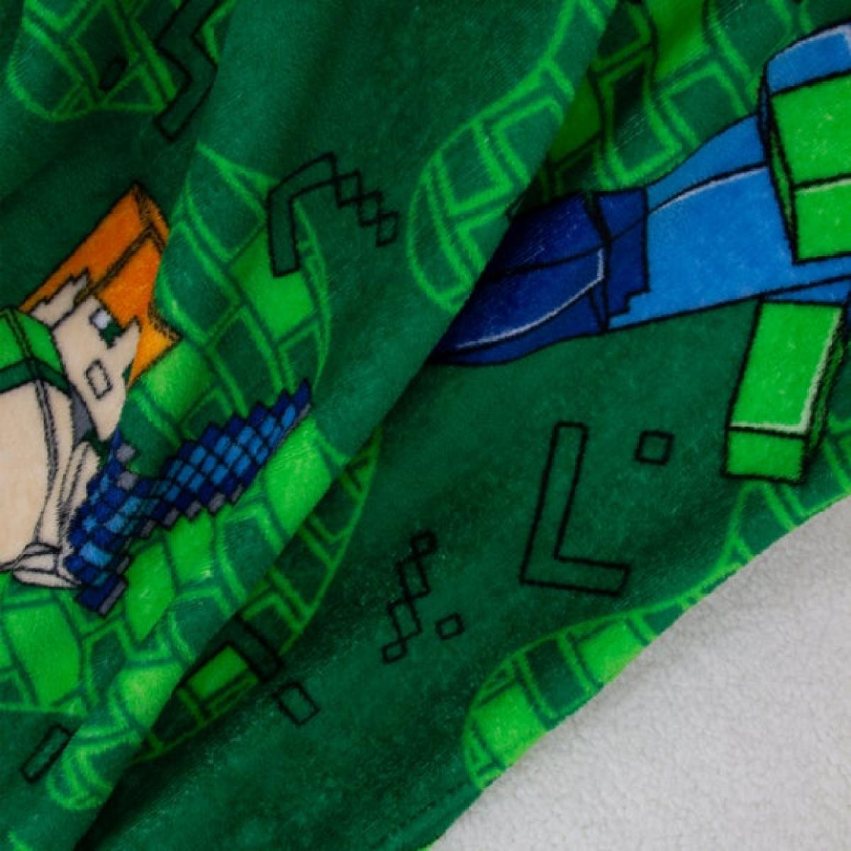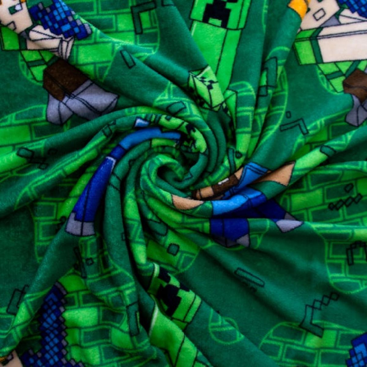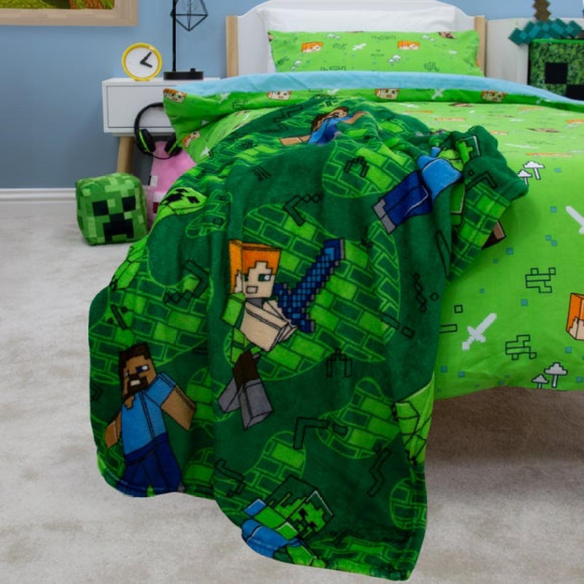 * Soft and cosy, fleece composition * Dynamic, Minecraft design * Machine Washable * Corresponding items available Level up your comfort with the official Minecraft Levels Fleece Blanket. This soft and cosy fleece composition features a dynamic, repeating pattern of main characters Steve and Alex alongside classic mobs like zombies and Creepers, set on a green, brick-motif background. Perfect for gamers of all ages, this large blanket is great as a throw for the sofa or an extra layer on a bed. Lightweight and easily foldable, it’s ideal for travel or car journeys. Made from soft textured polyester, this durable blanket is conveniently machine washable, with corresponding items available to create the ultimate gaming retreat.