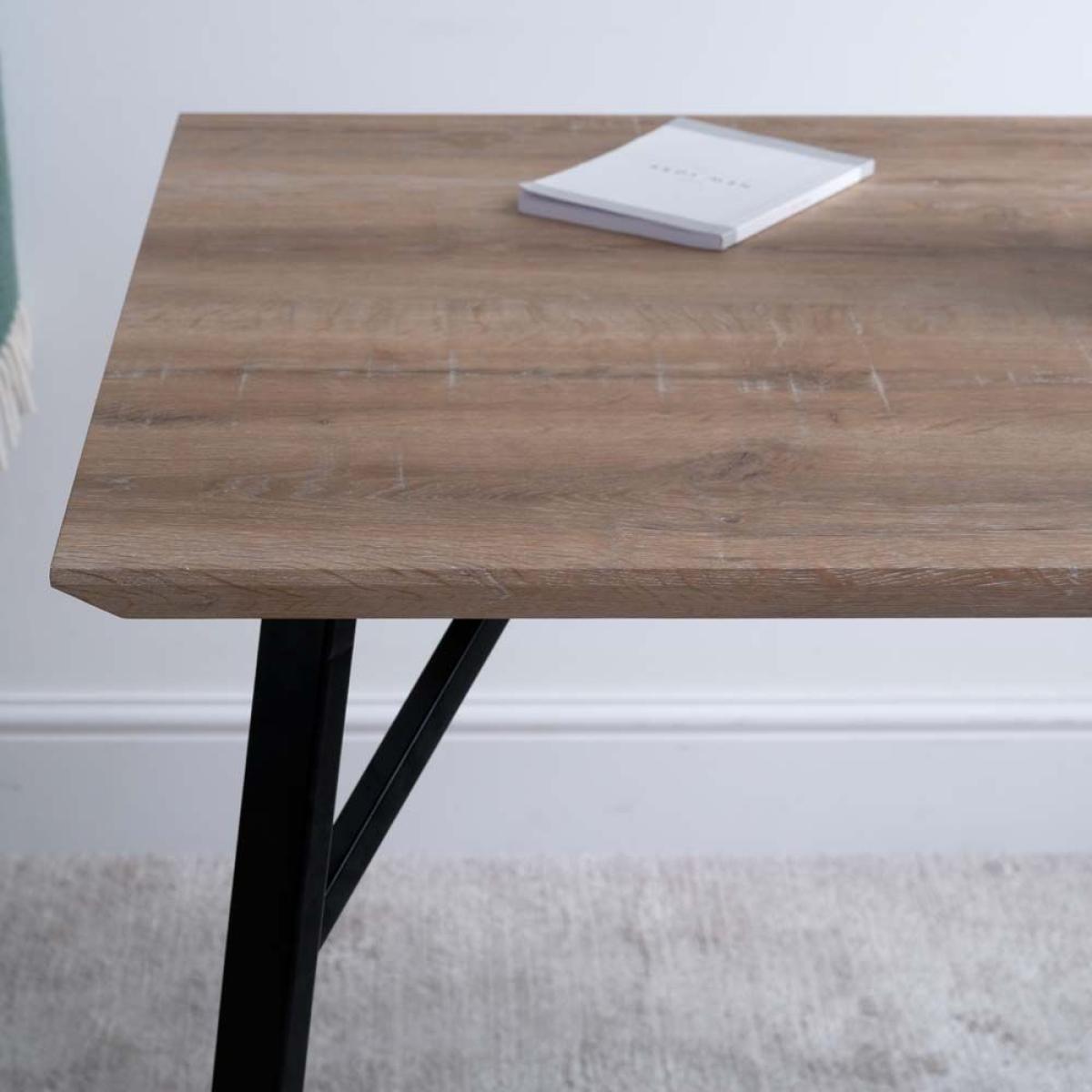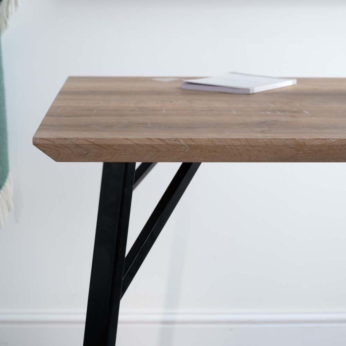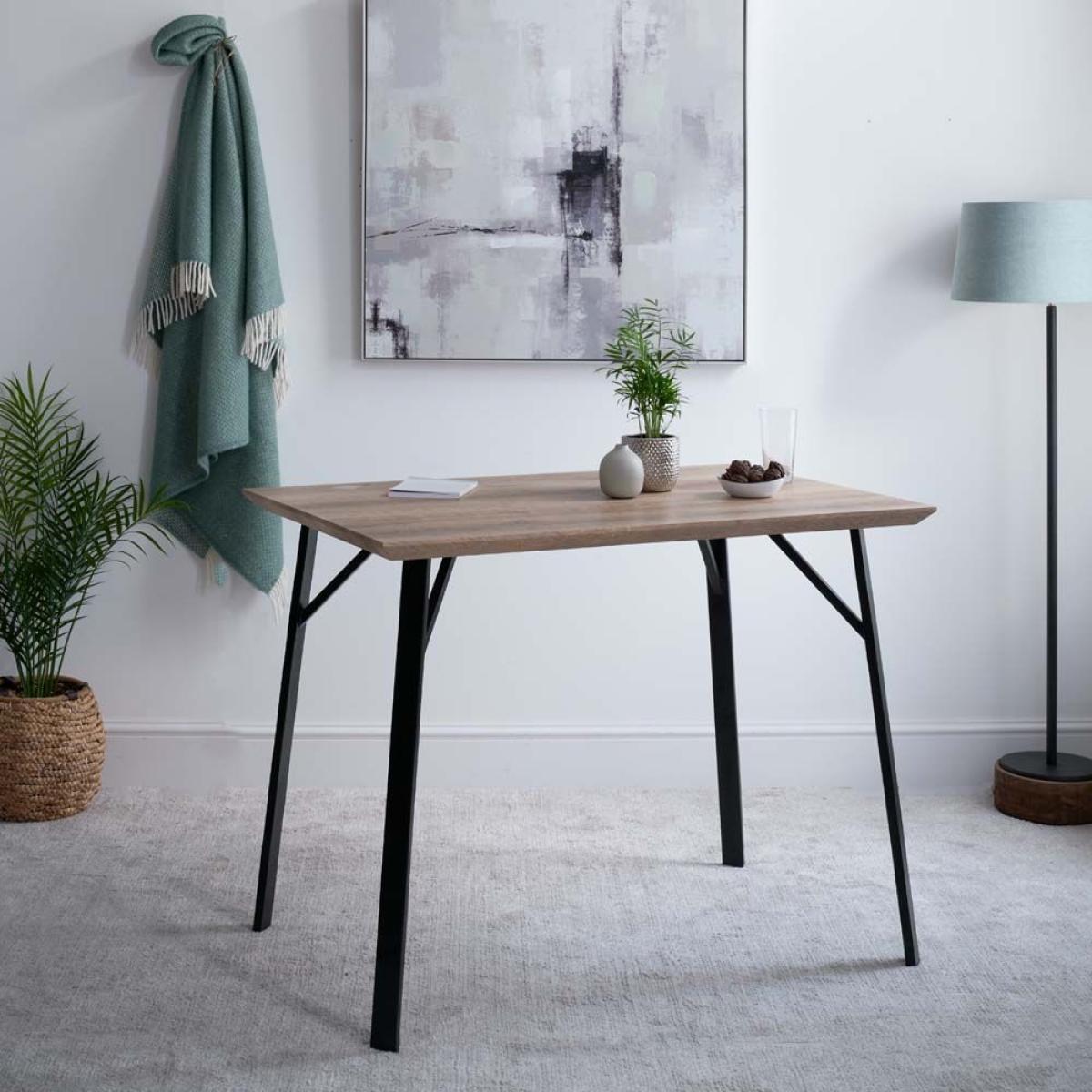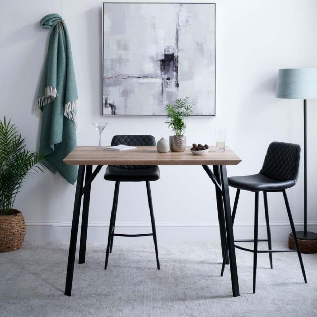 The Minerva Bar Table is a briliant way to achieve that casual dining look when you haven't already got a fitted breakfast bar in your kitchen/diner. The Industrial style we are all loving in our homes right now is intrinsic to the look of the Minerva. With angled sturdy powder coated black metal legs, and a top which is coated in a wood effect foil this table is both stylish and practical. It's surface has a deliberately distressed reclaimed timber look and feel to it's texture, and because it's not real wood, it's easy to keep clean and it's very durable.