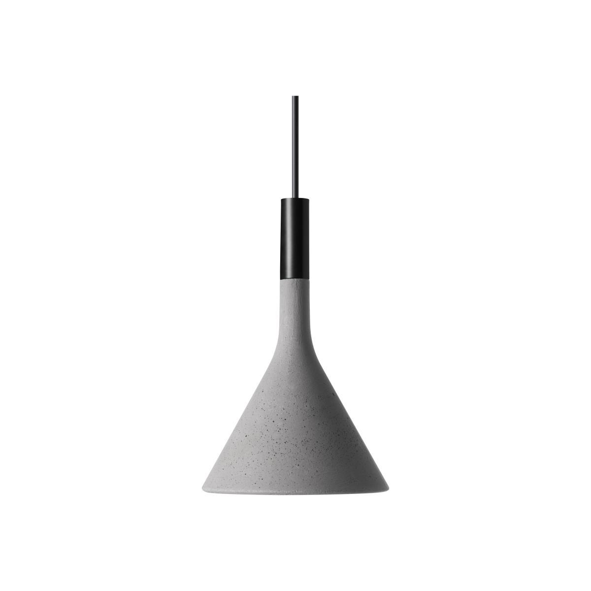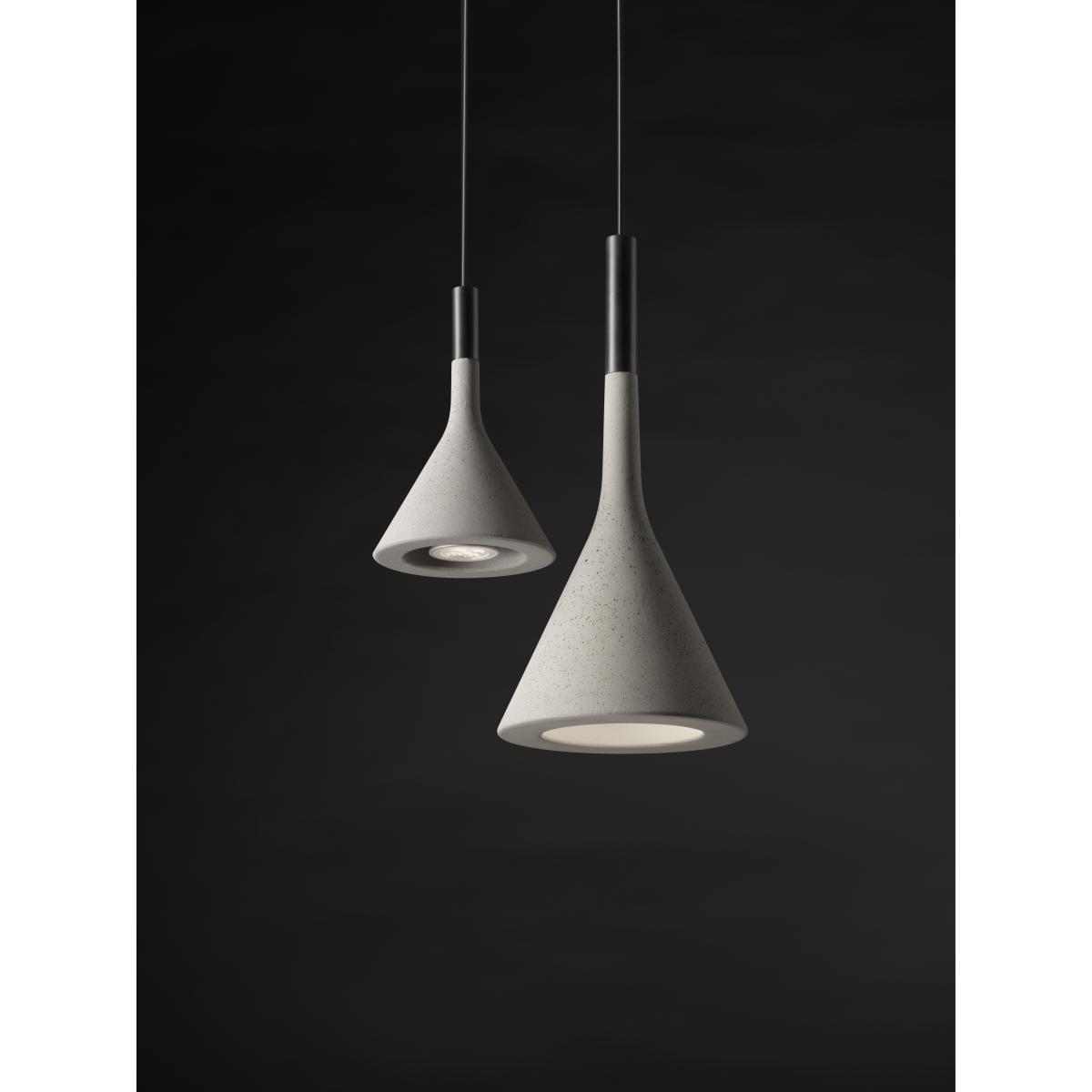 Born from the desire to use rough concrete, typical of large modern buildings, to create a light object in slender, refined forms, the Aplomb lamp has been hugely successful ever since its inception. A special concrete formula which can be poured into slender moulds has produced an elegant and inimitable product, not simply in its characteristic upturned funnel shape but also in its surface material which is both rough and delicate to the touch. By using the same material, Foscarini proposes an even smaller version of the original suspension Aplomb lamp, which can be used alone or together with the matching larger model at home or in contract settings, over tables, work tops or islands. Aplomb mini is also made in three colours for endless combinations and contexts: grey, white and brown.