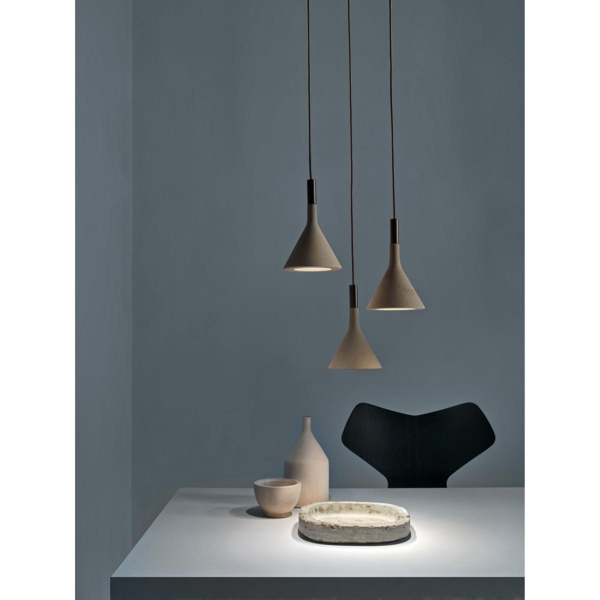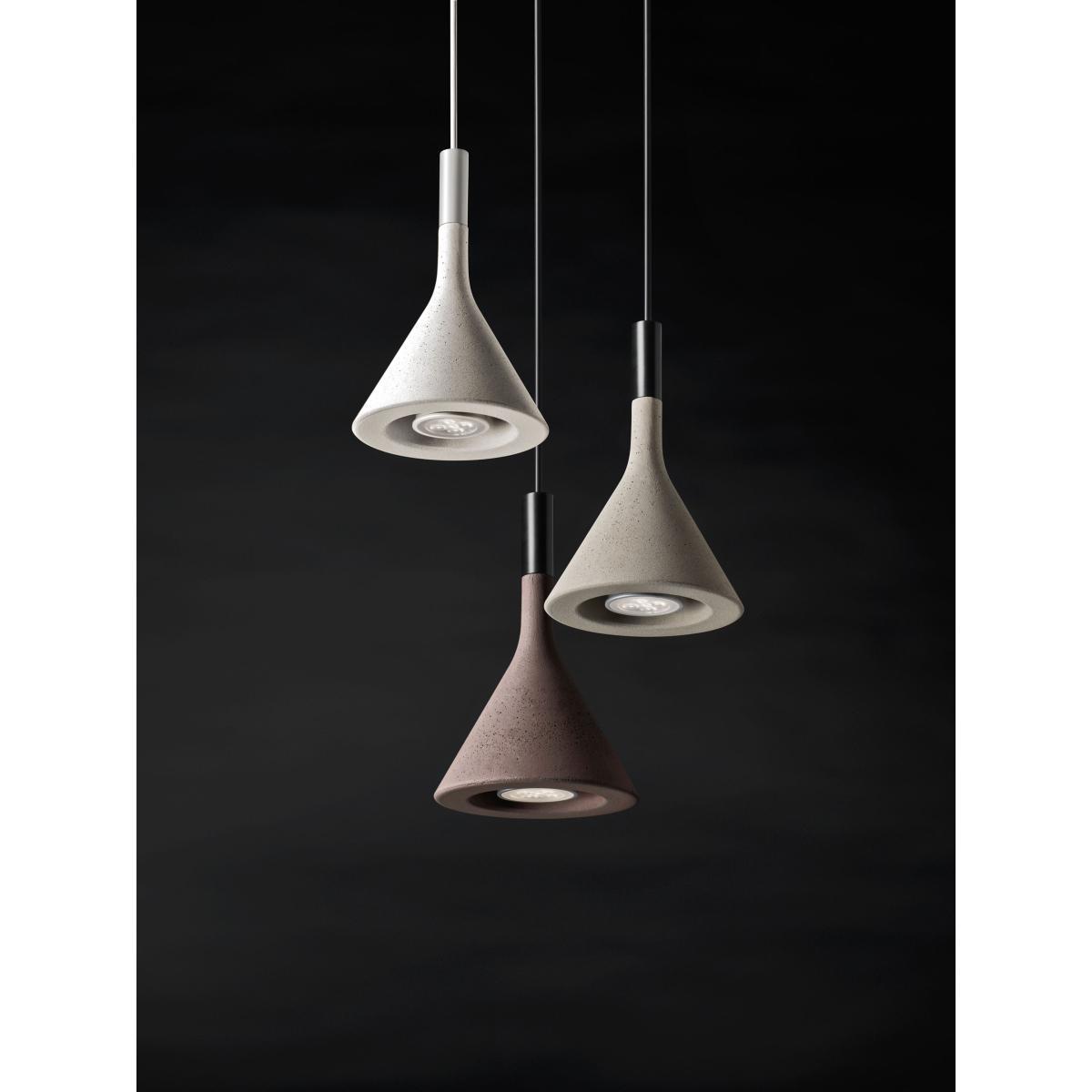 Born from the desire to use rough concrete, typical of large modern buildings, to create a light object in slender, refined forms, the Aplomb lamp has been hugely successful ever since its inception. A special concrete formula which can be poured into slender moulds has produced an elegant and inimitable product, not simply in its characteristic upturned funnel shape but also in its surface material which is both rough and delicate to the touch. By using the same material, Foscarini proposes an even smaller version of the original suspension Aplomb lamp, which can be used alone or together with the matching larger model at home or in contract settings, over tables, work tops or islands. Aplomb mini is also made in three colours for endless combinations and contexts: grey, white and brown.