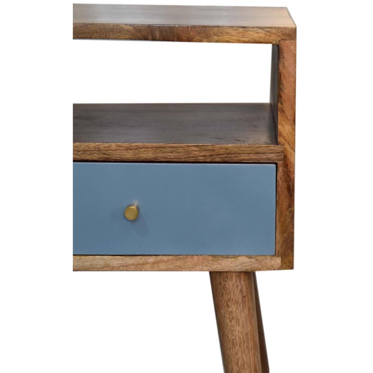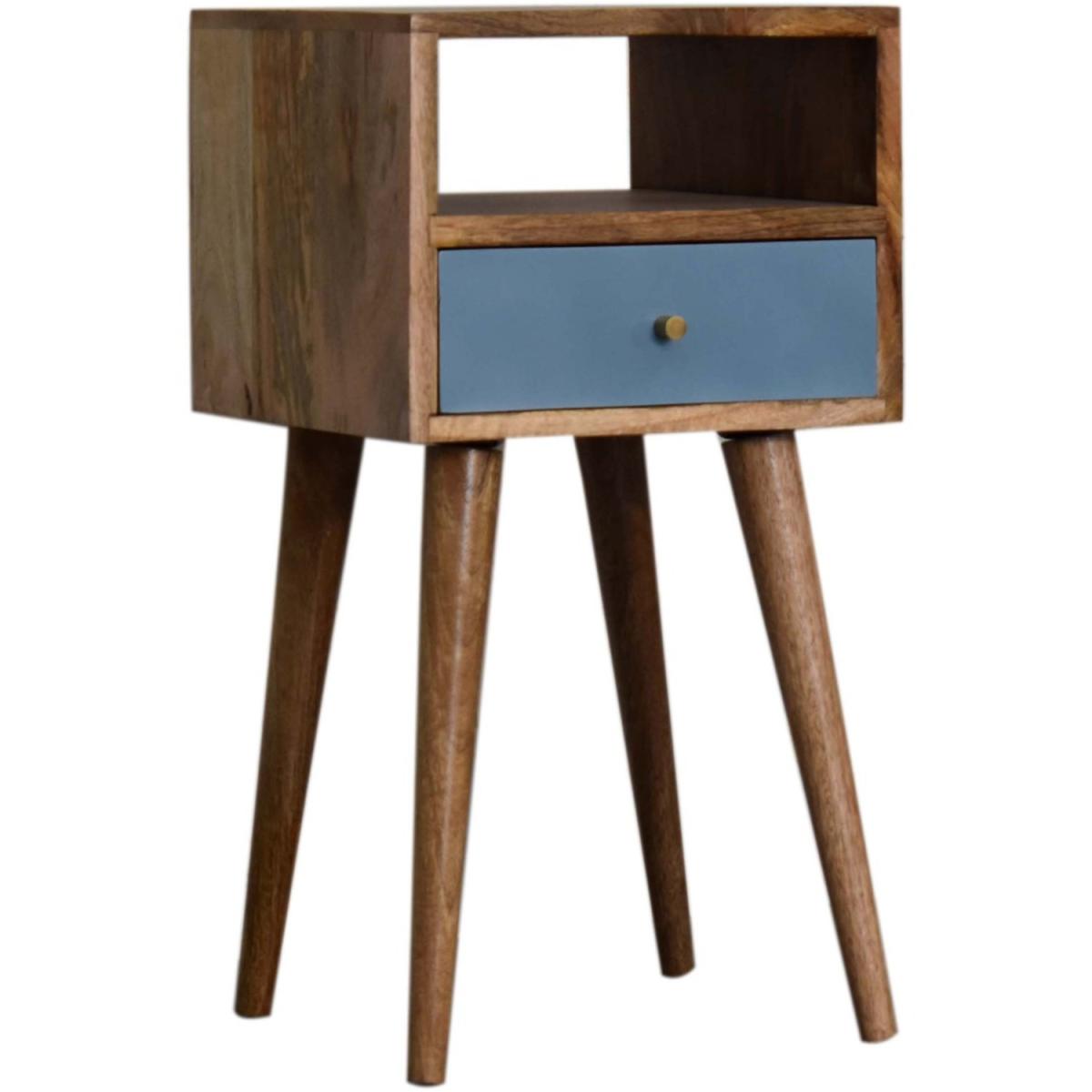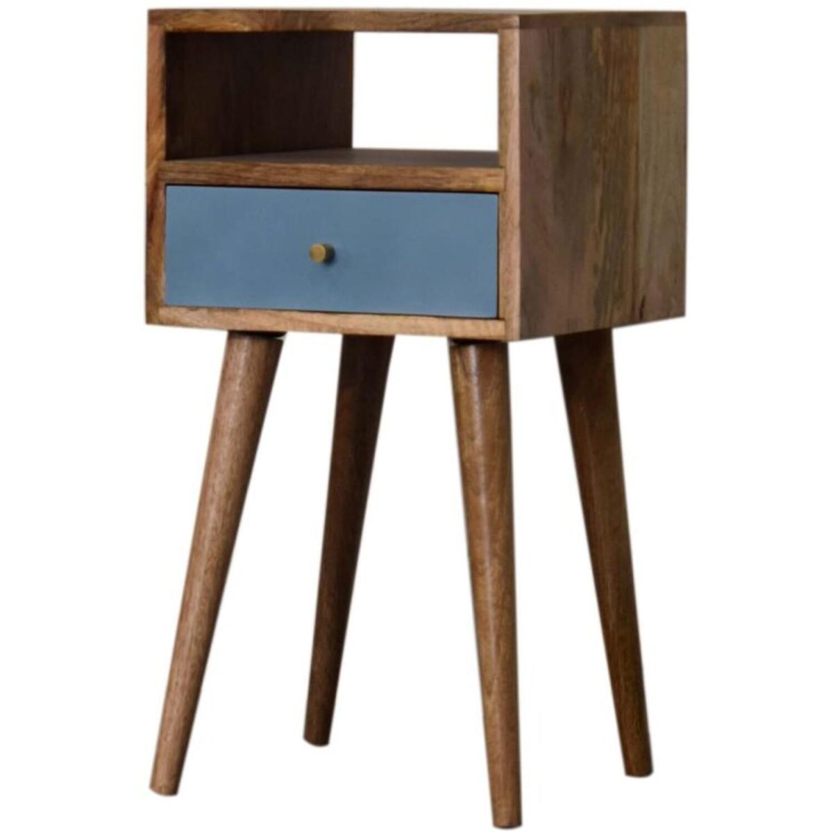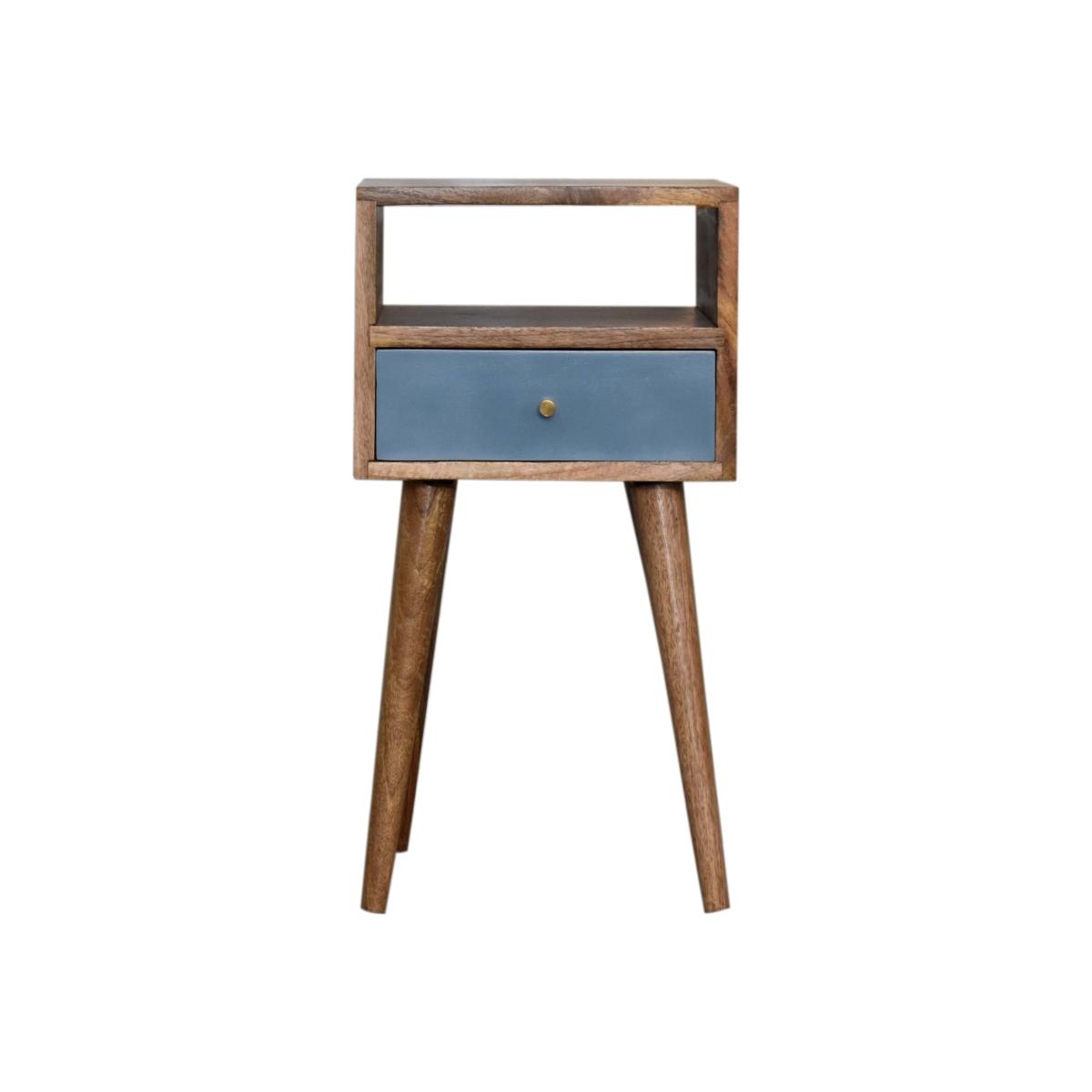 This beautifully designed bedside is constructed from 100 solid mango wood and has a fine oak-ish finish. Useful storage space is available with 1 blue hand-painted drawer, 1 shelf, and a decent-sized tabletop to place any ornaments. Other features include 4 Scandinavian-styled legs to give the piece a modern style that will suit most decors.