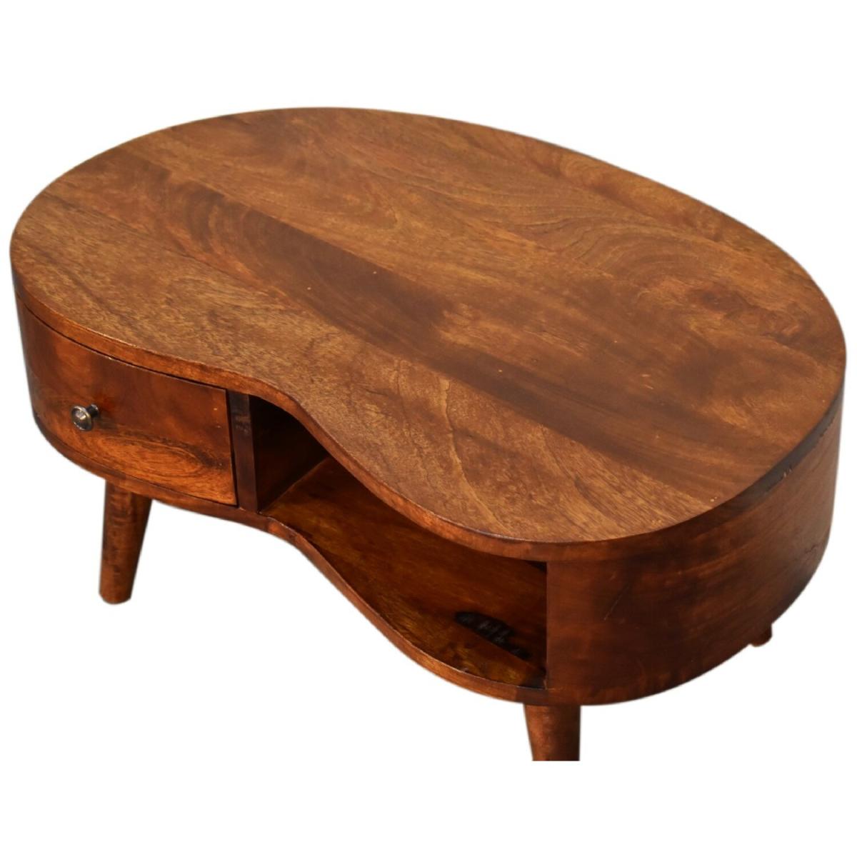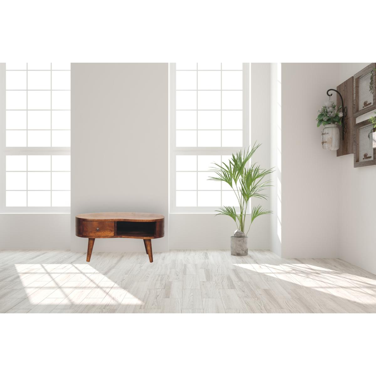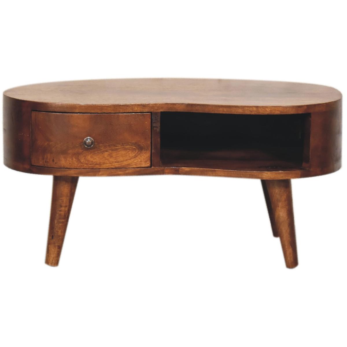 This mini solid wood coffee table has been constructed from 100 solid mango wood in a chestnut finish and offers a uniquely shaped design with rounded edges. It features one open slot and one drawer with a shiny knob and Nordic-style legs. A great simple and add to the bedroom. This product is part of the Recession Collection.