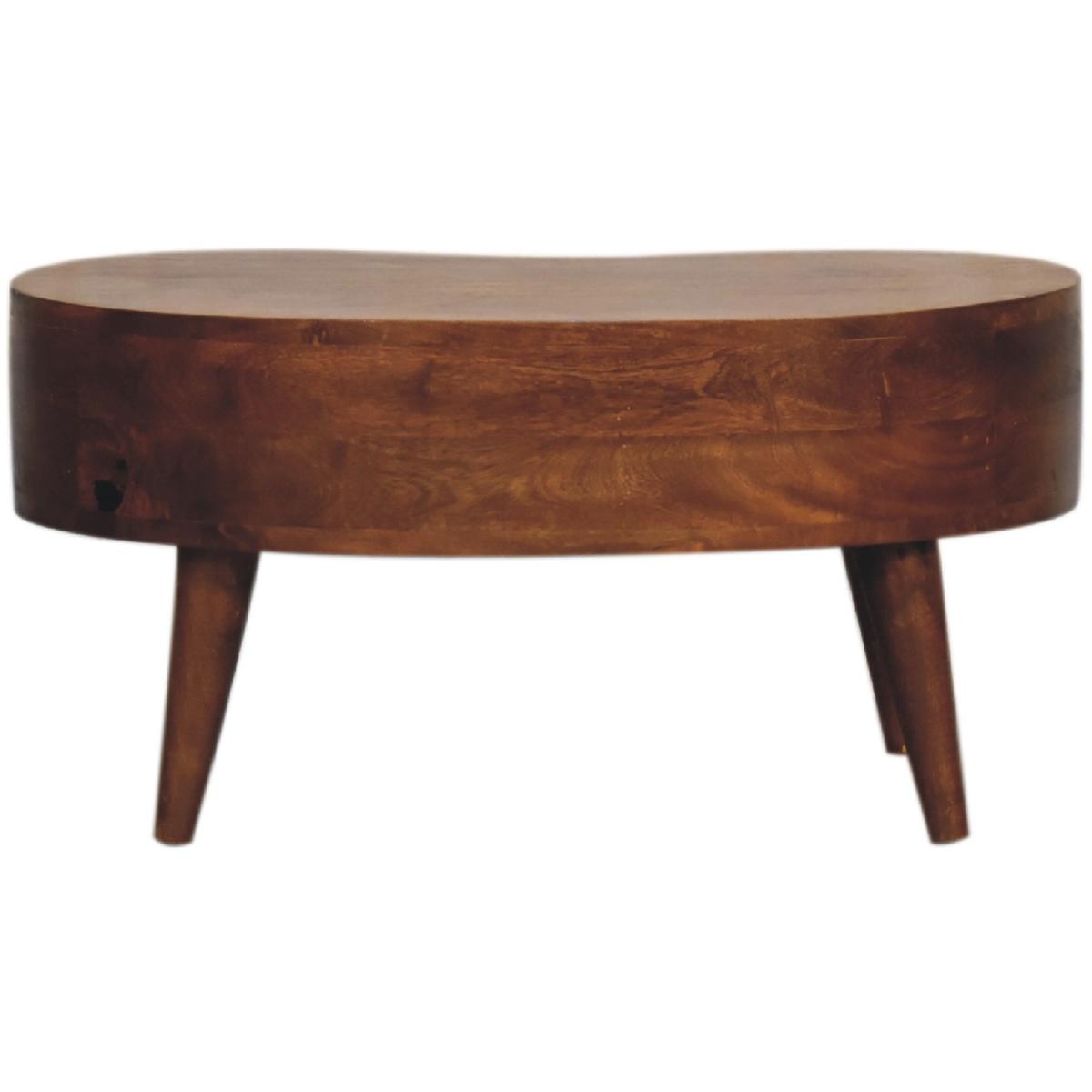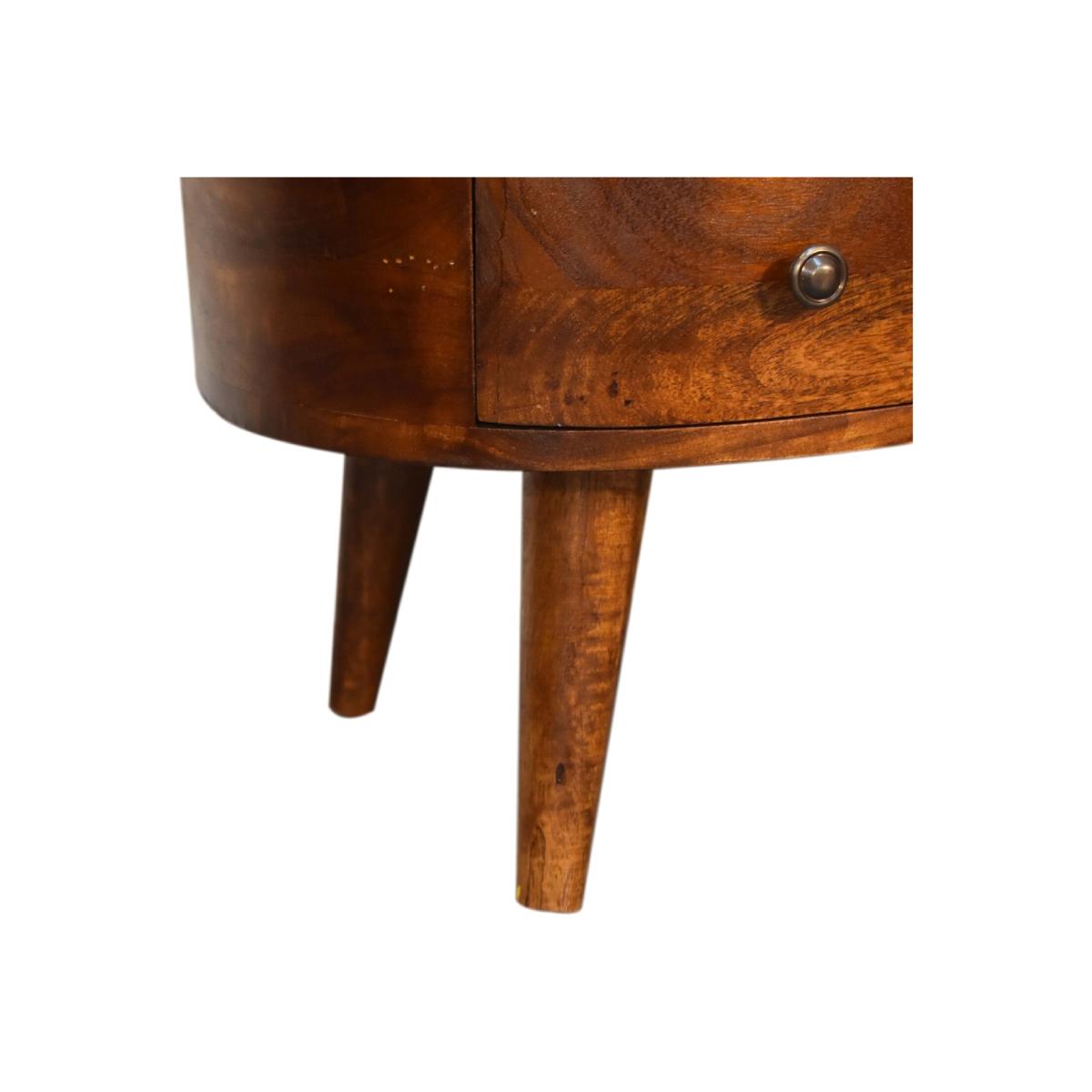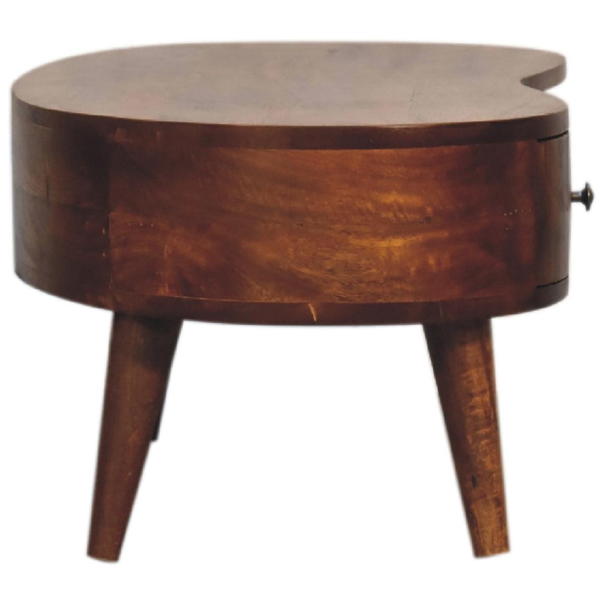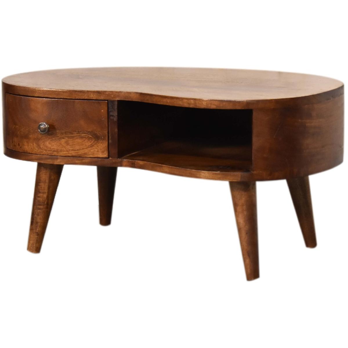 This mini solid wood coffee table has been constructed from 100 solid mango wood in a chestnut finish and offers a uniquely shaped design with rounded edges. It features one open slot and one drawer with a shiny knob and Nordic-style legs. A great simple and add to the bedroom. This product is part of the Recession Collection.