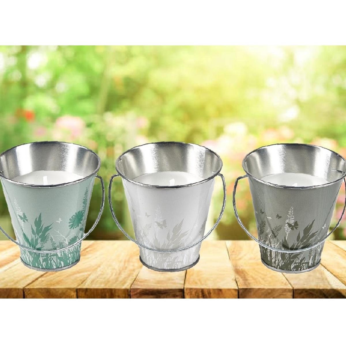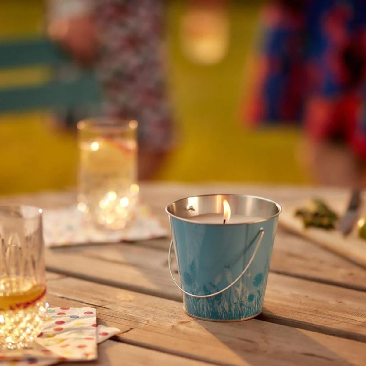 This elegant nature print citronella bucket candle is an ideal necessity for those warm summer evenings. Not only is it great for decorative purposes and creating a warm welcoming atmosphere, but it is also designed to help keep those pesky bugs at bay too. The bucket measures approximately 9cm in diameter and 9cm in height and features a neutral green coloured nature print perfect for those summer days. One coloured bucket supplied at random. The free-standing design enables you to use on tabletops and the integrated handle makes moving about an easy task. Quick and easy to light and will burn for up to 6 hours. Featuring a wind resistant wick and containing natural citronella oil, this bucket candle is a must have for outdoor dining or cozy evenings in the garden.