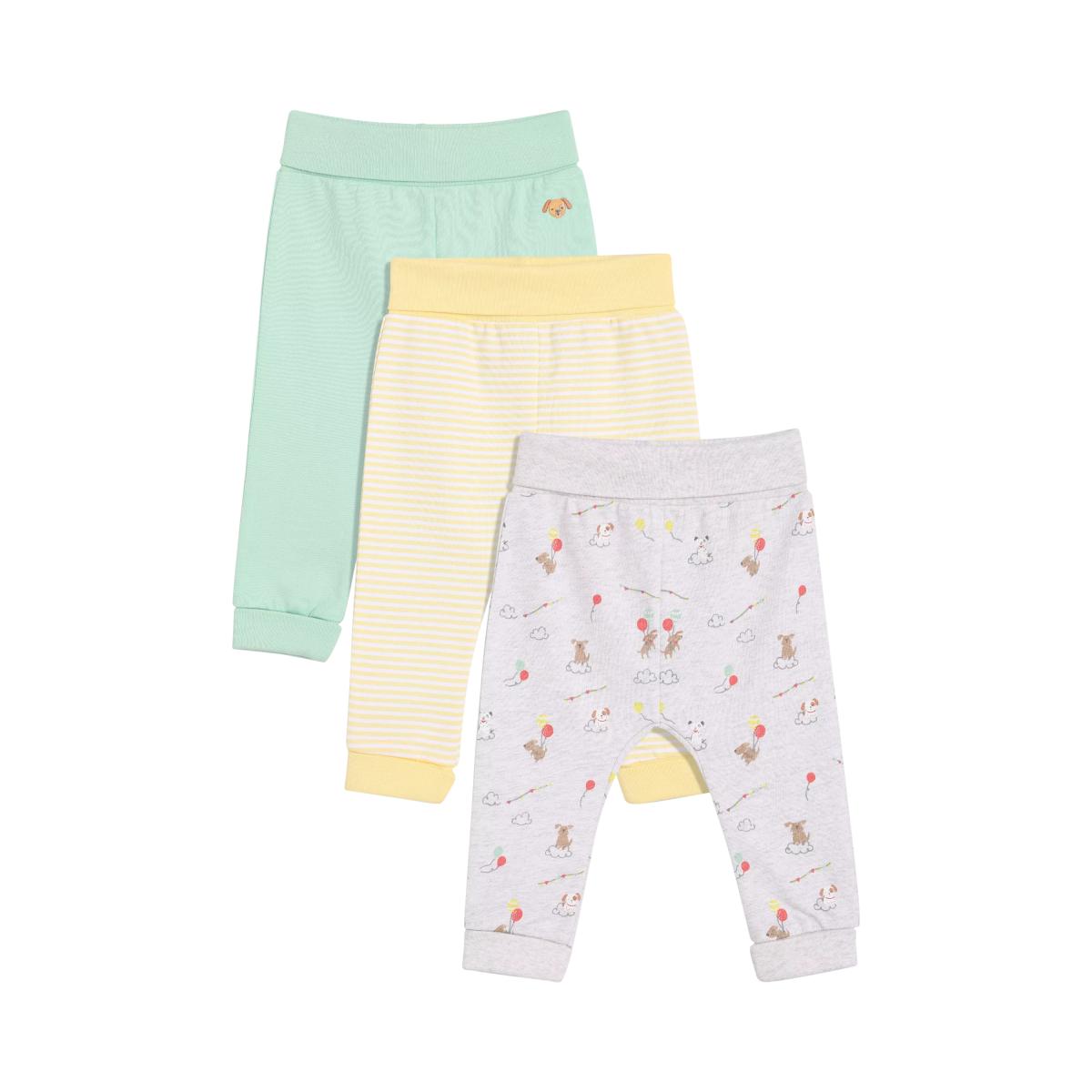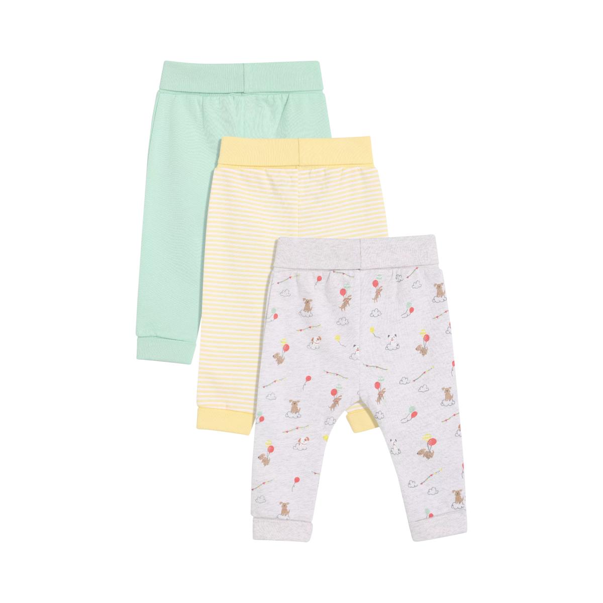 A pack of three joggers, made from super-soft cotton and designed with a roll-up, roll-down waistband and cuffs to grow with your baby. The pack includes a print, striped and plain jersey pair, and they're ideal for teaming with tops and bodysuits to make an adorable outfit for everyday.