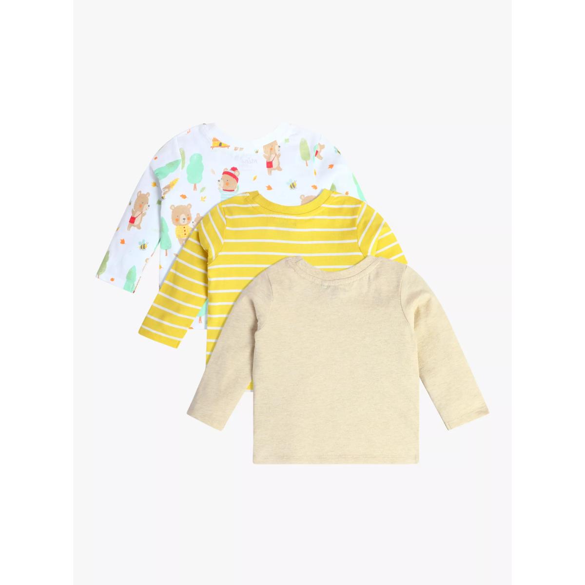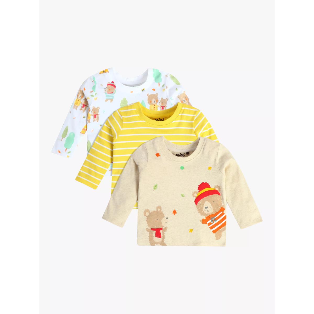 A pack of three long-sleeve and versatile tops for your little one. All made from super-soft cotton that's gentle on their delicate skin, they have popper buttons on the shoulders to help with easy dressing and quick changes. One is plain, one has a playful bear print and the other has a striped design.