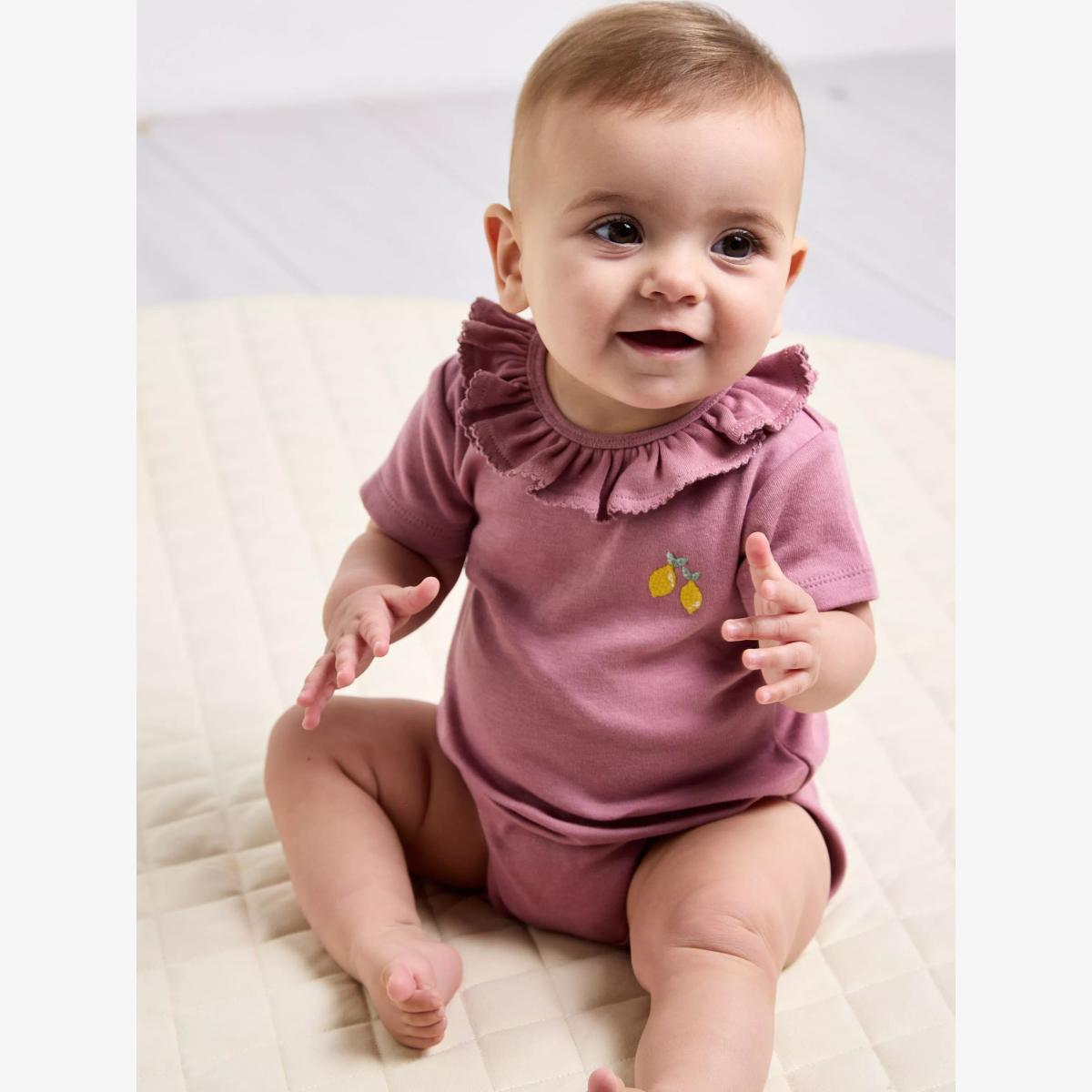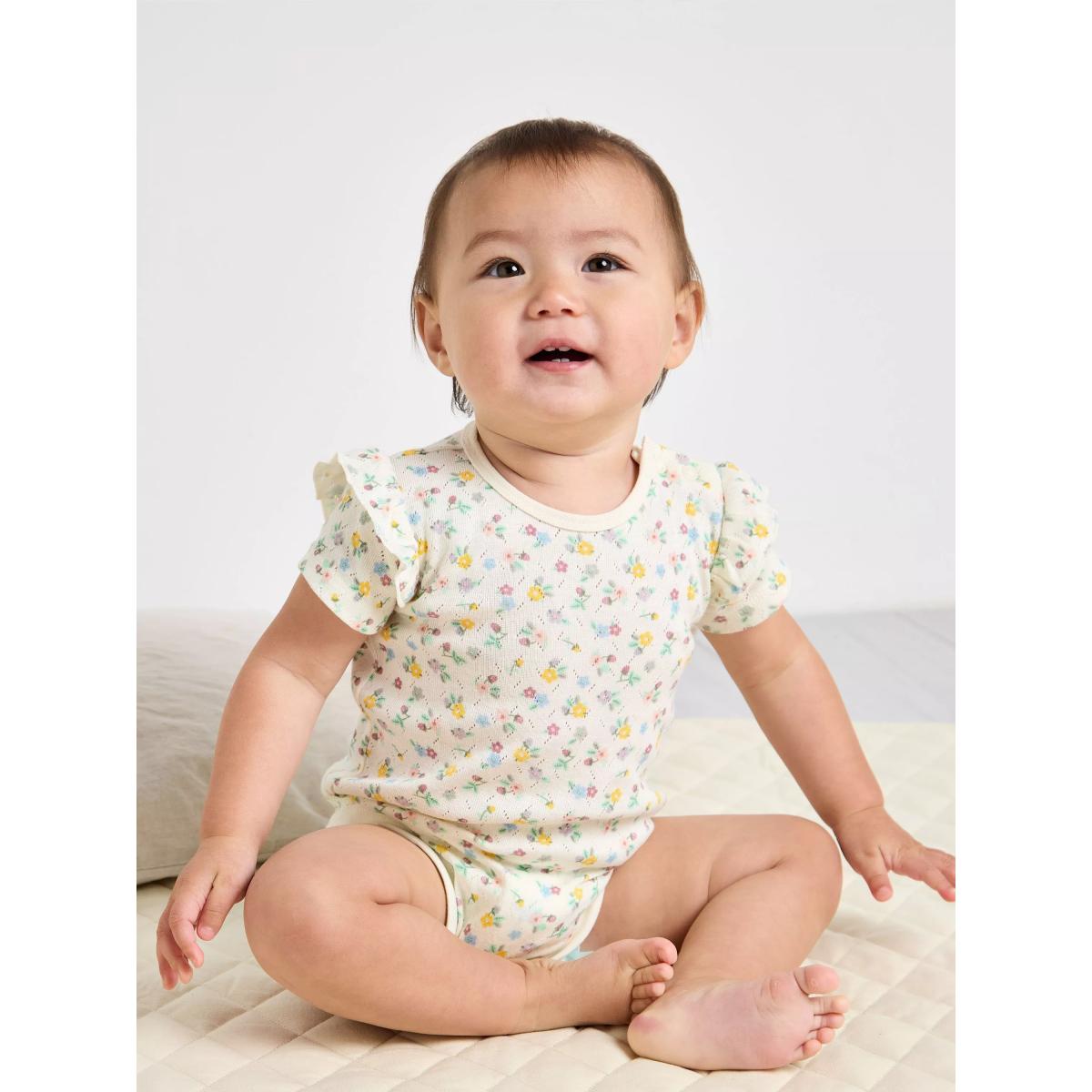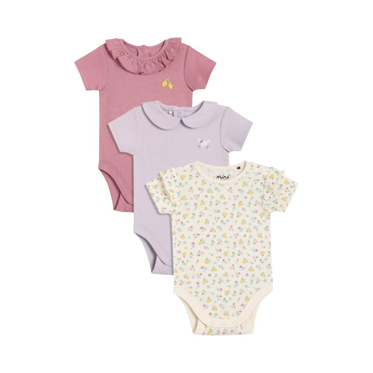 A pack of three short-sleeve bodysuits, each crafted from super-soft cotton that's gentle on delicate skin. Each one features two popper openings on the shoulders for easy dressing, as well as two layers of poppers on the gusset, so these bodysuits can grow with your little one. Set includes: An all-over floral print bodysuit with frill detail on the sleeves A plain bodysuit with neck frill detail and cute fruit embroidery on the chest A plain bodysuit with a delicate Peter Pan collar and mouse embroidery on the chest
