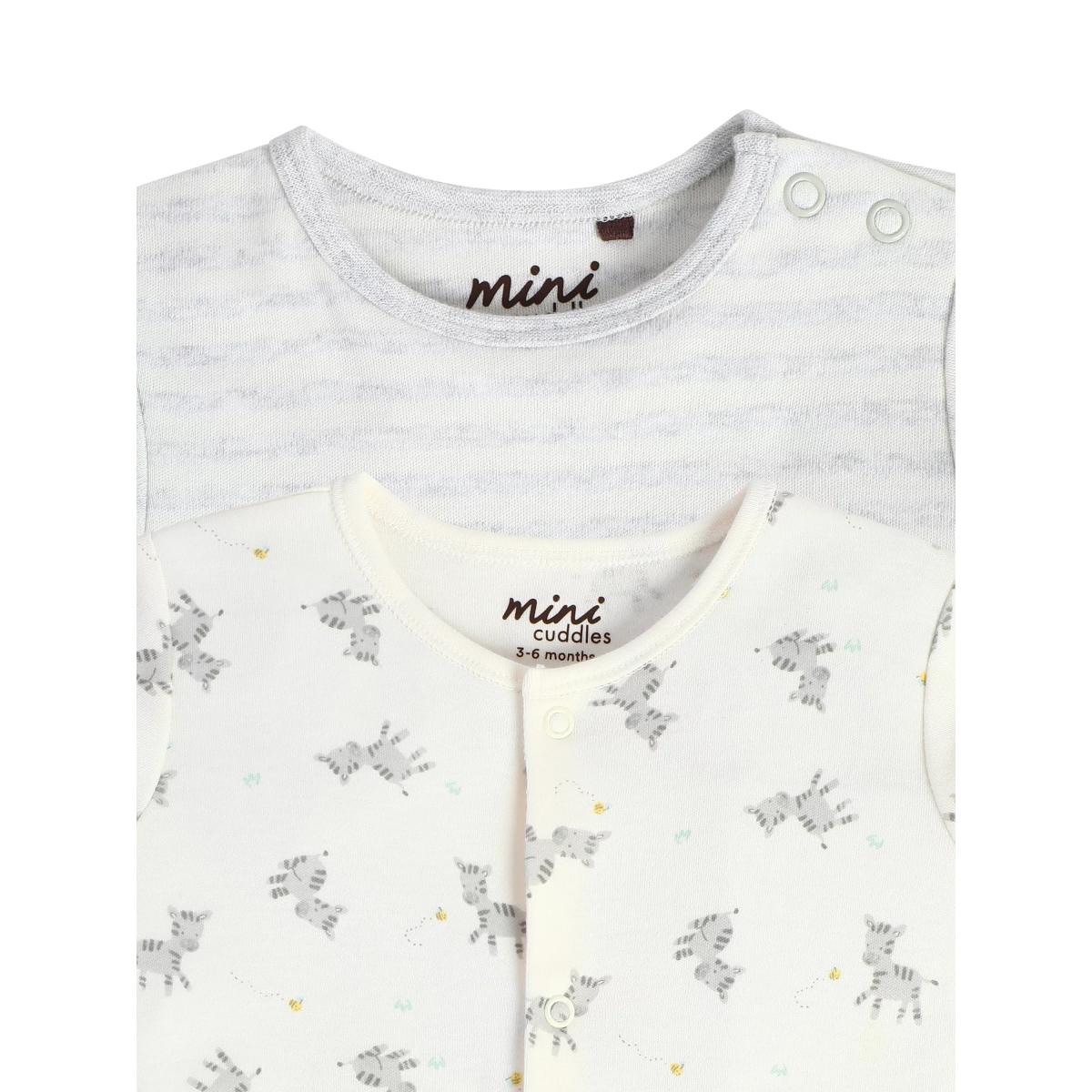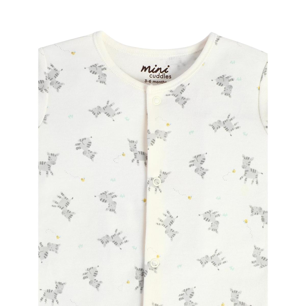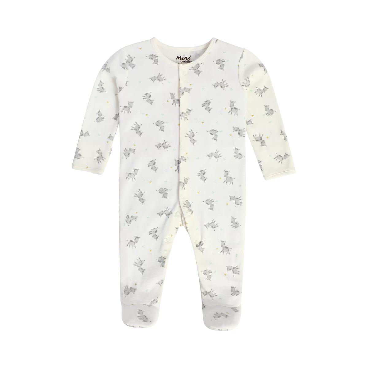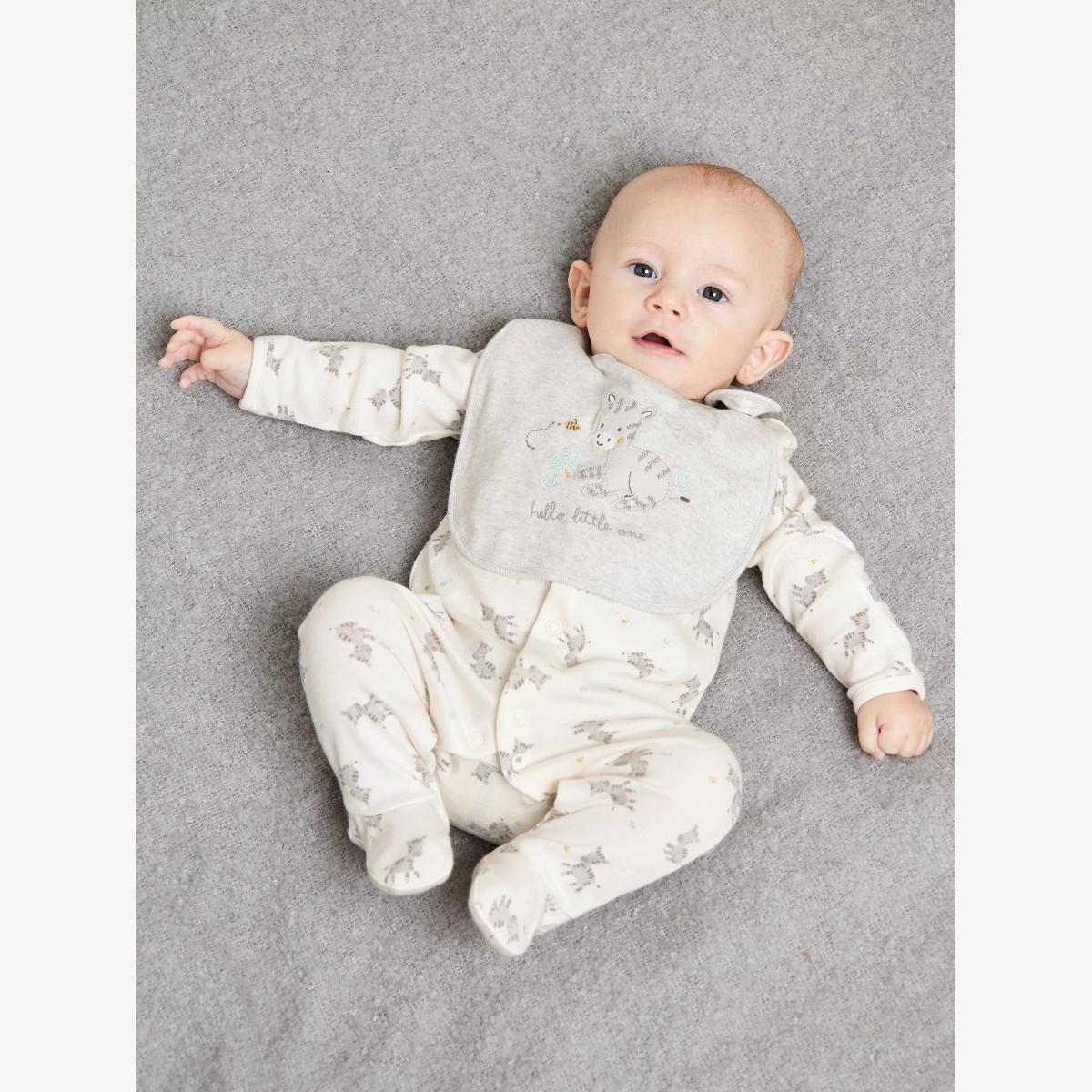 This four piece set includes an all-over print sleepsuit with a front popper opening and built in scratch mitts on smaller sizes. The long sleeve bodysuit features a shoulder popper opening and two rows of poppers at the gusset, this bodysuit is adjustable and will grow as your baby grows. The super soft bib, with adorable embroidery and a stripe hat completes the set.