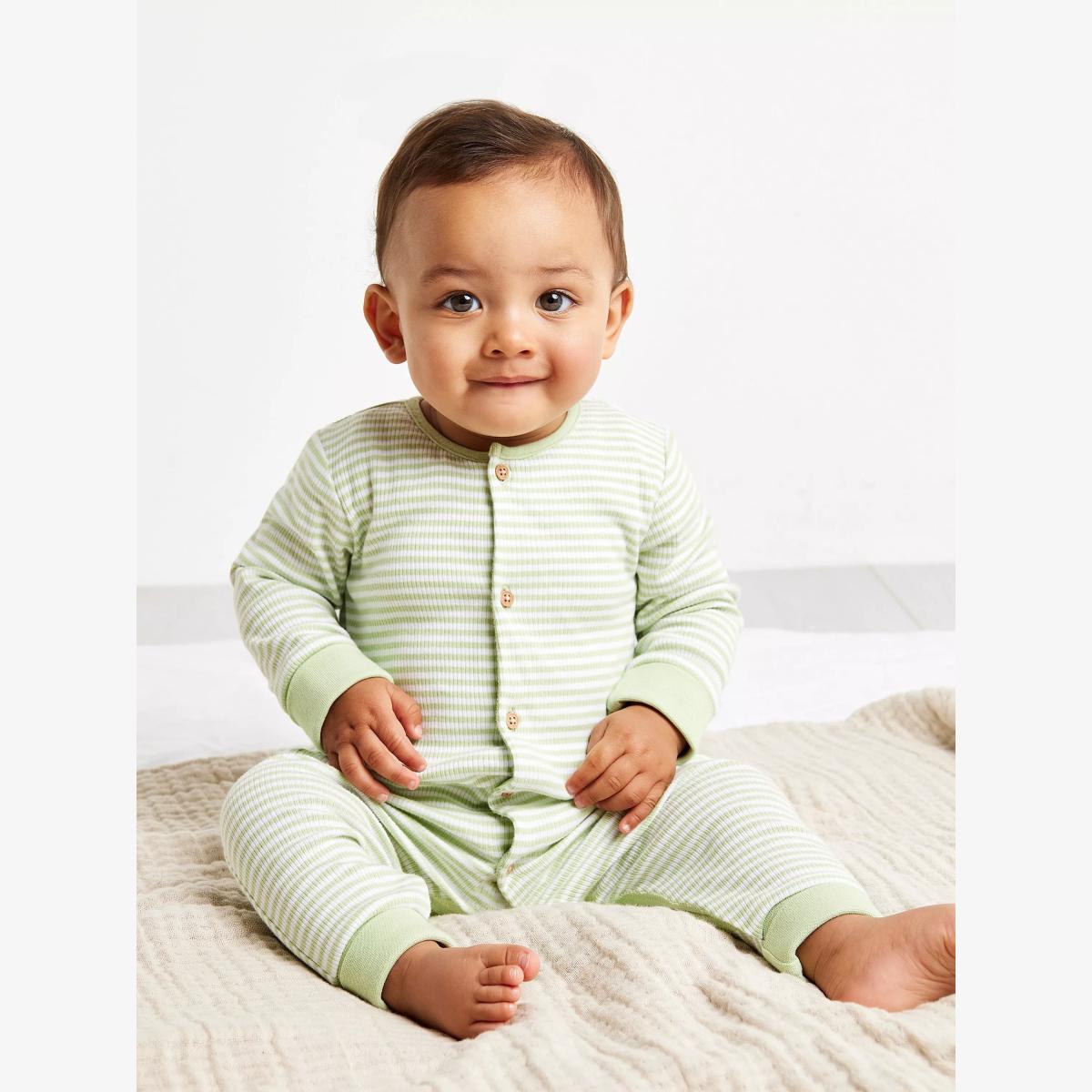 A long-sleeve, striped bodysuit, made from super-soft cotton in a ribbed texture. Promising comfort for your little one, it has wood-like buttons on the front and extra popper buttons on the gusset to help with quick changes, and the roll-up, roll-down cuffs grow as your baby grows.