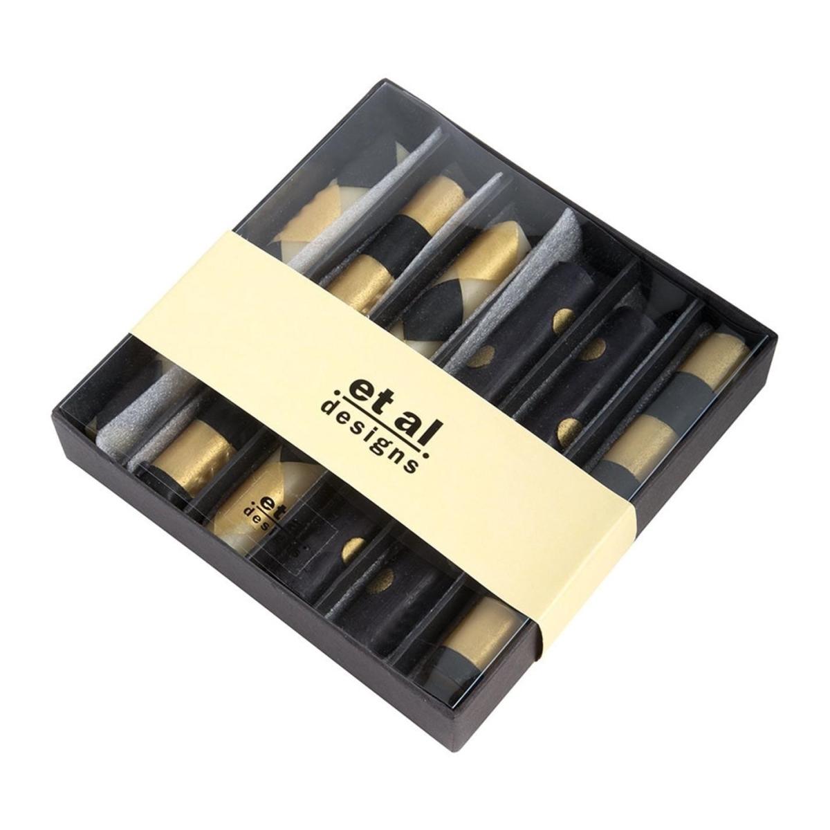 I love this set of mini dinner candles for their playful and modern design, making them a versatile addition to various interiors. They work particularly well in contemporary spaces, adding a subtle decorative touch to dinner tables or sideboards. To style them effectively, consider pairing with neutral dishware and metallic accents to enhance their black and gold detailing. They also look fantastic grouped together in elegant glass holders or vases on an open shelf. As they’re small, they’re perfect for layering within tablescapes or setting a cosy, inviting atmosphere in both casual and formal settings.