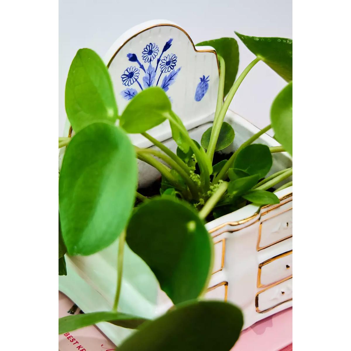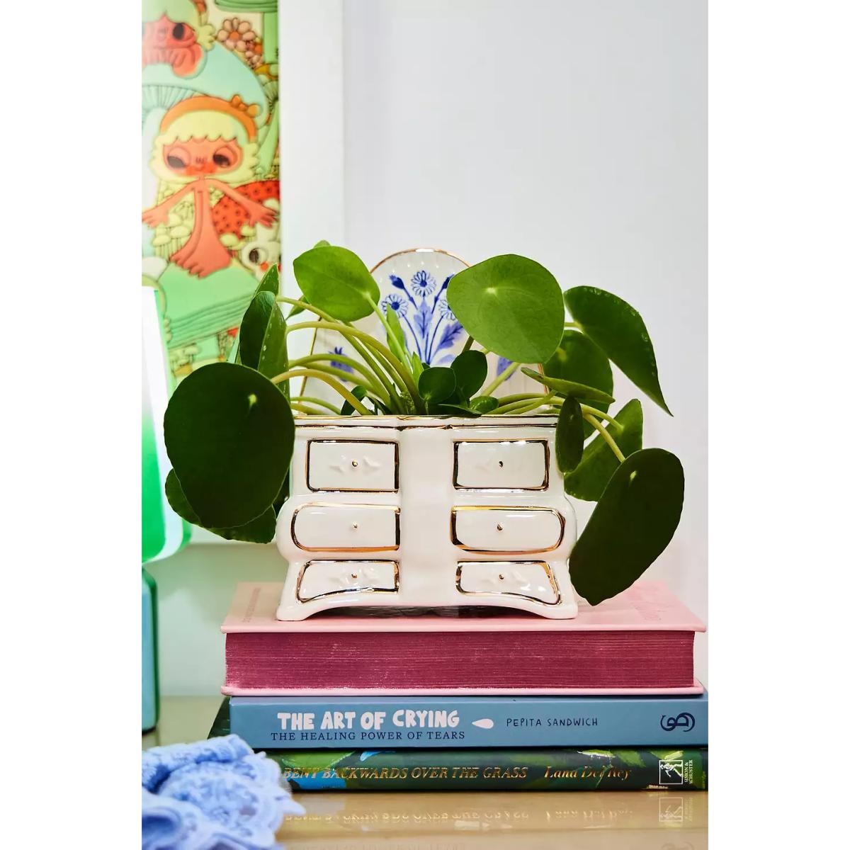Cute mini dresser planter crafted from glossy ceramic. Features a curved cream silhouette topped with gold drawer-inspired details. Functions as a plant pot with an open space for small plants or succulents, perfect for adding charm to any room. **Content + Care** \- 100% Stoneware \- Wipe clean