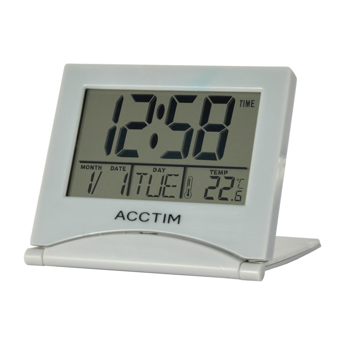 Mini Flip 2, Multi-function LCD display, with time, calendar indoor temperature. Folding travel case. Alarm with snooze.