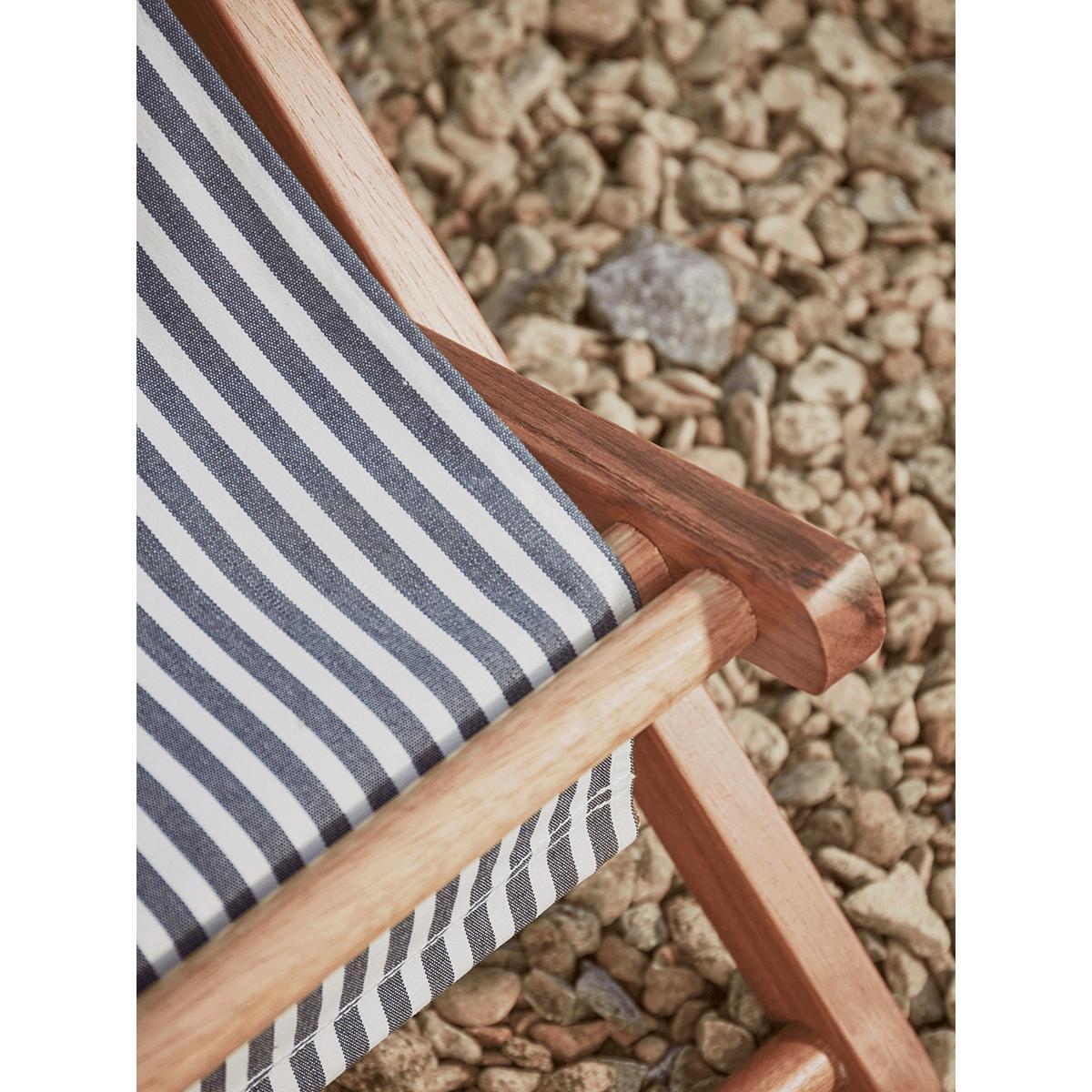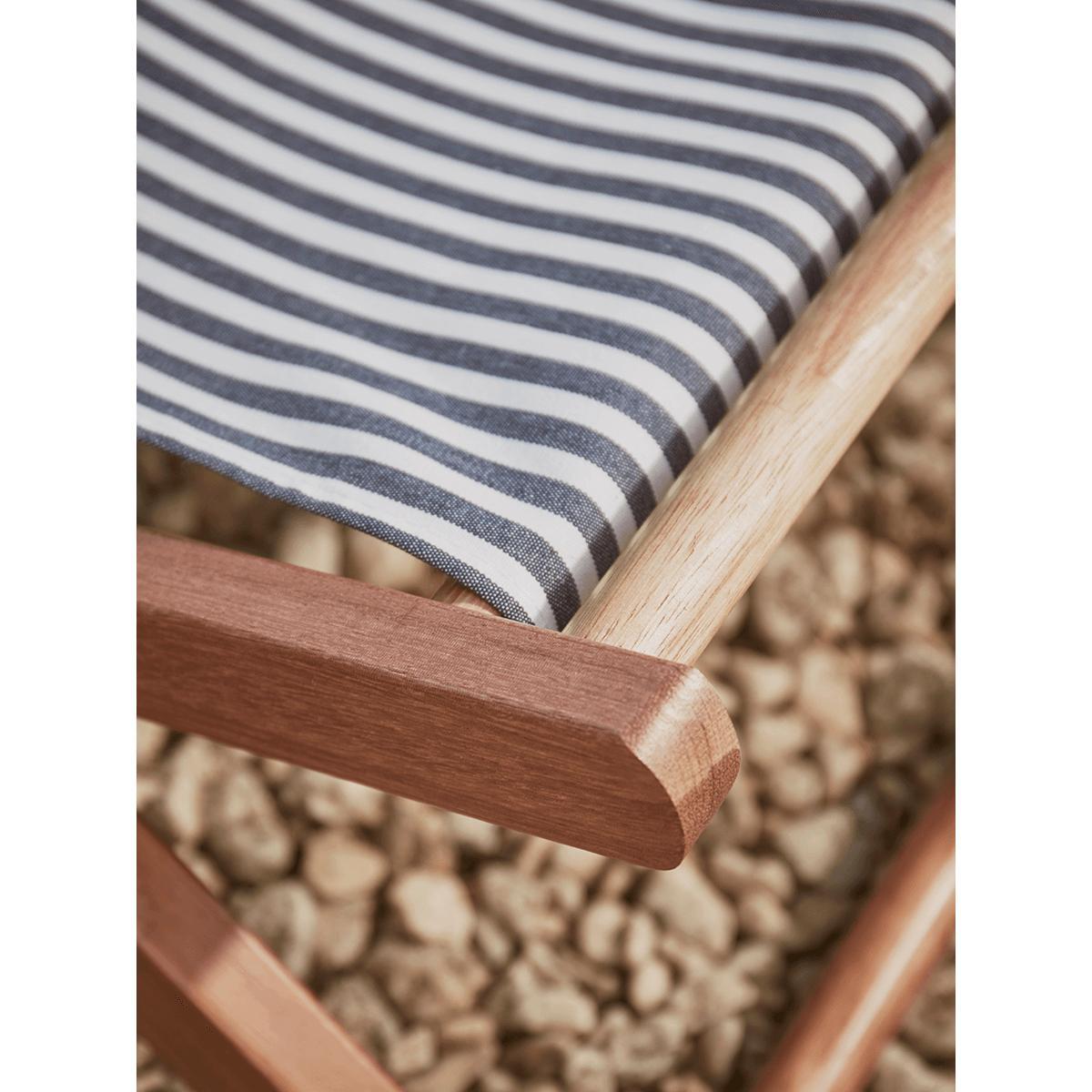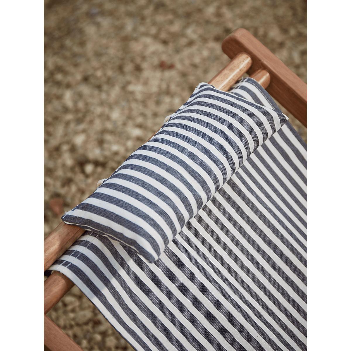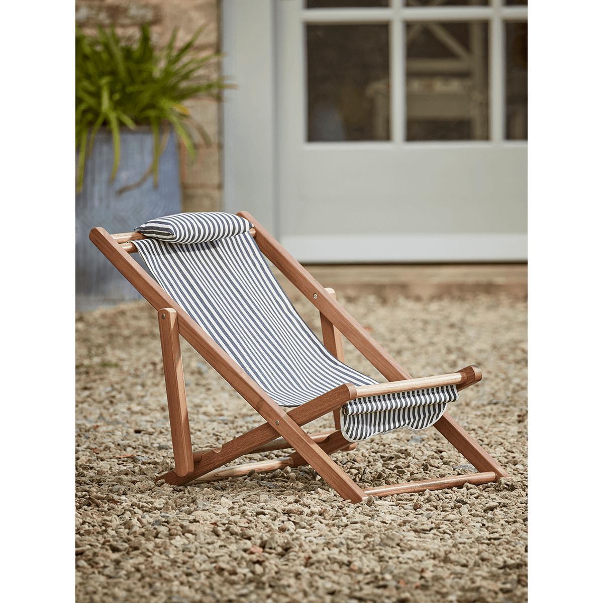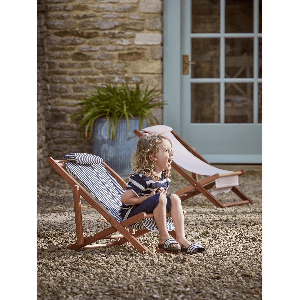 Embracing French Riviera style, but with a bohemian touch, our mini fringed deck chair will make a fabulous addition to your outdoor space and a perfect perch for your little one. Each chair has a foldable hardwood frame, with a cotton canvas seat in a soft blue stripe, pillow headrest and a cotton fringe to the bottom. Also available in a. Standard. Size.