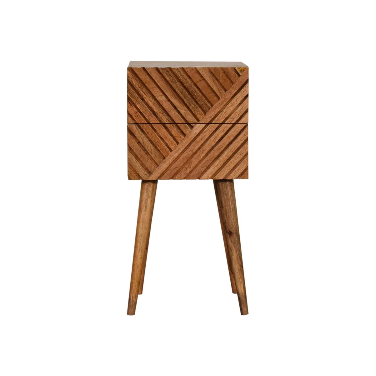 This beautifully designed bedside is constructed from 100 solid mango wood and has a fine oak-ish finish. It features 2 line carved drawers giving the piece extra character and dimension. It has 4 Scandinavian style legs to modernize your home, and can be fitted in tight compact spaces to go in any type of home interior.
