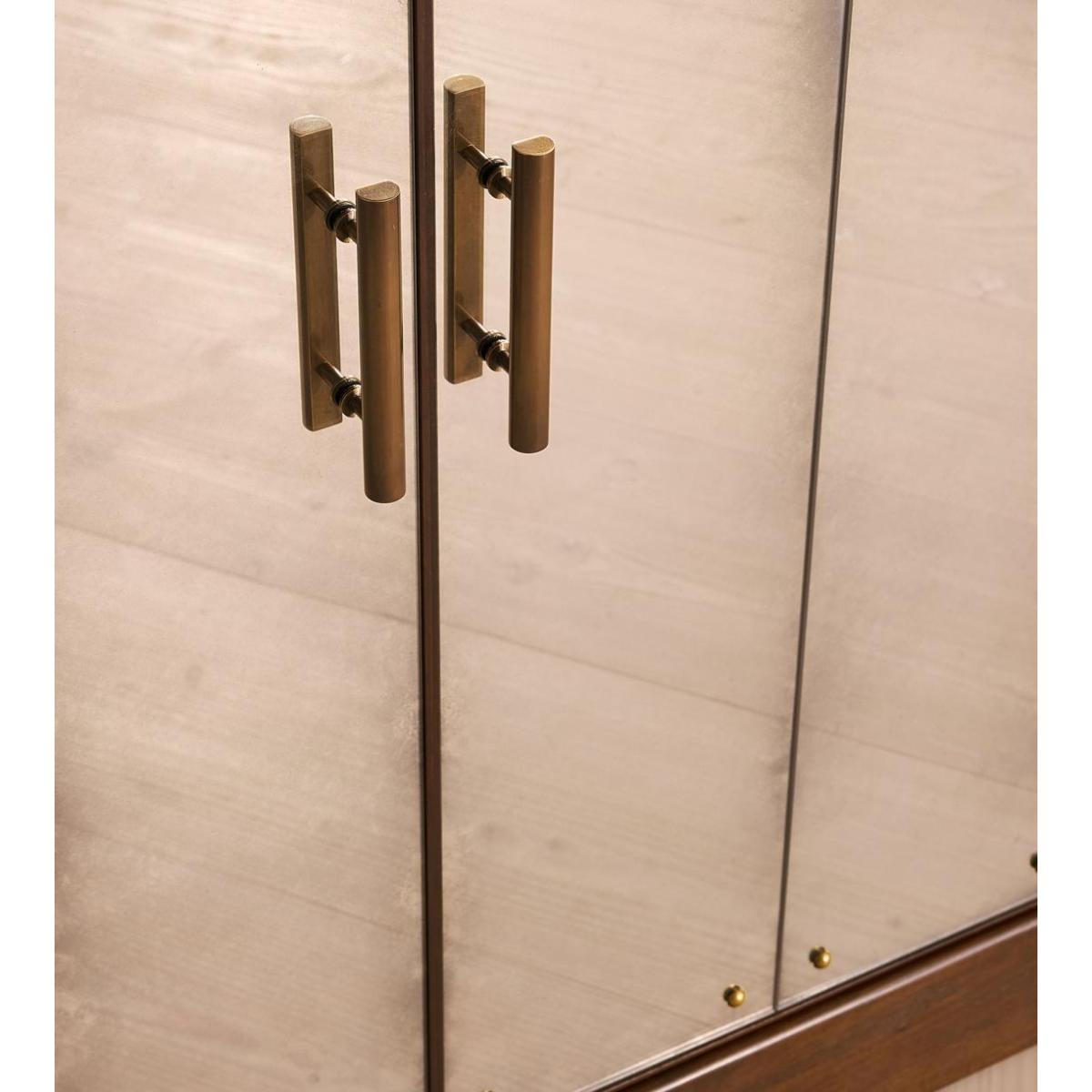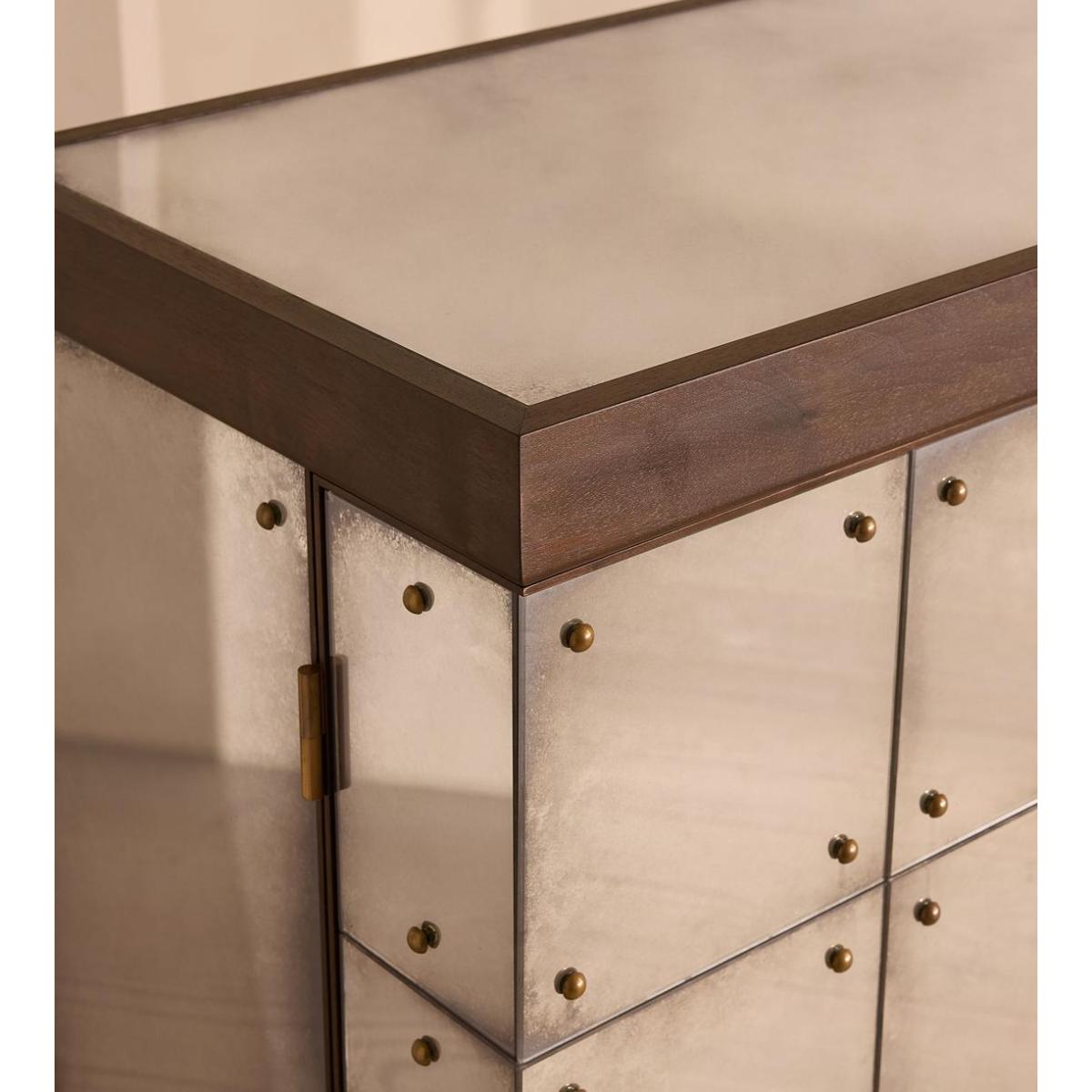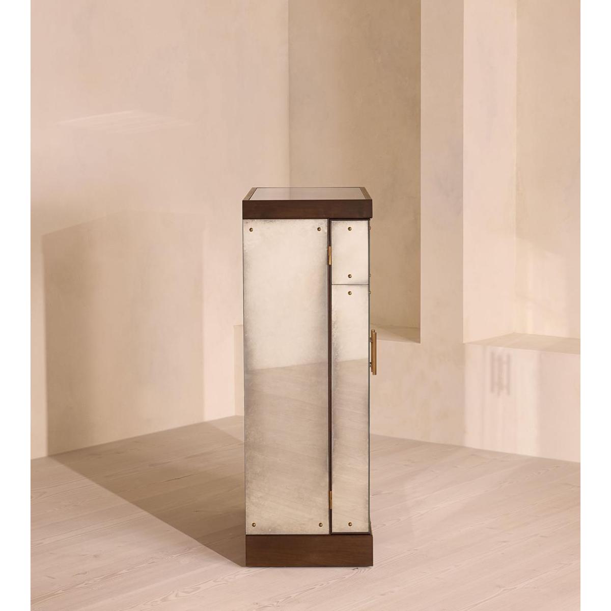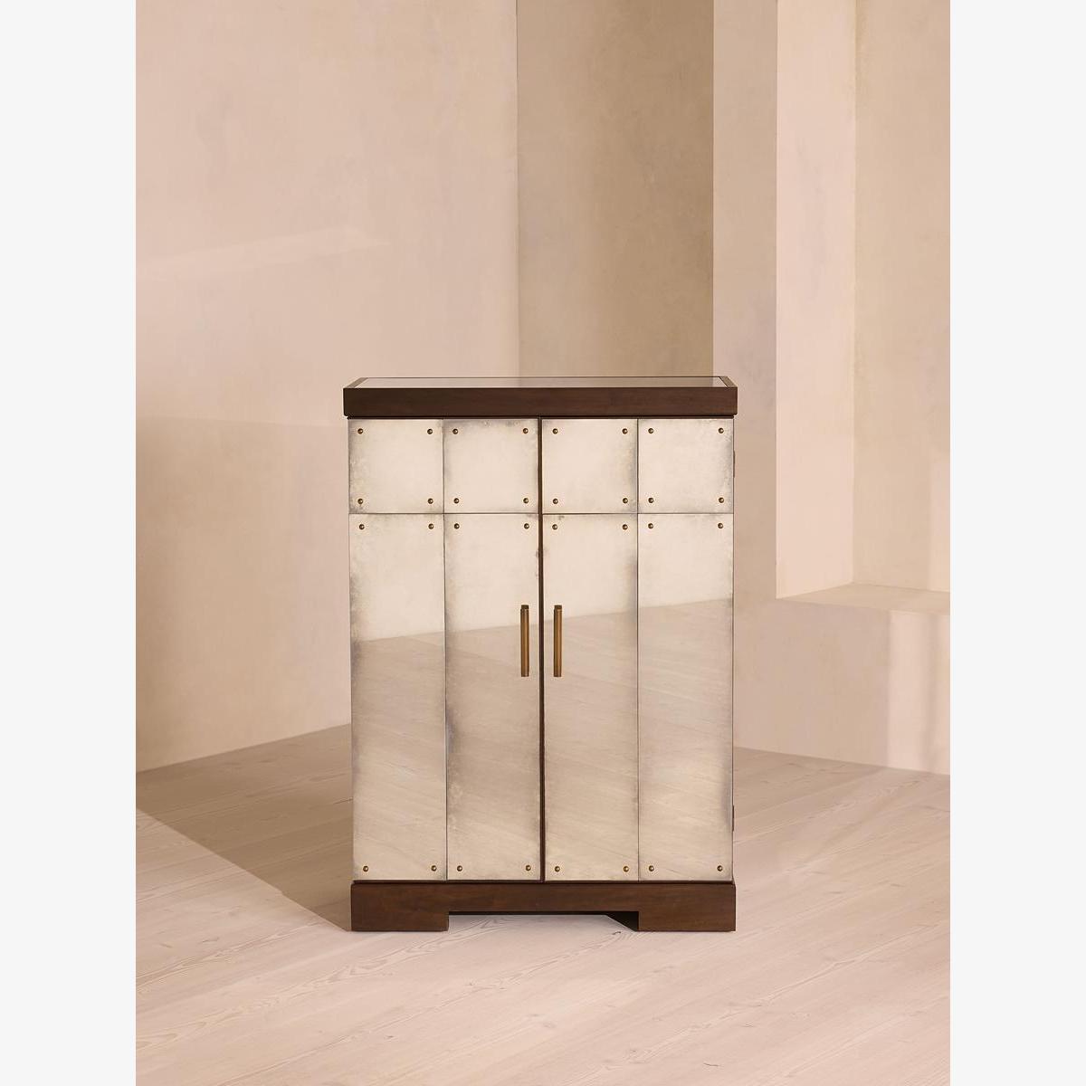 Clad in antiqued mirror glass, this compact cabinet opens to reveal a dark-stained walnut interior, lacquered and waxed for a refined finish. Inside, a black glass countertop and mirrored back reflect the considered design details. Two adjustable shelves and brass gallery rails fitted to each door offer practical storage. Originally created by Rupert Bevan for the penthouse at Soho Beach House Miami, this piece has been reworked exclusively for Soho Home.