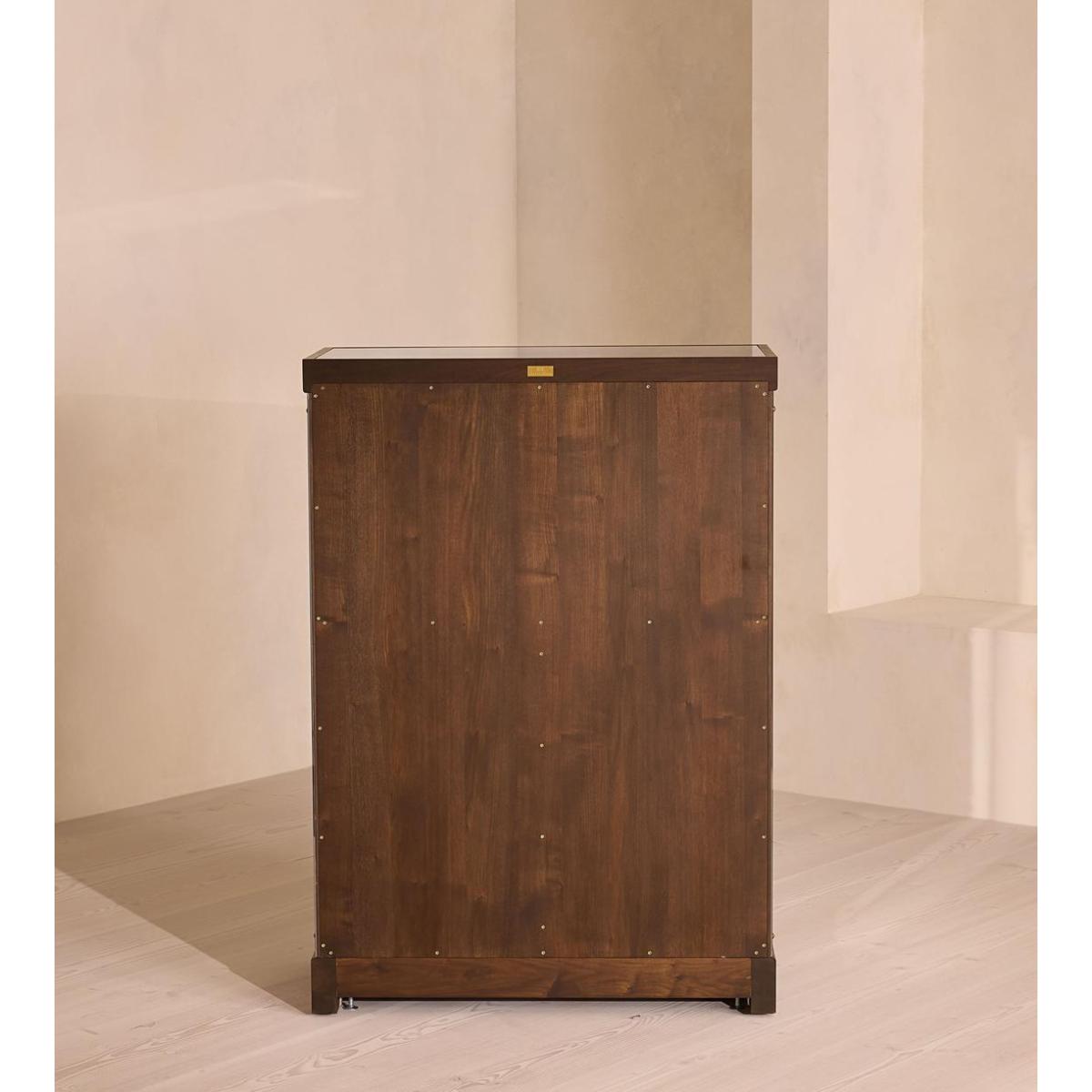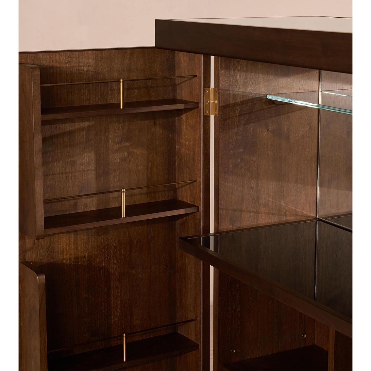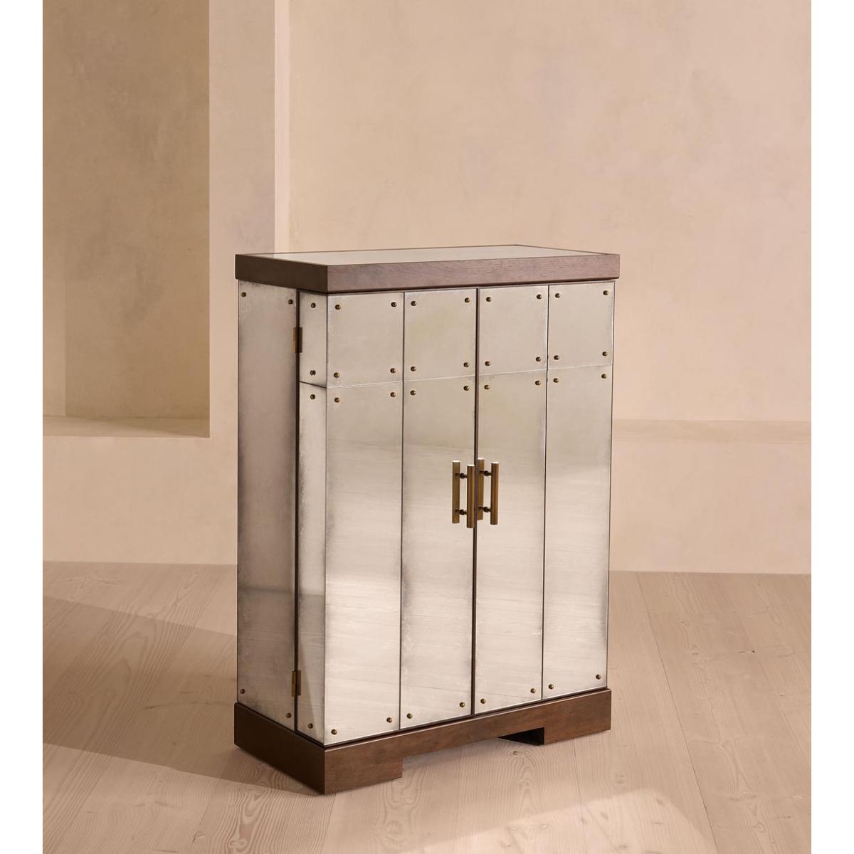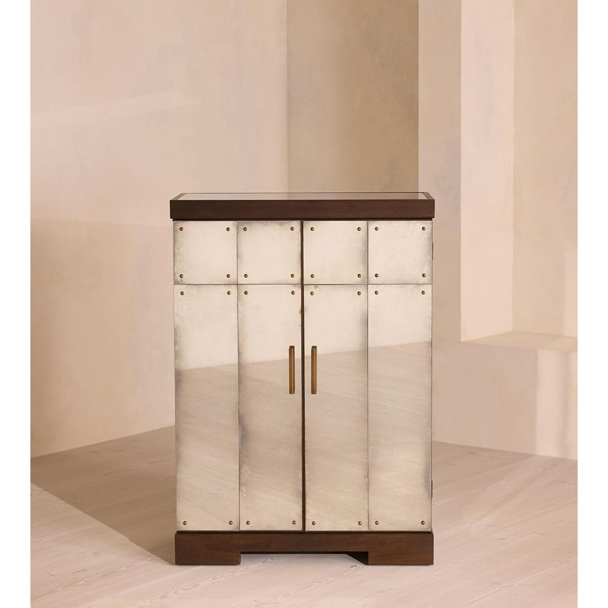Clad in antiqued mirror glass, this compact cabinet opens to reveal a dark-stained walnut interior, lacquered and waxed for a refined finish. Inside, a black glass countertop and mirrored back reflect the considered design details. Two adjustable shelves and brass gallery rails fitted to each door offer practical storage. Originally created by Rupert Bevan for the penthouse at Soho Beach House Miami, this piece has been reworked exclusively for Soho Home.