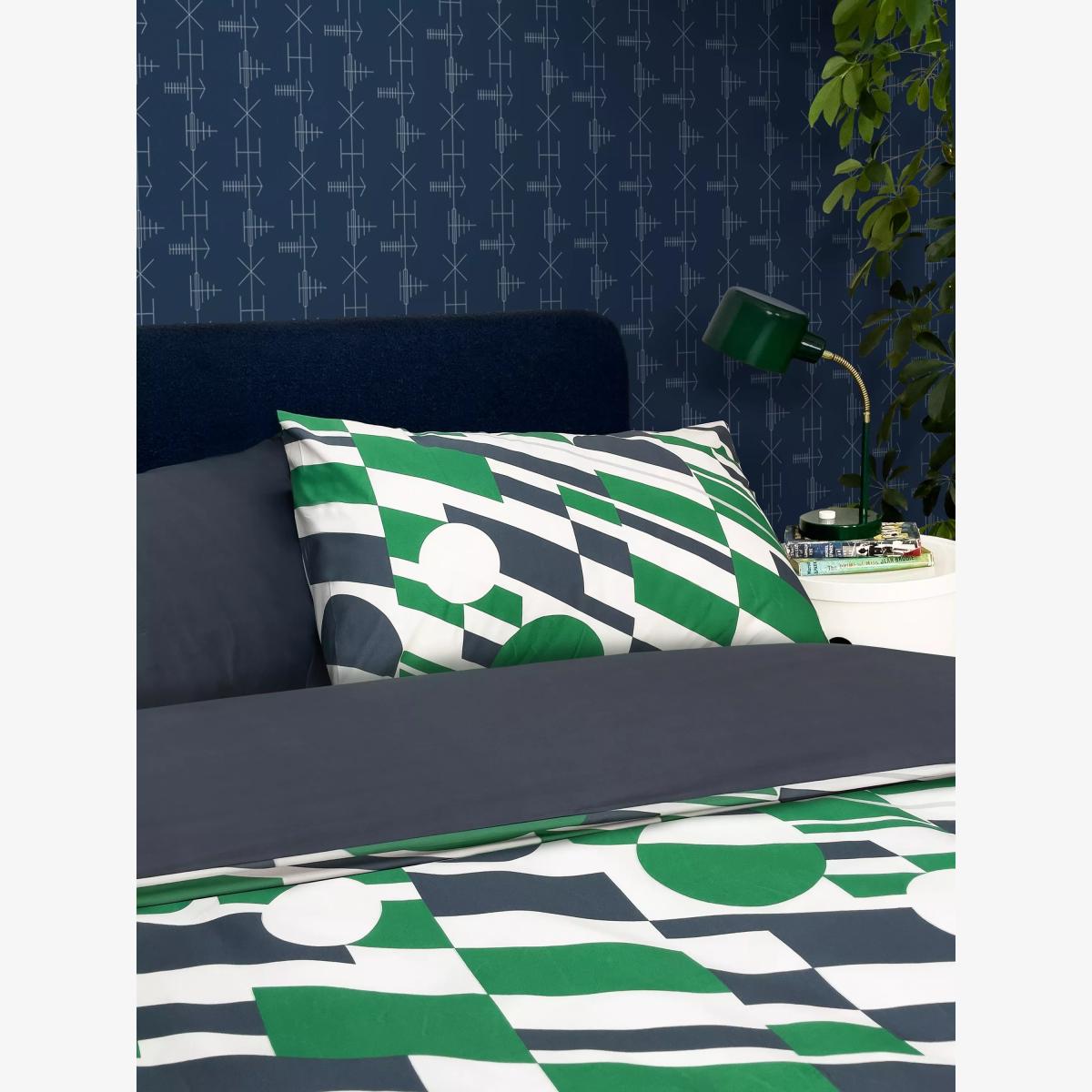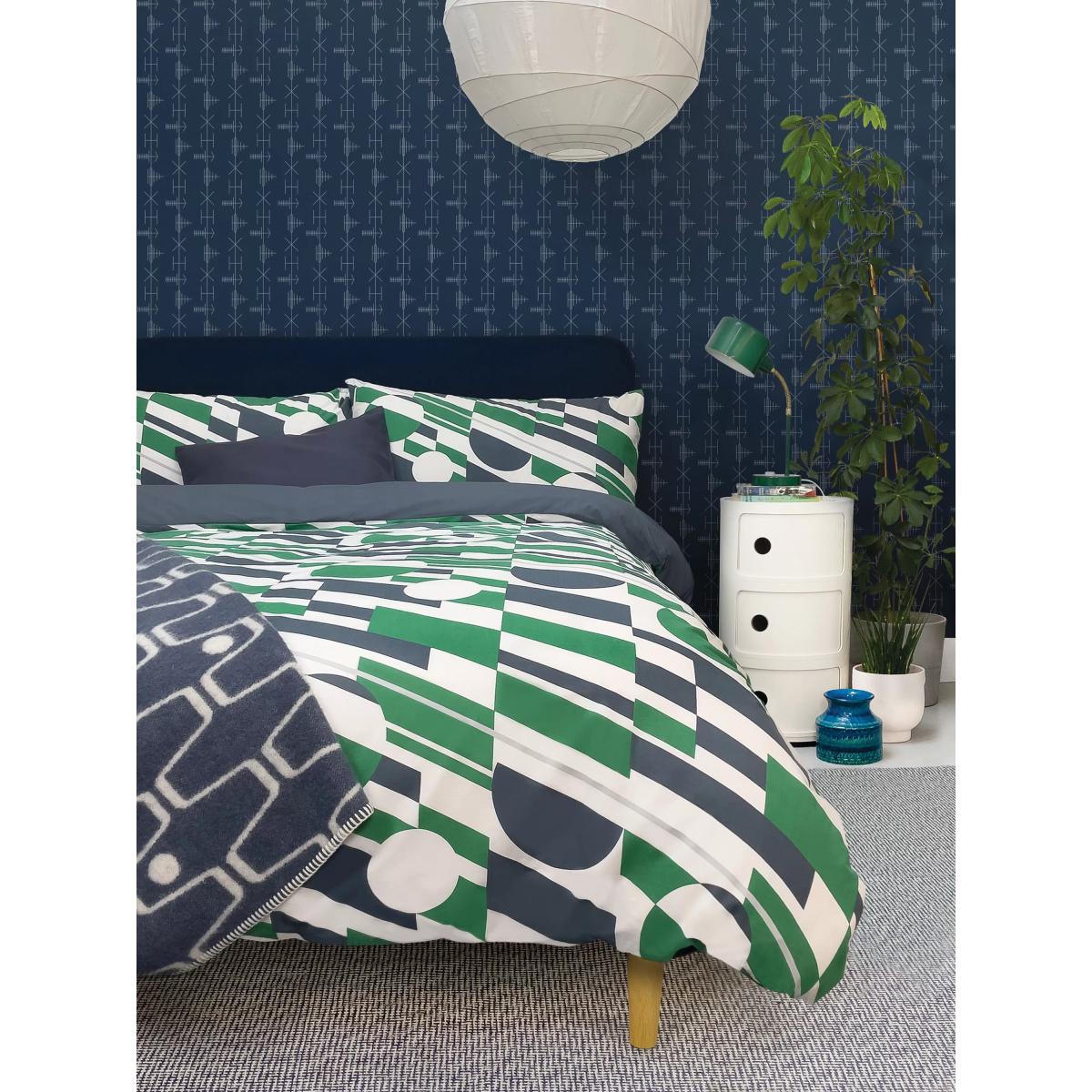 A key feature of the Mini Moderns Hinterland collection, the bold geometry of this pattern echos naval "dazzle" camouflage. The design features circular motifs, based on the Dungeness Sound Mirrors. The single set comes with one standard pillowcase. All other sizes come with two standard pillowcases. Bedding sizes To fit duvet/pillow size (cm) Standard pillowcase, L75 x W50cm Single duvet cover, L200 x W135cm Double duvet cover, L200 x W200cm King duvet cover, L220 x W225cm Super king duvet cover, L220 x W260cm