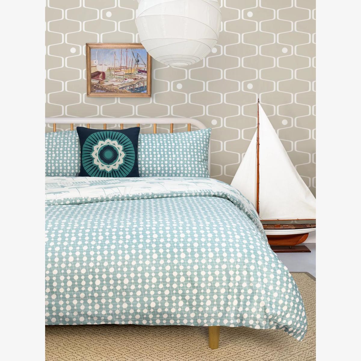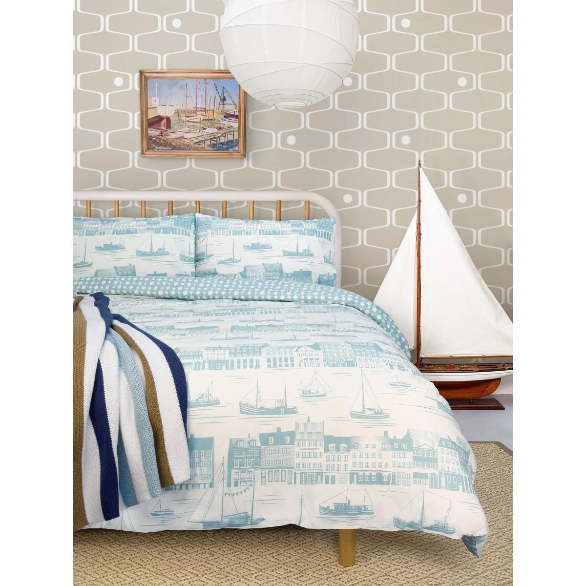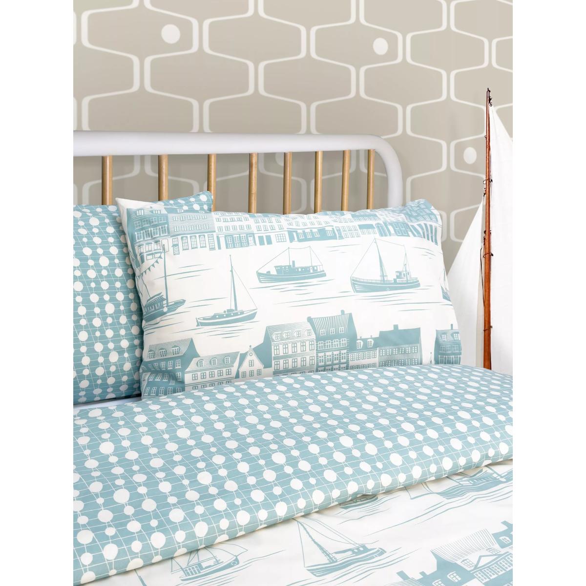 This charming nautical scene celebrates Mini Moderns' designers, Mark and Keith's first visit to Copenhagen's bustling Nyhavn district, with boats sailing past its colourful historic townhouses. The single set comes with one standard pillowcase. All other sizes come with two standard pillowcases. Bedding sizes To fit duvet/pillow size (cm) Standard pillowcase, L75 x W50cm Single duvet cover, L200 x W135cm Double duvet cover, L200 x W200cm King duvet cover, L220 x W225cm Super king duvet cover, L220 x W260cm