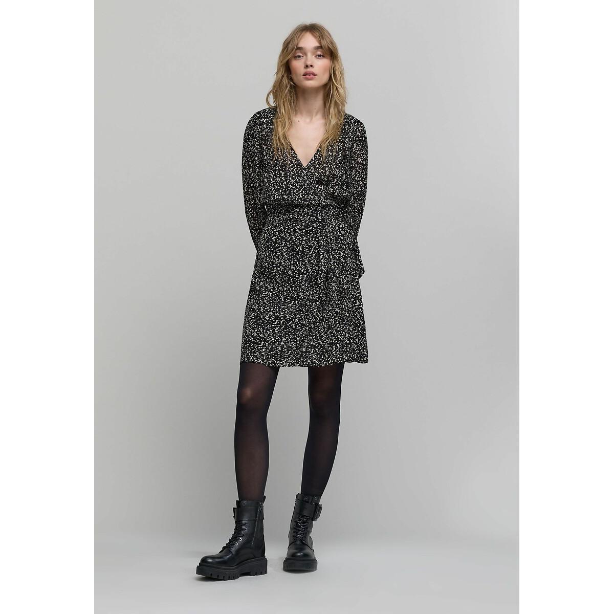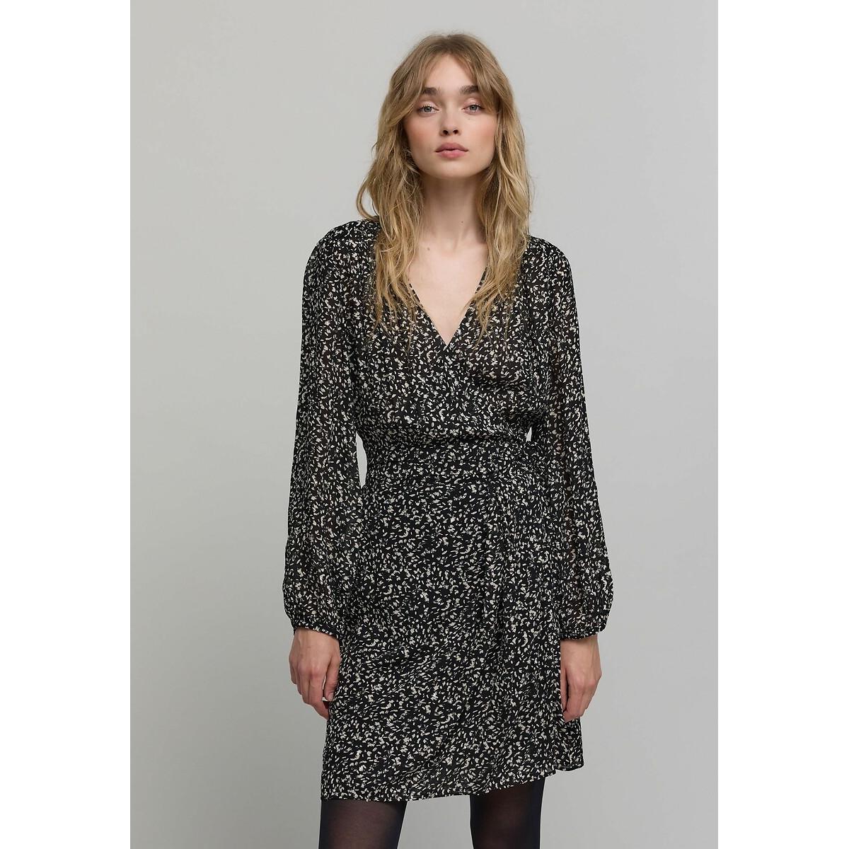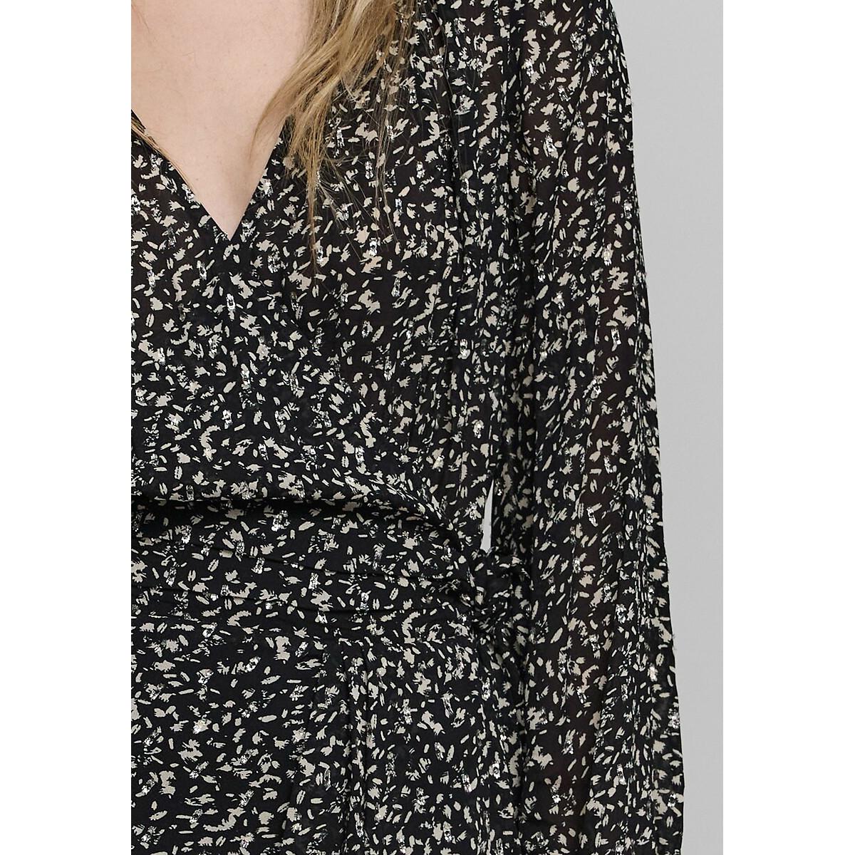 Long sleeve printed wrapover dress. This mini dress in fabulously lightweight viscose voile features a crossover neckline and comes in a brand exclusive tachist print, highlighted by silver metallic accents. Product details • Style: wrapover • Mini • Long sleeves • Crew neck • Graphic print • Seaming at the waist with pleats at the front and smocking at the back • Concealed press-stud fastening • Side tie fastening • Length of dress: 94cm for a size 08. Fabric content and care advice • 100% viscose • Please refer to the care instructions on the product label