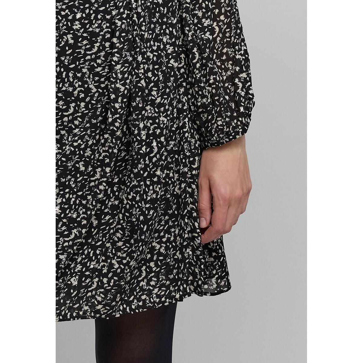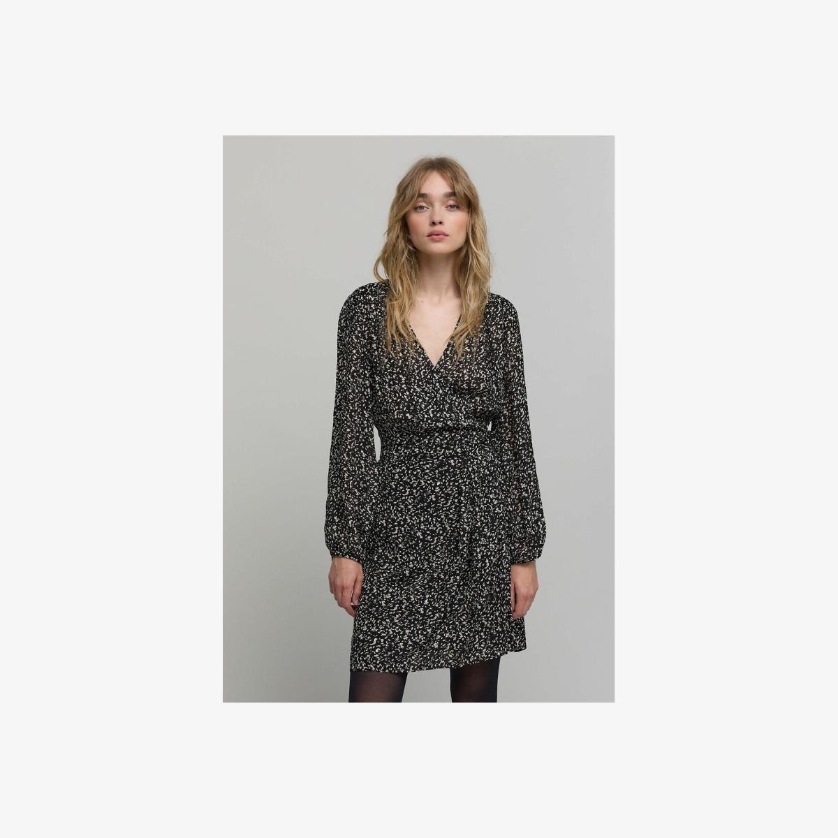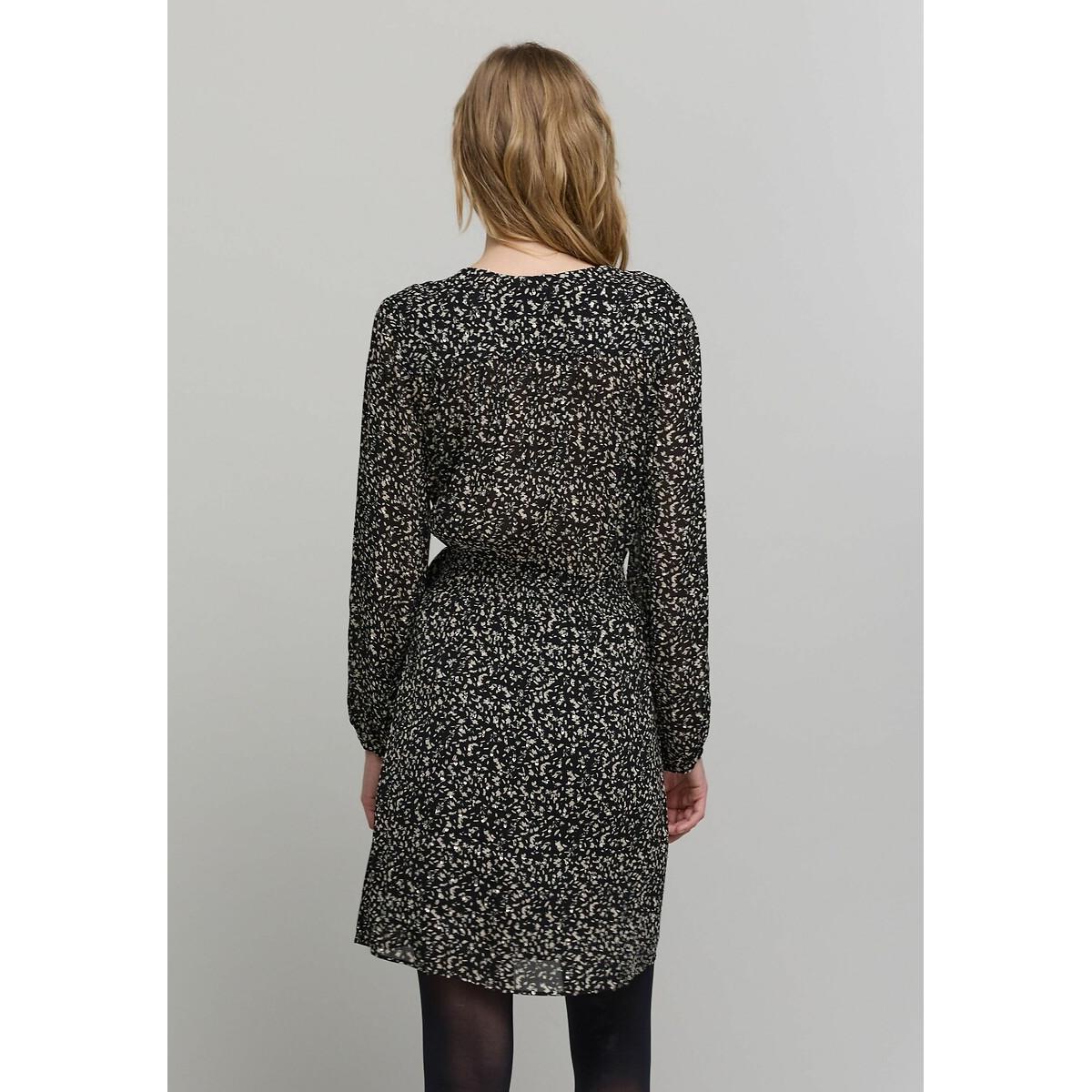 Long sleeve printed wrapover dress. This mini dress in fabulously lightweight viscose voile features a crossover neckline and comes in a brand exclusive tachist print, highlighted by silver metallic accents. Product details • Style: wrapover • Mini • Long sleeves • Crew neck • Graphic print • Seaming at the waist with pleats at the front and smocking at the back • Concealed press-stud fastening • Side tie fastening • Length of dress: 94cm for a size 08. Fabric content and care advice • 100% viscose • Please refer to the care instructions on the product label