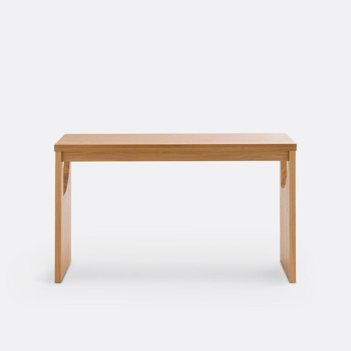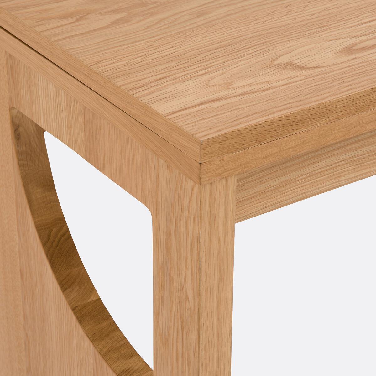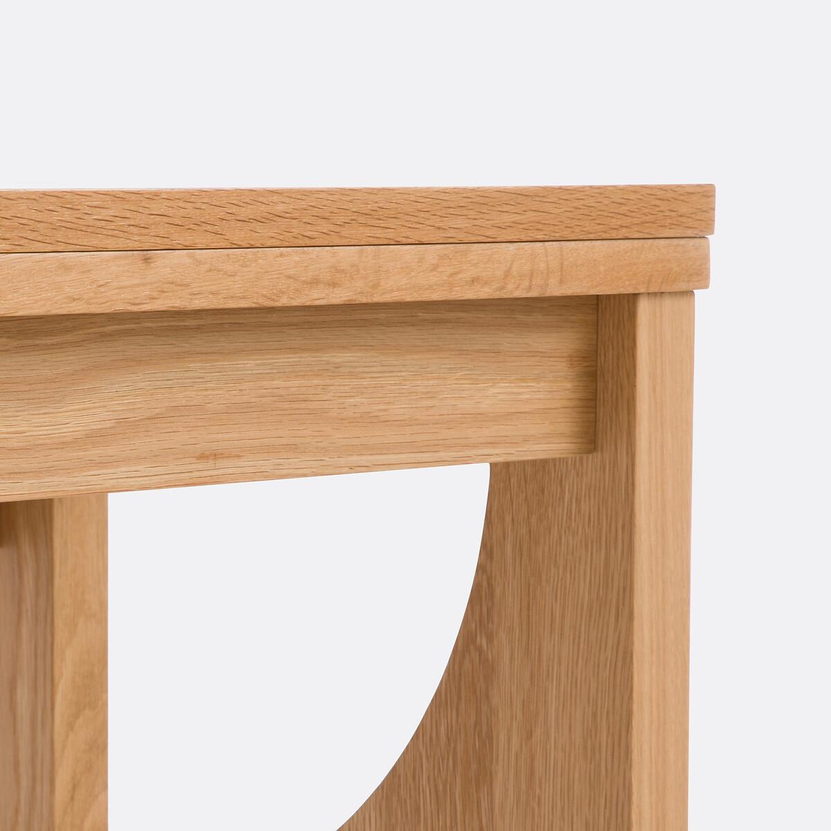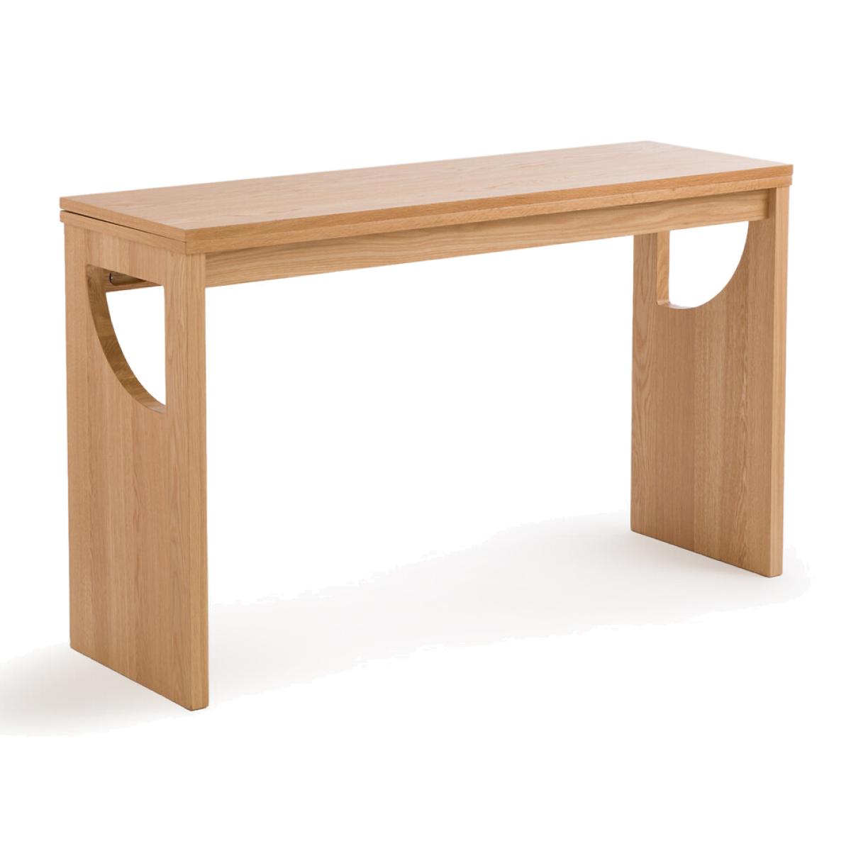 The Minimal flexi console is part of our Les Ingénieux collection. Creations full of ideas to make life simpler and everyday life more beautiful, imagined by our designers in France.. Minimalist and sculptural design, Nordic spirit and a contemporary style: the Minimal console table is perfect for saving square metres in a small area. Why you'll love it • Foldable: go from a console to a side table in no time • An openwork and graphic base: for an original design. Product Details • Console converts into a table for 2 to 4 people • Top and legs in light oak veneered MDF • Solid oak rail • Polyurethane varnish finish top • Legs with a nitrocellulose varnish finishDimensions. Console shape • Width: 130cm • Height: 77cm • Depth: 40cm. Table shape • Width: 130cm • Height: 77cm • Depth: 80cmDelivery:. Assembly required. Available for home delivery. Dimensions and weight of parcel1 parcel • L140 x H30 x D50cm. 38kg