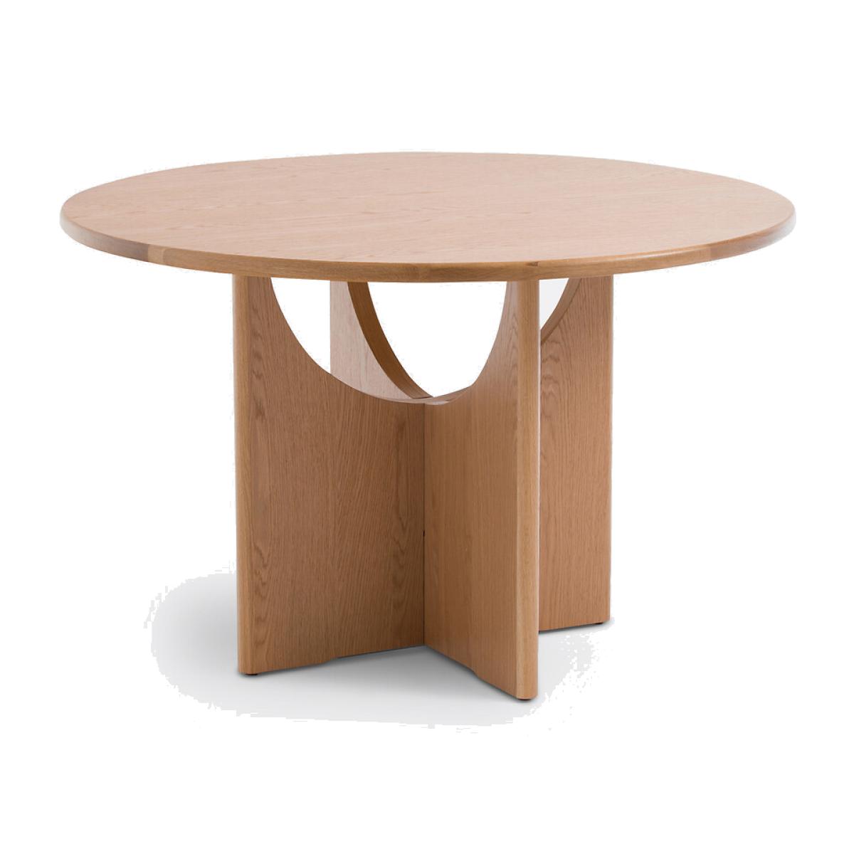 Between simple natural design and sophistication... This superb table has been imagined by our designers at La Redoute Interiors. Like a sculpture, Minimal works with any atmosphere. Product Details • Top and legs in oak veneered MDF, clear nitrocellulose varnish finish • Top edge and rounded base edges in solid oak • Plastic feet pads • Seats 4-6 people. Dimensions • Diameter: 120cm • Height: 75cm • Table top thickness: 3cm/1" • Base leg thickness: 4cm/1.5"Delivery:This product will be sold ready to assemble. It will be delivered to your home, by appointment. Note! Please check that all access points are large enough to accommodate your delivery (doors, stairs, lifts) • WOOD FROM SUSTAINABLY MANAGED FORESTS. FSC® certified wood comes from forests that are environmentally, socially and economically well managed. Dimensions and weight of parcel:2 parcels • L130 x H11 x D130cm. 35kg • L84.5 x H13.5 x D76.5cm. 26kg