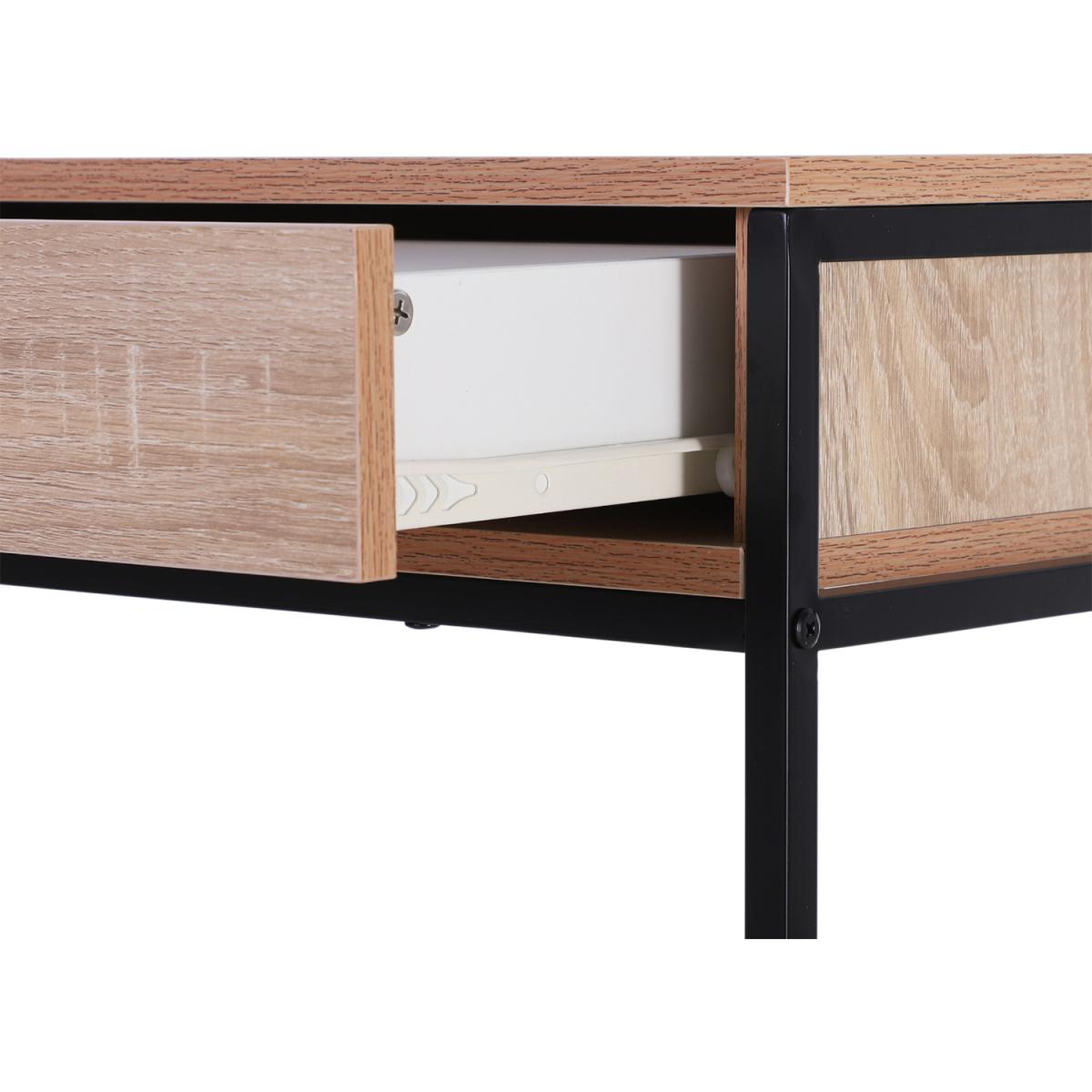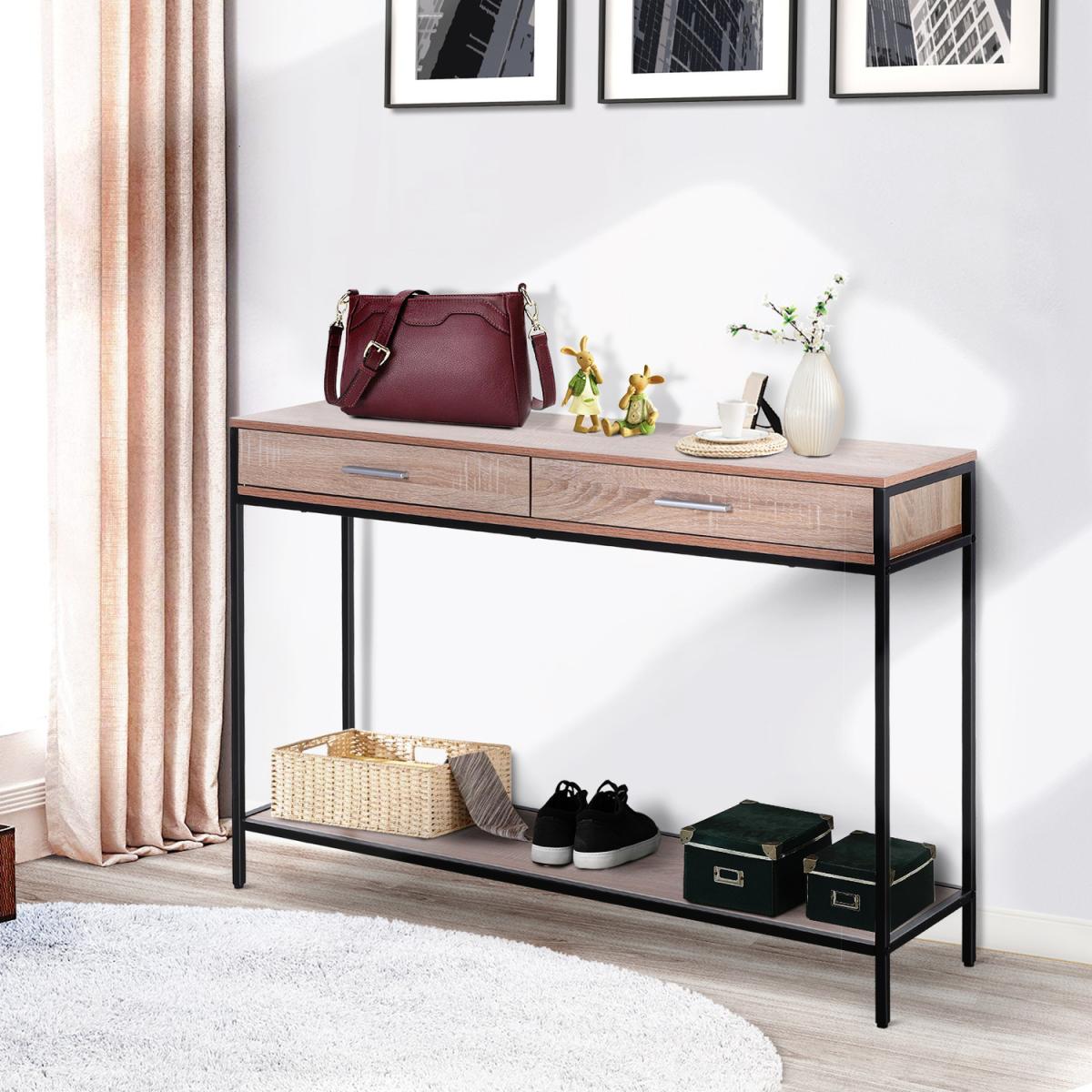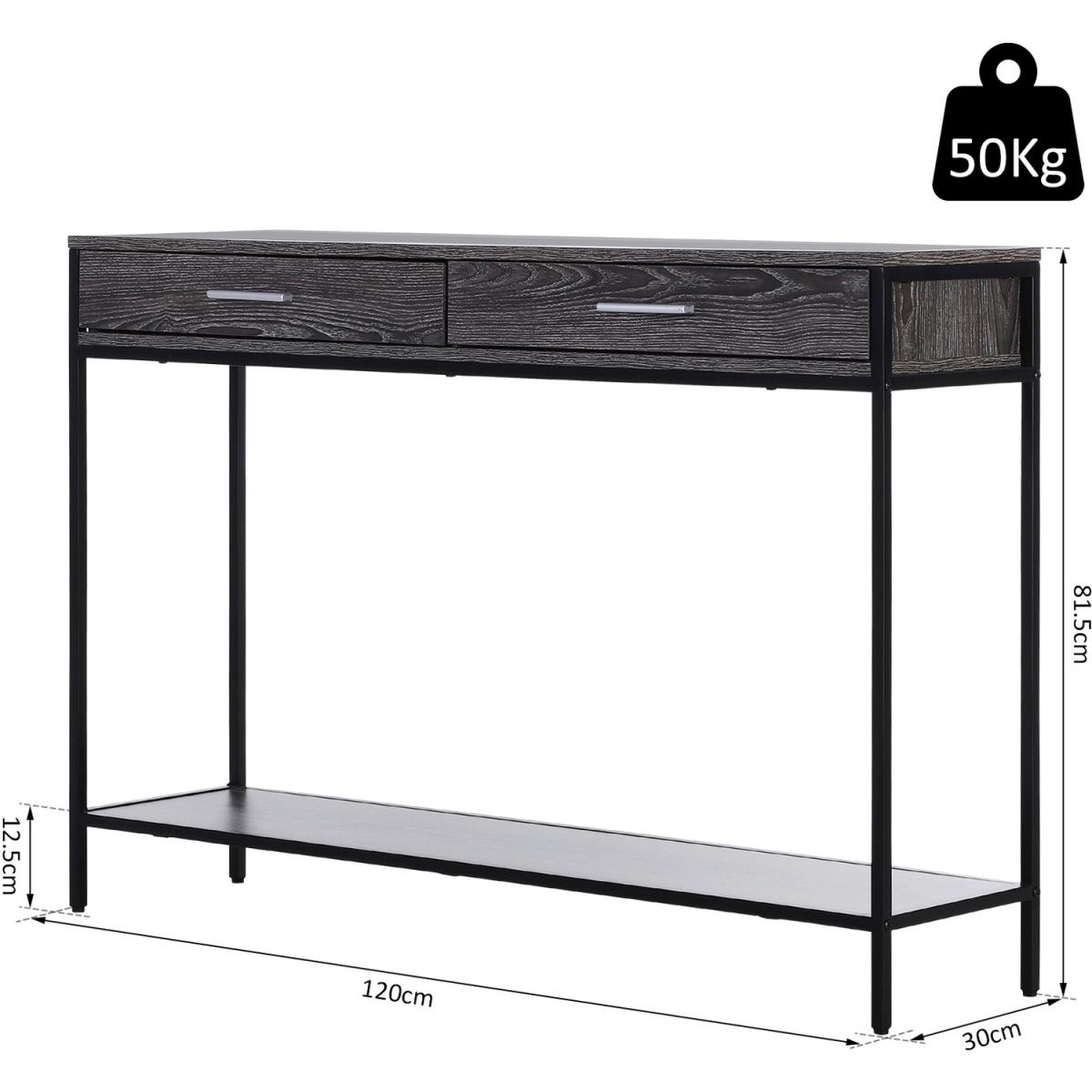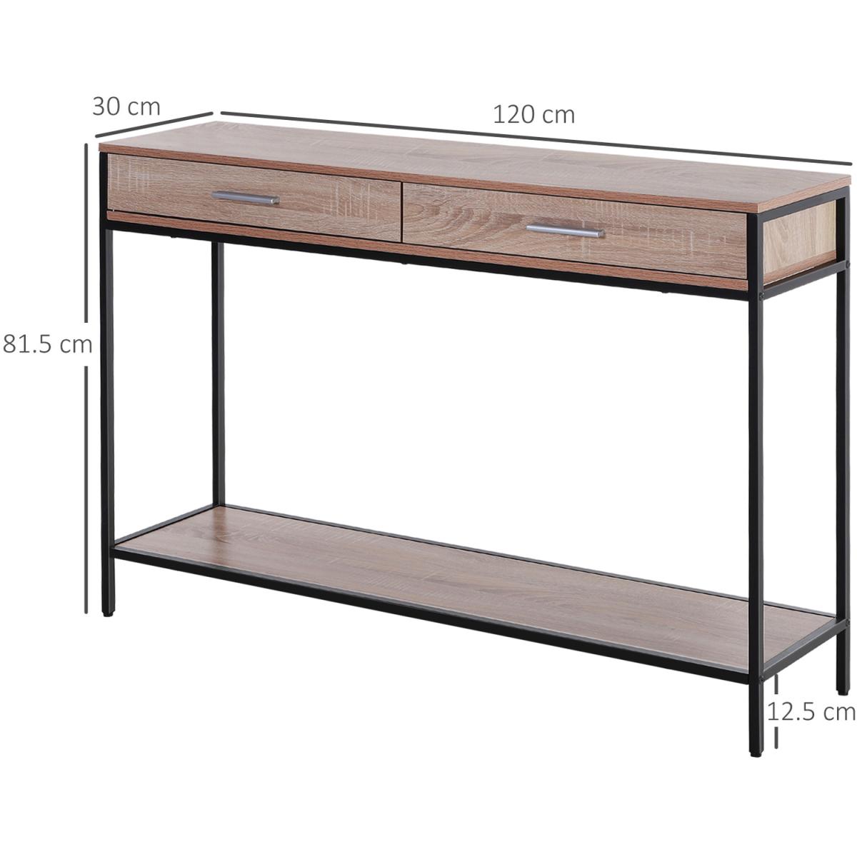Blending style and storage together, this industrial console table from HOMCOM is a distinctive piece of furniture you'll love having at home from the start. Crafted from high-quality particle board, it has been made with strength and durability in mind to provide you years of use, with a solid steel frame that keeps it upright and stable on the ground. Spacious in design, it features two slide-out drawers and a spacious top and bottom table, making it suitable for use all around the home and making it easy for you to keep your space tidy. Finished in a smooth oak wood tone design, it can be cleaned and kept beautiful with just the wipe of a cloth. Now you just have to decide where to put it.