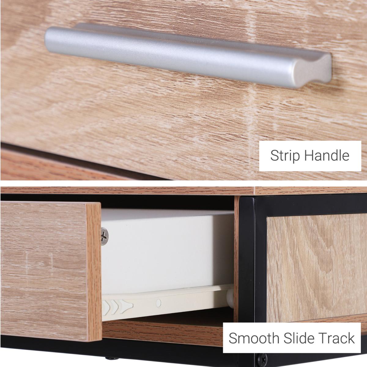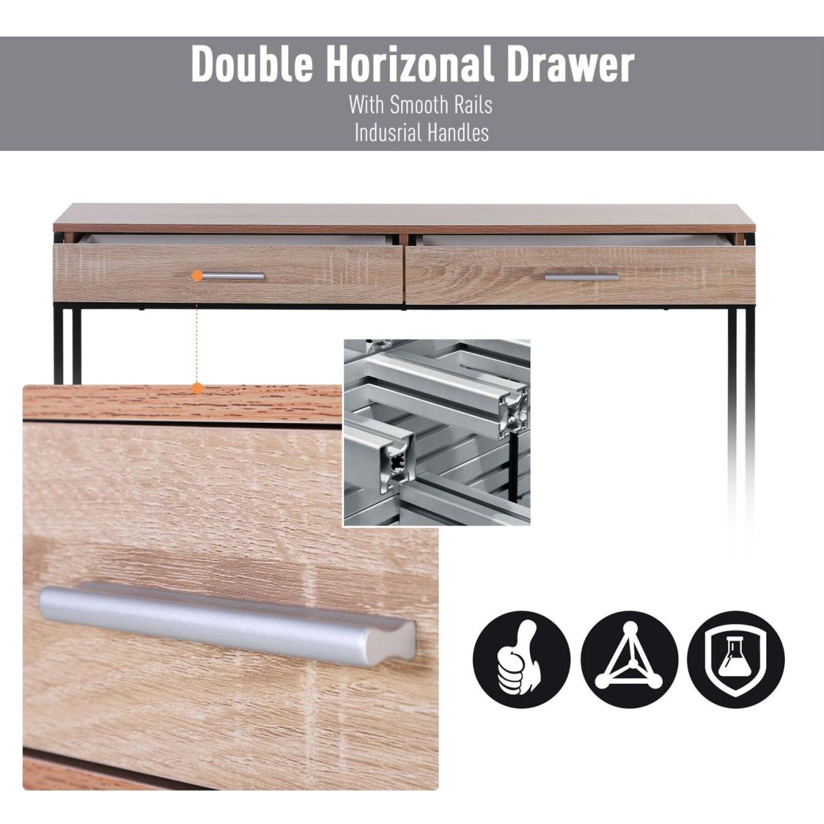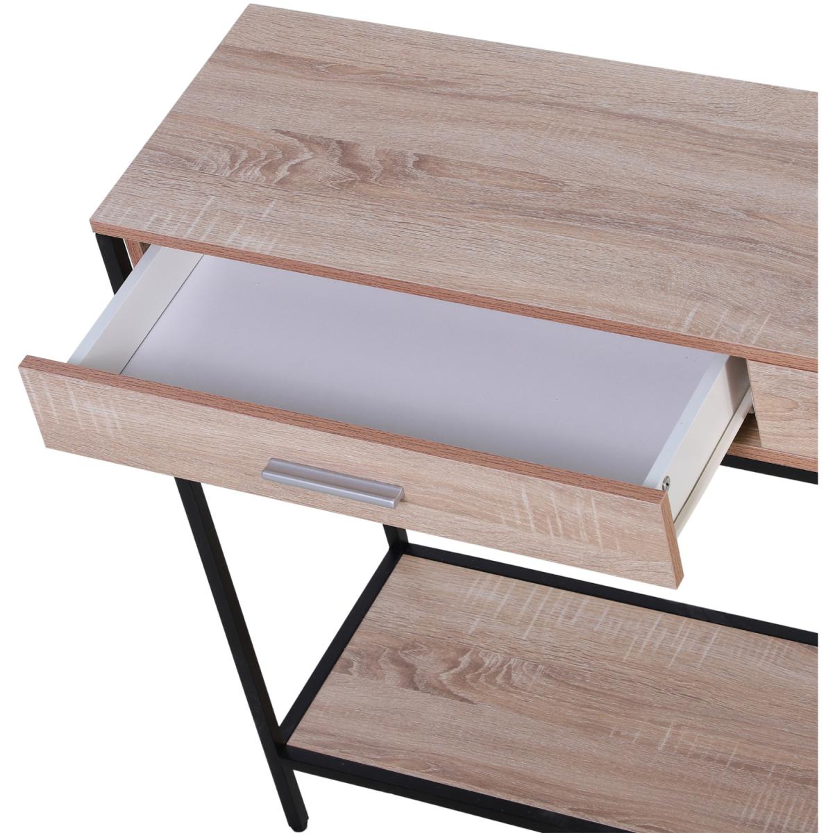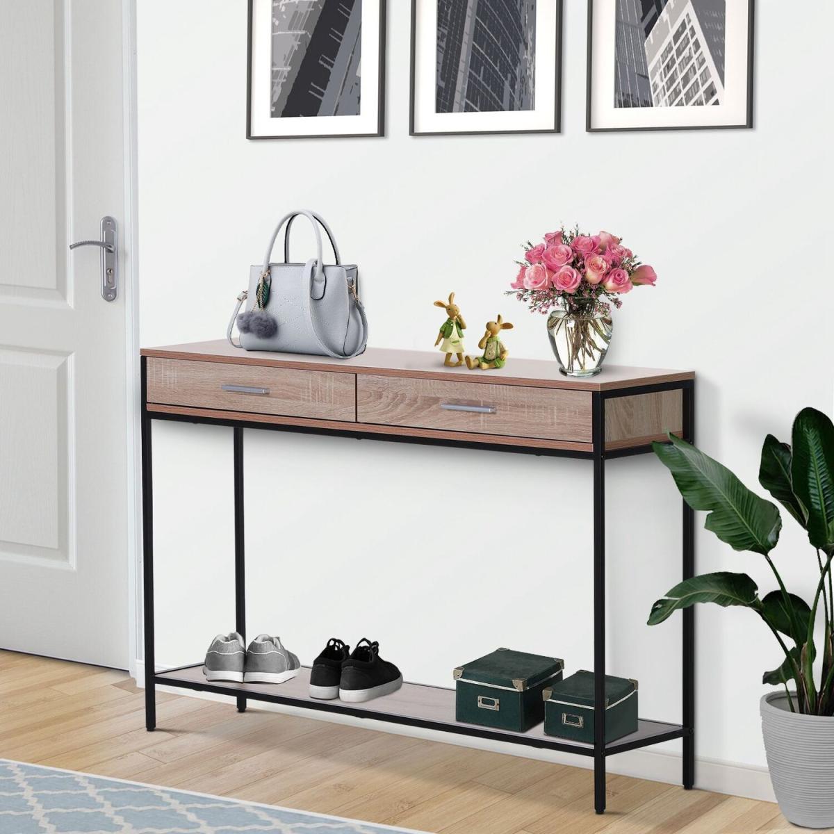 Blending style and storage together, this industrial console table from HOMCOM is a distinctive piece of furniture you'll love having at home from the start. Crafted from high-quality particle board, it has been made with strength and durability in mind to provide you years of use, with a solid steel frame that keeps it upright and stable on the ground. Spacious in design, it features two slide-out drawers and a spacious top and bottom table, making it suitable for use all around the home and making it easy for you to keep your space tidy. Finished in a smooth oak wood tone design, it can be cleaned and kept beautiful with just the wipe of a cloth. Now you just have to decide where to put it.