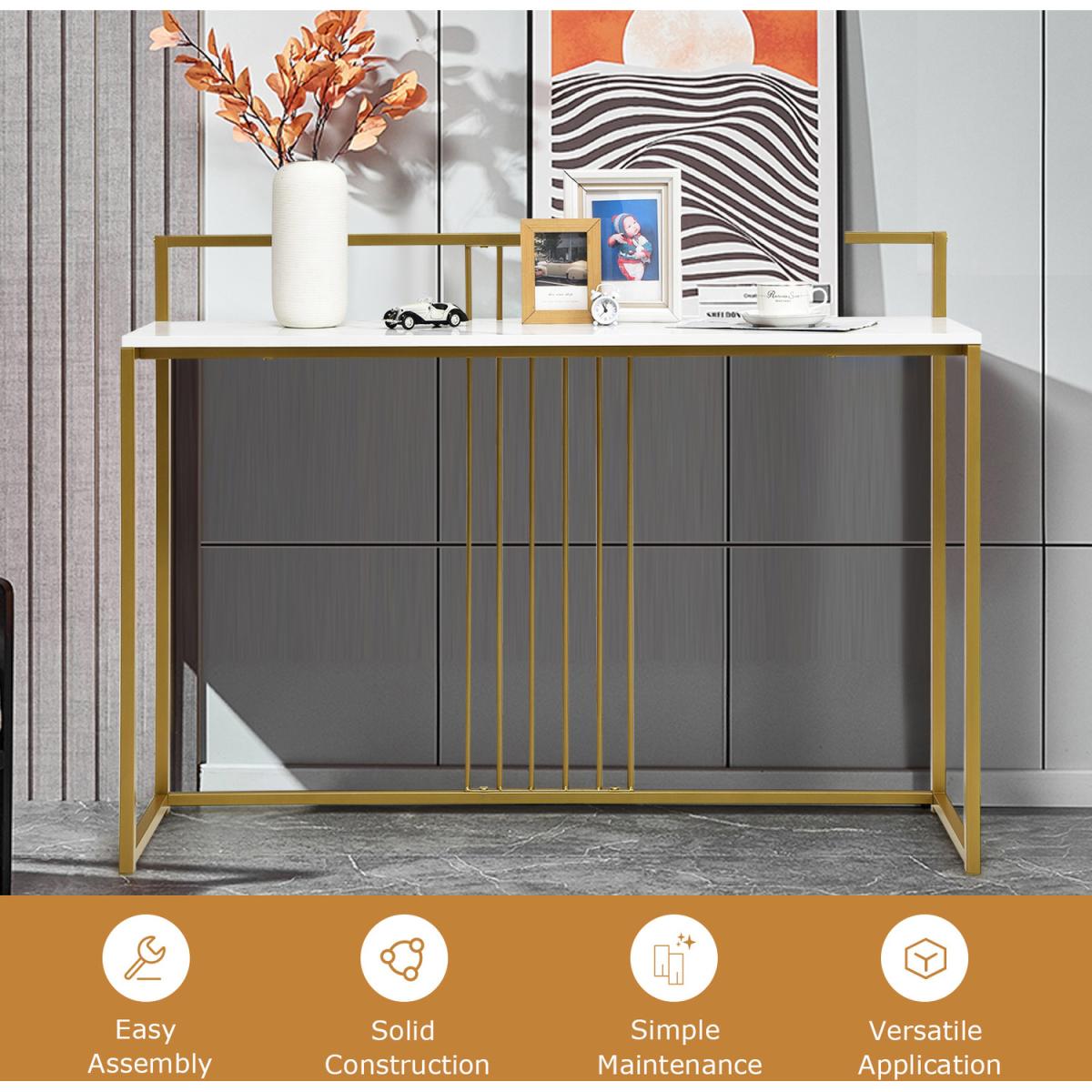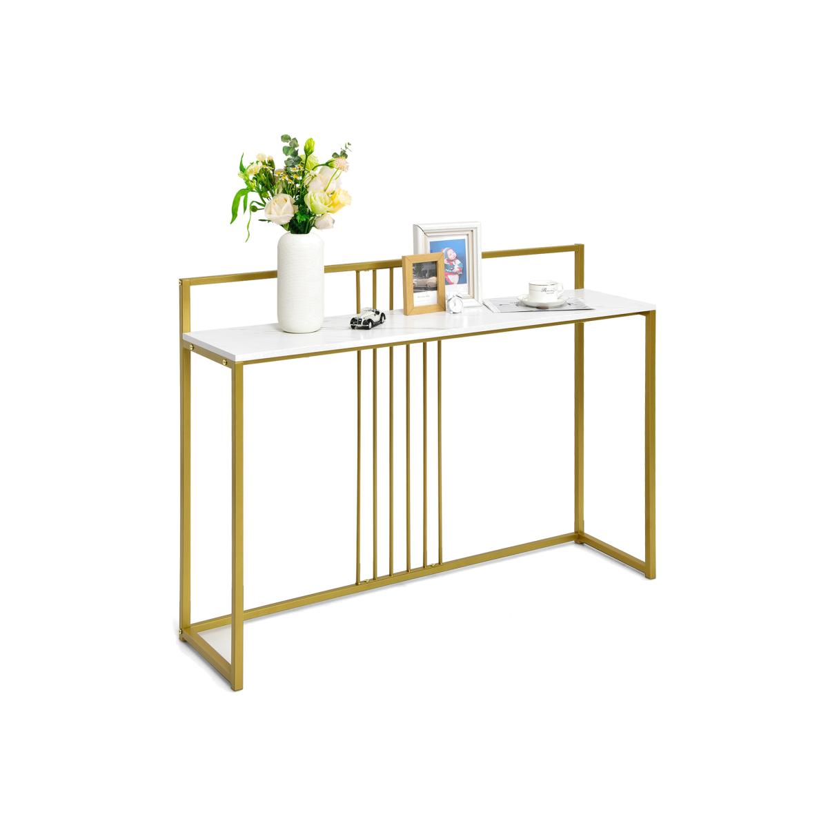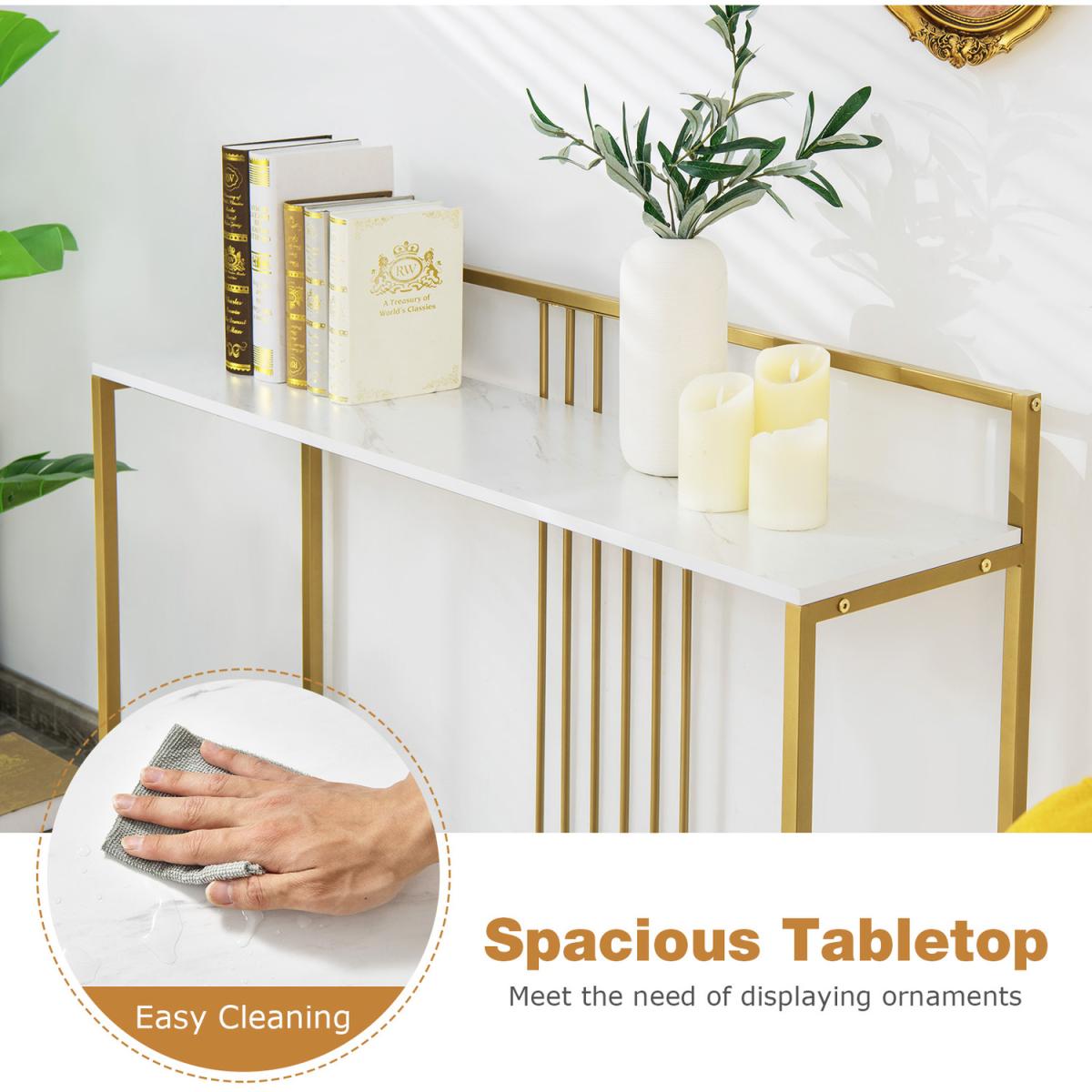 You definitely need this stylish console table to complement the interior decorations of your home! The smooth tabletop with marble texture offers a spacious platform to display your beloved collections and other ornaments. Besides, the sleek gold bracket well supports the desktop, embellishing the whole table with a luxurious appeal. Whats more, constructed from thick MDF and robust steel pipes, the side table features superior durability and strong load-bearing capacity. And the base is fitted with plastic gaskets, which improve the overall stability and prevent scratches. As it is narrow in shape, you can freely put it anywhere with limited space, for example, the entryway.