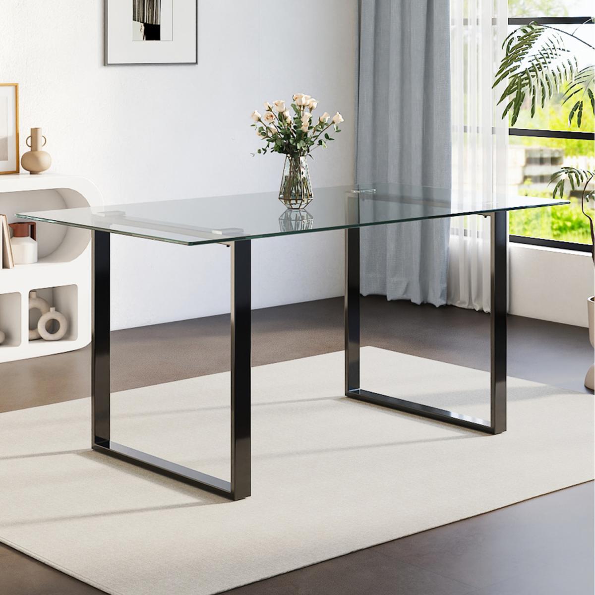 This rectangular dining table features a minimalist design that enhances any space. The tabletop is crafted from solid tempered glass, supported by two sturdy metal rectangular frames underneath, accommodating up to six people. The corners of the tempered glass are specially rounded to prevent sharp edges. While the design is straightforward, the high-quality materials ensure stability and durability, making it easy to maintain. A slight gap between the base and the tabletop allows for the placement of thinner items like magazines. This strong and durable table complements various home decor styles, adding both convenience and elegance to your living space.