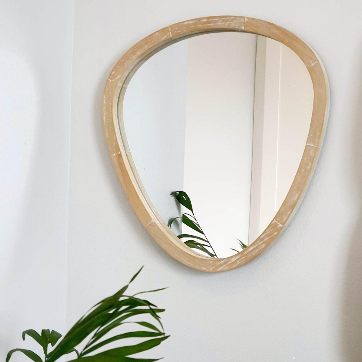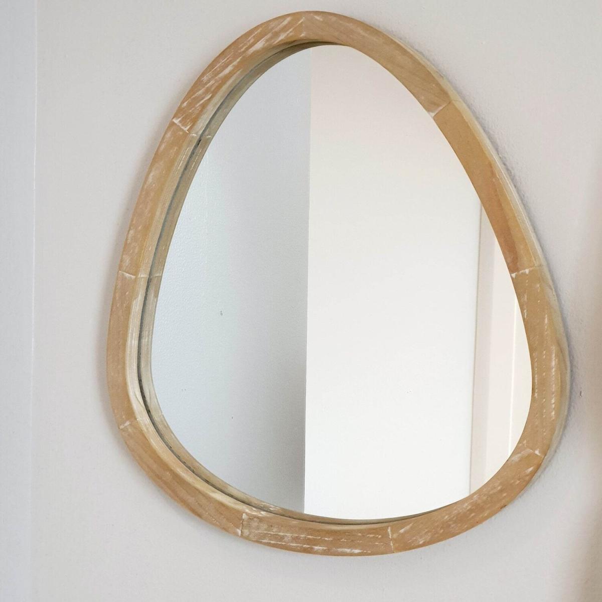 A beautiful and so aesthetic minimalistic irregular shaped natural wood frame mirror with a delicate white wash distressed finish. Perfect for any room at home. Sturdy wooden frame with natural light wood colour and white wash finish. It comes with 2 hook plates on back of the mirror for an easy wall hanging.