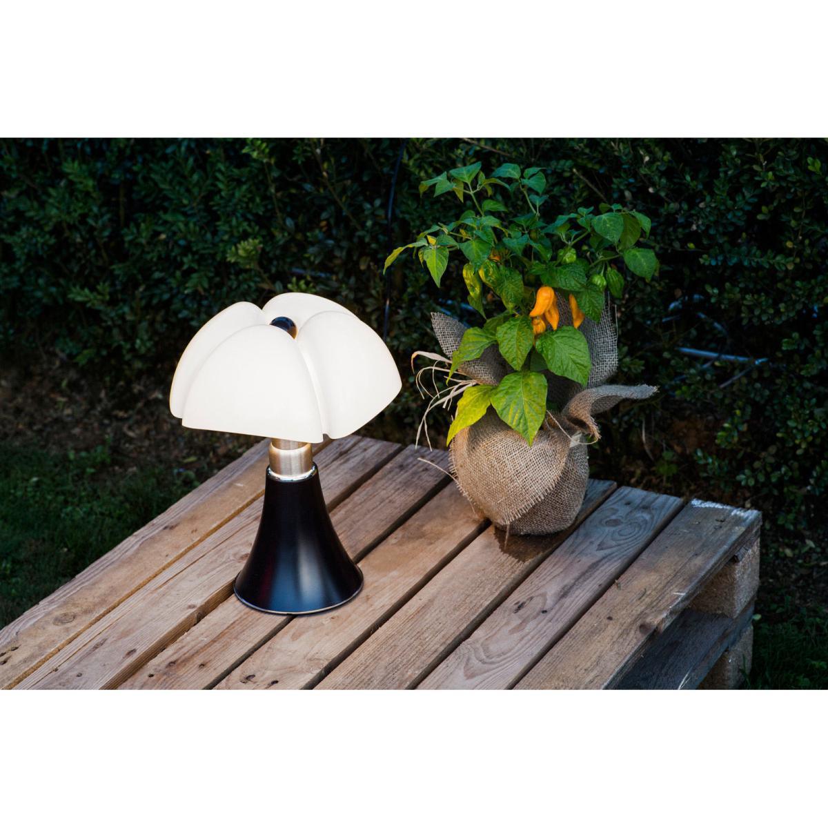 A cult design object, the Pipistrello lamp is constantly renewing itself. This mini version is a real nomad: wireless and rechargeable, it can be used anywhere in the house! This portable lamp is an exact replica, on a smaller scale, of its larger sister designed in 1965 by Gae Aulenti. Equipped with a battery and a micro-USB charger, this wireless lamp has a 6 hour battery life. The touch dimmer on the base enables the intensity of the light to be adjusted. The Minipipistrello lamp will look great everywhere: on a desk, a shelf, a console or a bedside table. It is equipped with an energy-saving and efficient LED source. The Pipistrello lamp is easy to recognise, with its famous undulating lampshade, resembling a bat ("pipistrello" in Italian). The shade is in opal white methacrylate and the base is aluminium. It gives out a pleasant diffuse light. Mythical, showcased in the greatest museums around the world, Pipistrello is one of those objects that have become part of our universal heritage. The lamp is made according to the original 1965 model, in Italy, by the factory Martinelli Luce. Delivered with a certificate of authenticity.