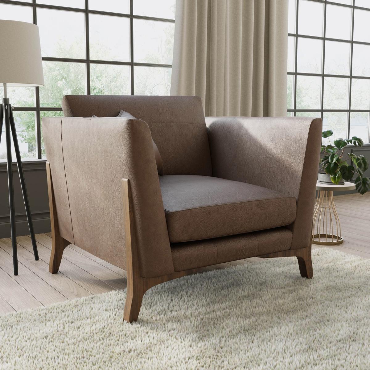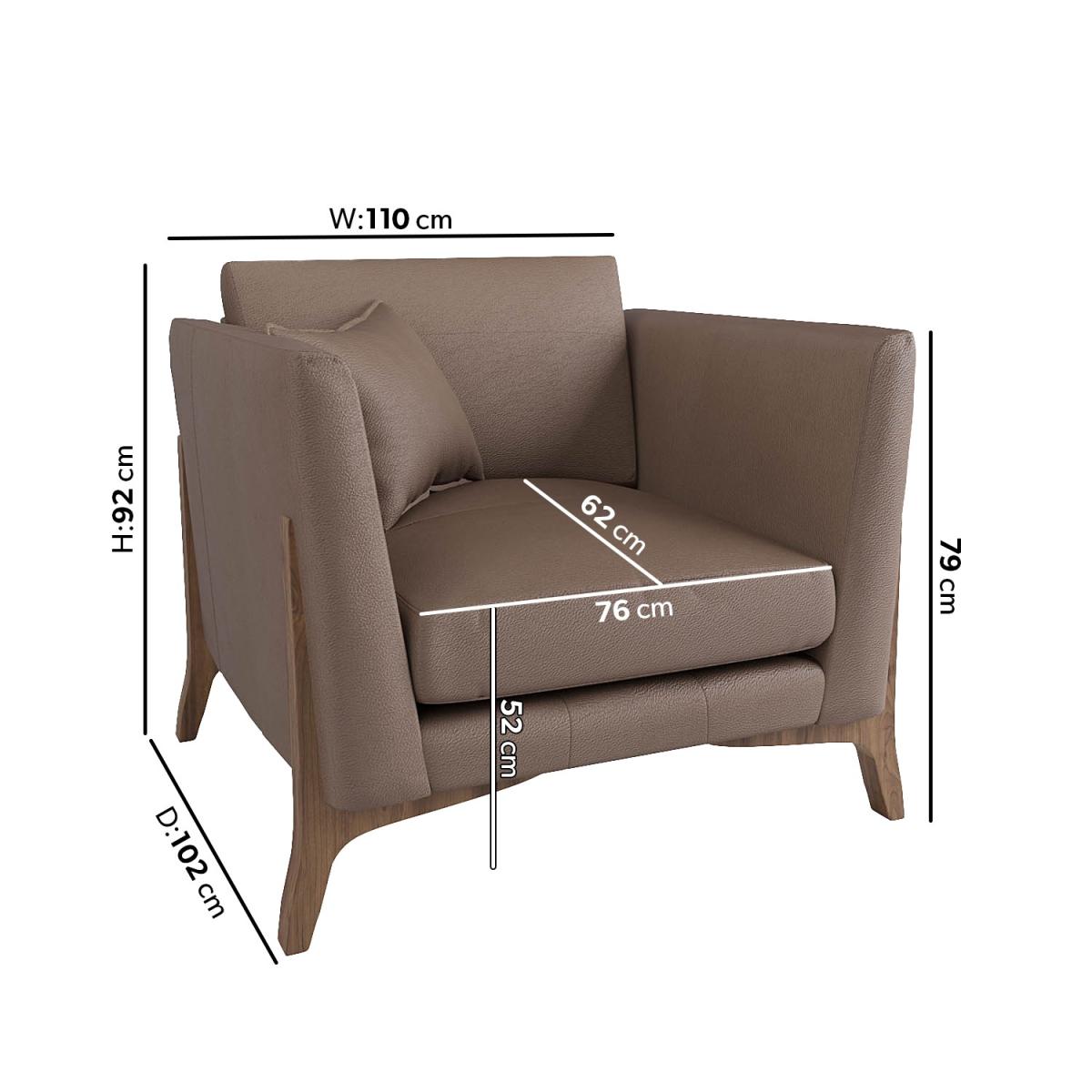 All about me Introducing our mid-century Adley leather armchair. With clean lines, plump cushions, angled arms and crafted with a beautiful combination of natural walnut wood and sustainable leather upholstery. The extended walnut wood legs showcase its sophistication and add a modern edge. The back cushions are secured with zips to prevent them from slipping down, and the seat cushion can be detached for regular plumping to keep its shape, making it perfect to lounge on. The innovative and award-winning foamflex seat interior and fibre-filled backs make for a durable and truly comfortable seat. Above all, its versatility and hard-wearing design would elevate any living space and ideal for family homes. Need to know Dimensions:W110 x D102 x H92 cm Seat height: 52cm Colour: Mink Finish: Upholstered, powder-coated (legs) Material: Hardwood frame, genuine leather fabric, fibre-filled backs, foamflex seat interior For use: Indoors (suitable for wooden floors) Product weight: 47.5kg Assembly required:Yes, just the legs to attach What is foamflex? It's the latest engineered foam seat interior designed to give you the comfort of fibre with the retention of foam.