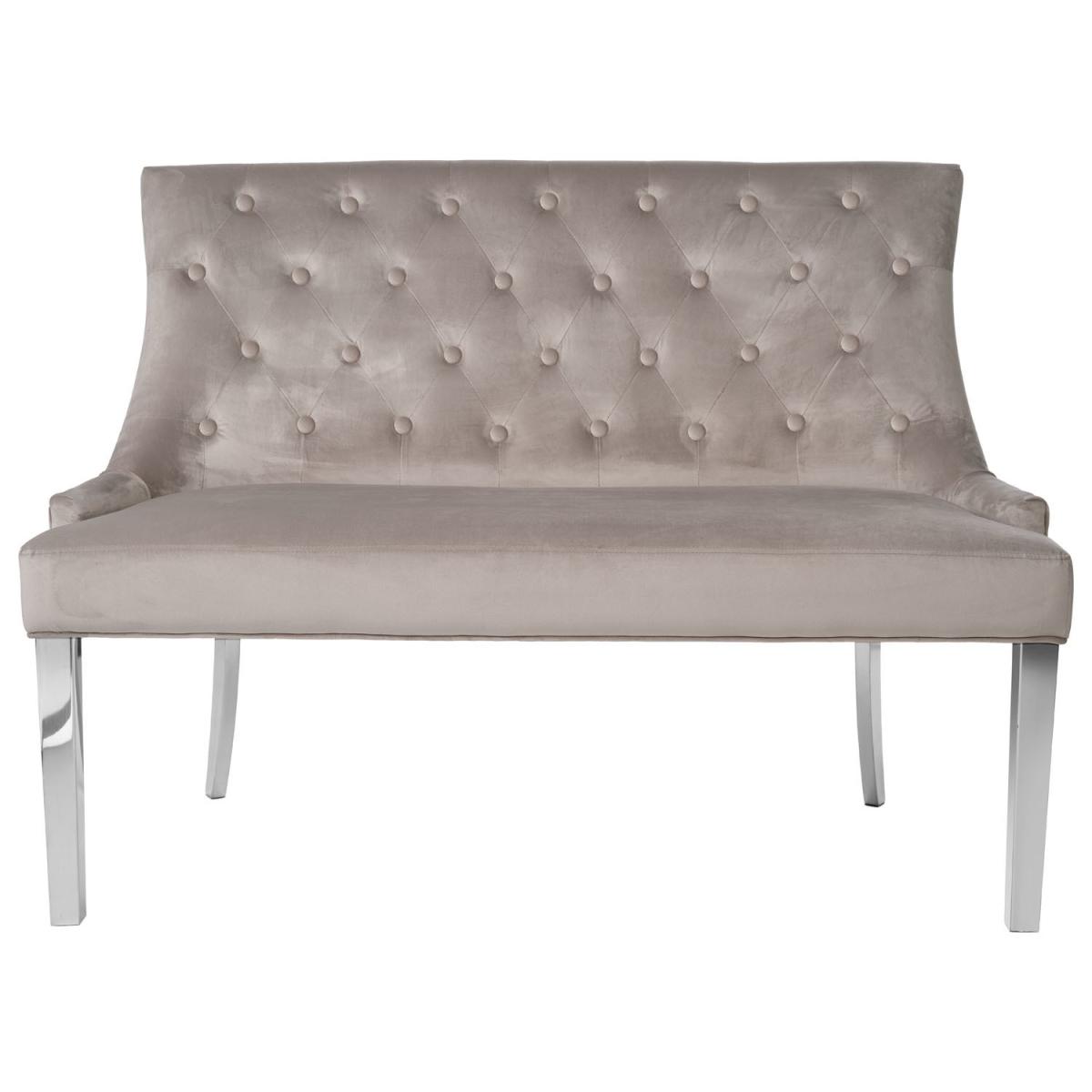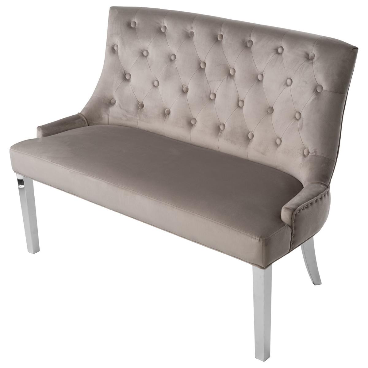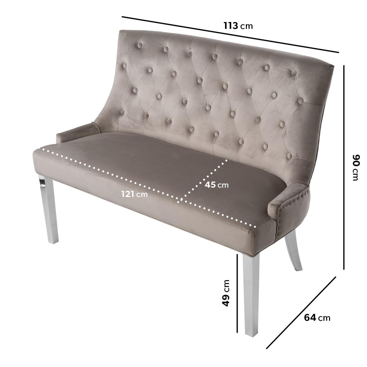 Features we love Knocker back hallway bench with button pattern. High back shape provides support whilst you dine. Upholstered in a stylish and soft mink velvet Chrome legs and stud detailing complete the look. Discover the matching pieces also in the Jade range Need to know. Dimensions. H90 x W121 x D64 cm Colour. Mink Finish. Stainless legs and velvet Material. Stainless legs and velvet Assembly required. Yes Range. Jade Boutique.