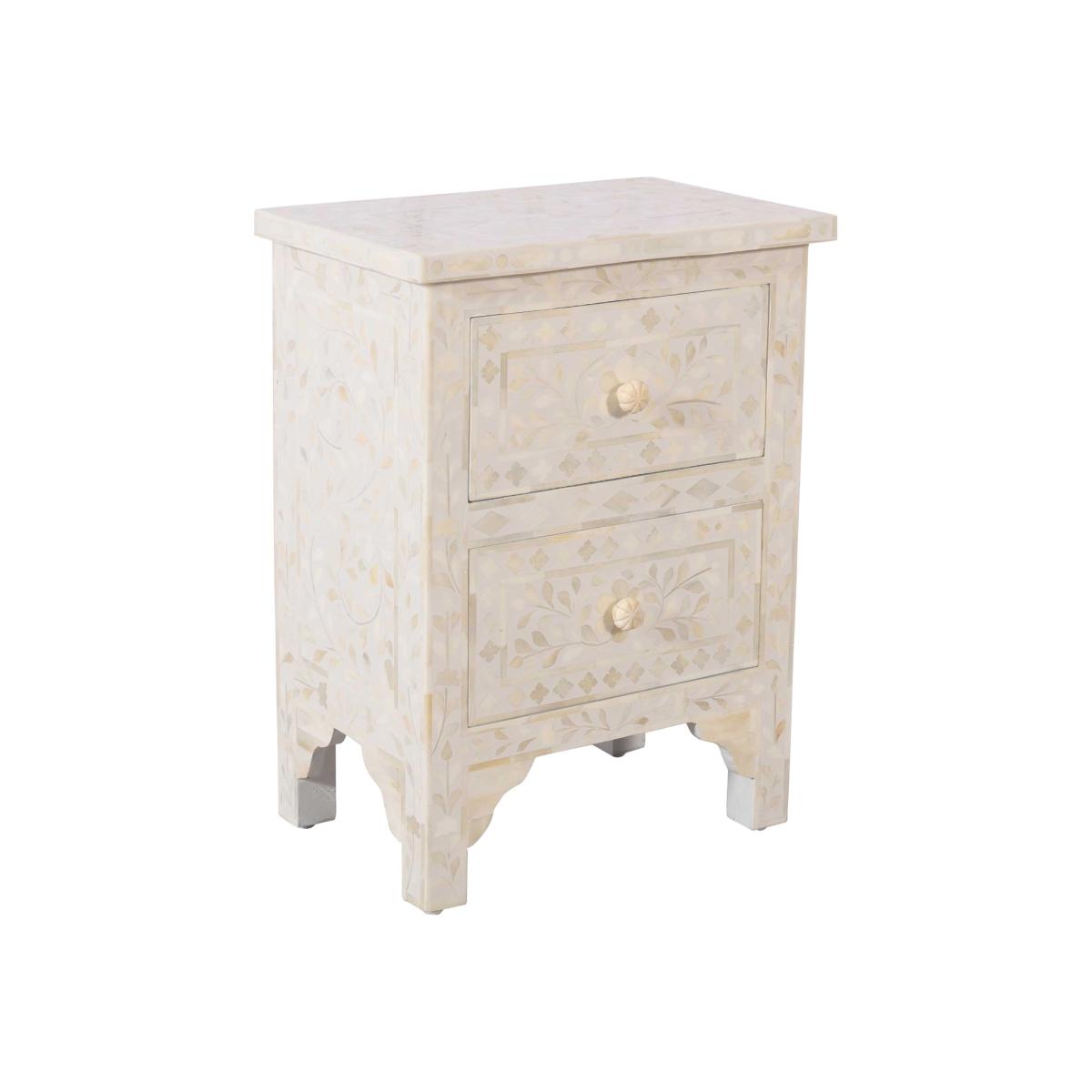 The Minnie Bedside Table is a beautiful bedside table that is certainly an eye-catching piece for your bedroom due to the colour and pattern. Handcrafted by a team of skilled craftsmen using a bone inlay to create a stunning pattern of foliage and shapes. Not only an elegant piece of furniture but a storage solution too with the two drawers and room on the top for a bedside lamp and book to relax with.