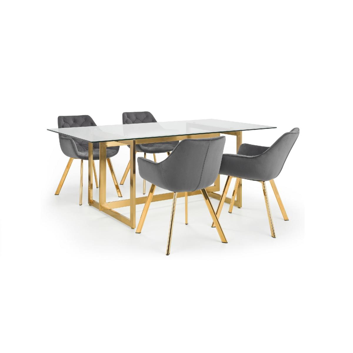 Gatsby called - he wants his dining set back. Dine in style and class with this Minori dining set, featuring a luxe mix of velvet, gold-effect finish, and clear glass that's sure to wow you and your guests day in and day out. Tempered glass and sturdy steel make for a durable construction sure to stay with you for years, so you don't have to worry about having to part with such a stylish piece!.