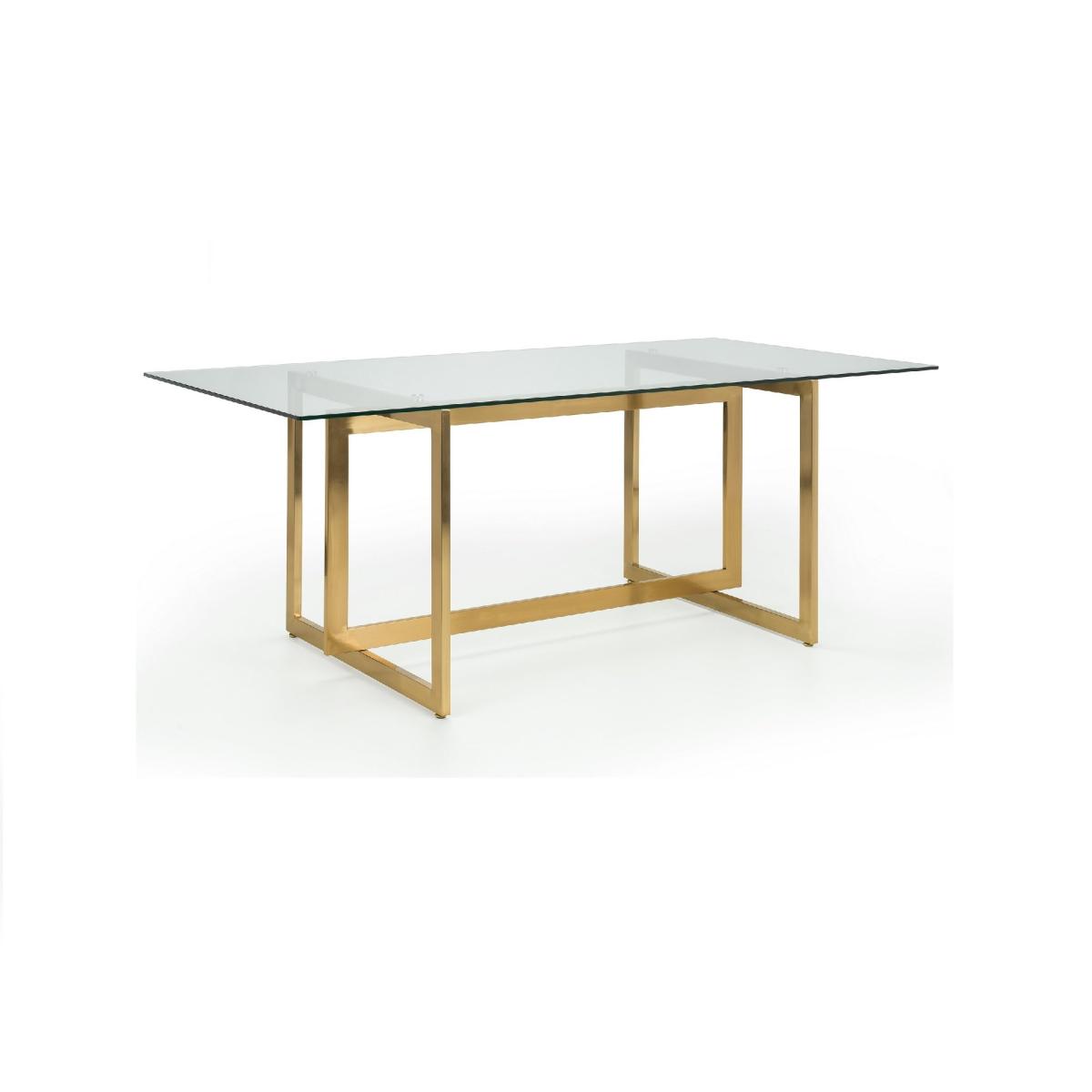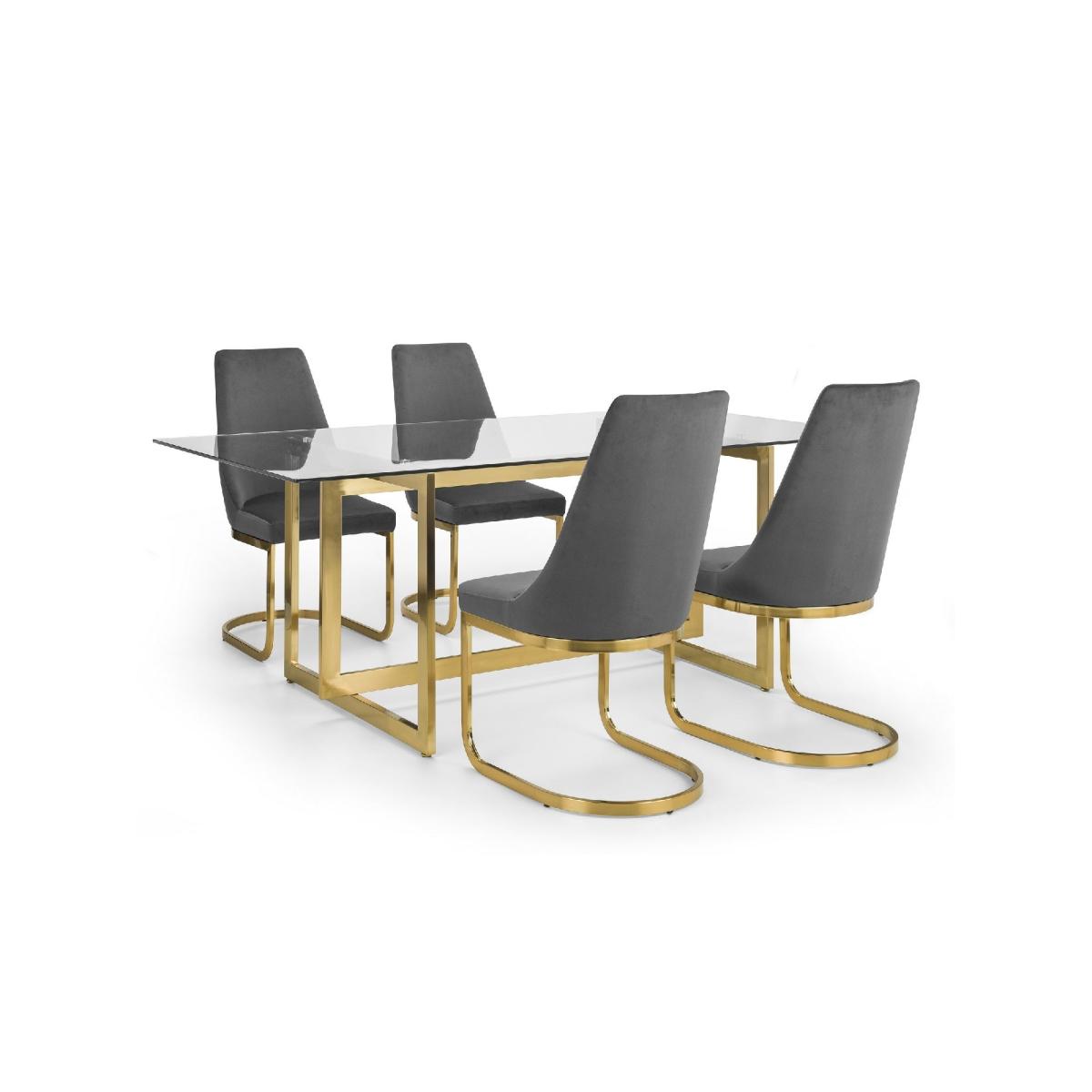 Gatsby called - he wants his dining set back. Dine in style and class with this Minori dining set, featuring a luxe mix of velvet, gold-effect finish, and clear glass that's sure to wow you and your guests day in and day out. Tempered glass and sturdy steel make for a durable construction sure to stay with you for years, so you don't have to worry about having to part with such a stylish piece!.