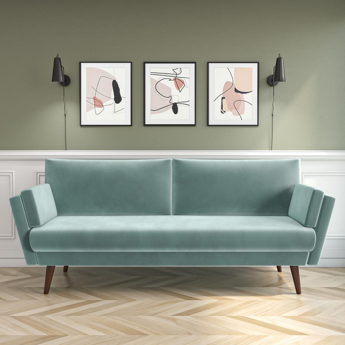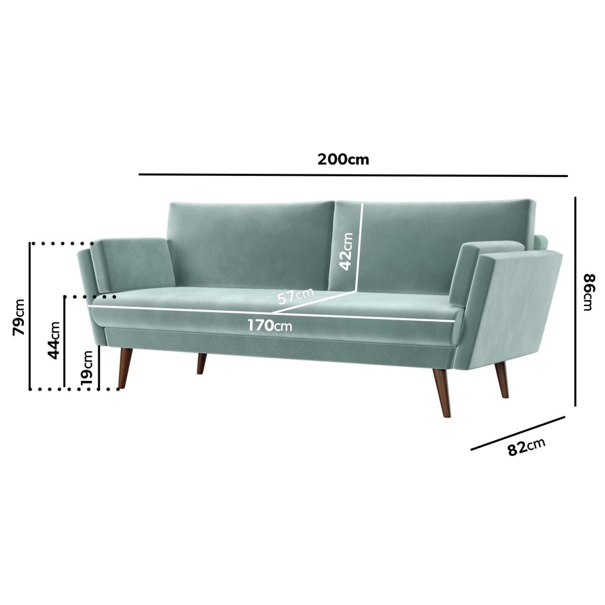 Features we love Three-seater sofa with tapered dark wooden legs. Upholstered in a luxuriously soft light-green velvet. Fibre-filled back cushions and; comfy foam-filled seats. Seat and cushion covers can easily be removed. Minimum assembly required just secure the legs. Matching seating available in the Milton range. All about me. This Milton sofa is the perfect statement piece the stylish silhouette and tapered dark wooden legs will add a modern feel to any living room. Made with sinuous springs hardwood and a variety of foam and fibre fillings you can be sure this sofa will offer optimum comfort and last for years to come. Need to know. Dimensions. H86 x W200 x D84 cm Max supported weight. 300kg (100kg per seat) Product weight. 50kg Colour. Light green Finish. Velvet upholstery Material. Velvet fabric hardwood frame and beechwood legs Seat cushion filling. High density foam Back cushion filling. Fibre fill Spring construction. Sinuous springs Assembly required. Yes - just the legs