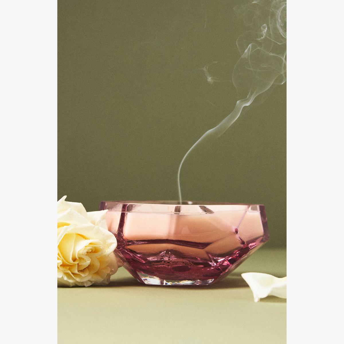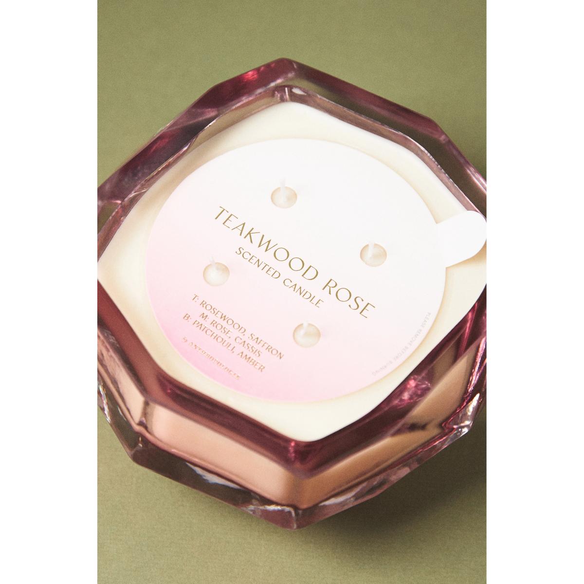 **Teakwood Rose (Woody):** Elegant notes of fresh-cut roses fill the air amidst a bright, luminous accord of crimson iris, heady jasmine, and creamy gardenia petals resting above aromatic black cassis, dark woods, and a sweet, ambered musk. *For the best burn experience, keep the following in mind:* * The first time you light your candle, allow it to burn until the wax pool melts all the way to the edge; for a larger candle, this may take several hours. Wax has "memory," so if it is extinguished with a partial pool, that will prevent a full, even pool from forming in the future. * Trim your wick each time you light the candle, removing any "bloom" from the previous burn. We recommend lighting a wick that is 1/4-1/2" in length. * Ensure that your candle is placed on a heat-safe surface. * Do not allow wick trimmings, dust, or other materials to accumulate in the wax pool. * To ensure safety and longevity, be sure to check the bottom of your candle for additional instructions, including details on when to discontinue use. * 15-hour burn time * Coconut wax blend; cotton candle wick * Ceramic vessel * Imported