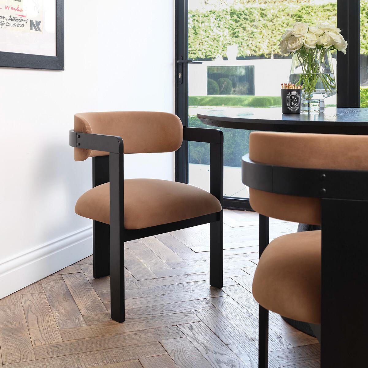 Modern lines, luxe texture. Mirabella pairs plush velvet with a sleek silhouette for a look that’s both contemporary and elevated. Designed for comfort and styled to impress, it’s a refined addition that brings quiet sophistication to any dining space. Product Details • Velvet upholstered seat • Wood legs • All black sleek design • Plush velvet seat pad and back • Modern Curved Design • Perfect around a curved dining table or as end chairs • Partial assembly required (legs/feet only) • 12 month manufacturers warranty • Care advice - Wipe with a clean damp cloth or soft brush. Product Composition - Velvet, Rubberwood. Product Dimensions - 54 cm x 53 cm x 74 cm , Weight - 9 KG • Seat Height: 40 cm • Back Height: 31.5 cm • Arm Height: 67 cm • Clearance to floor: 29 cm Package Dimensions - 81 cm x 60 cm x 59 cm, Weight 15 kg. This product will be dispatched by one of our trusted suppliers. You’ll be contacted by their selected courier about your delivery. Please note: this product cannot be delivered to all Offshore Islands, Northern Ireland or Republic of Ireland.
