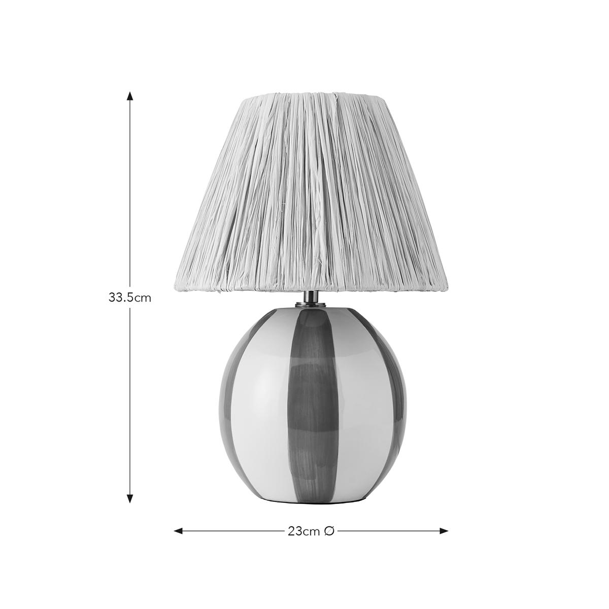 * Fun, Striped Design* Durable Ceramic Base* Natural Raffia Shade* Handy In-Line Switch Add a pop of fun to your home with the Mirabelle Round Striped Table Lamp. Featuring a playful striped design and durable ceramic base, it adds personality to any room. Complete with a natural raffia shade and a handy in-line switch, it's both stylish and functional.