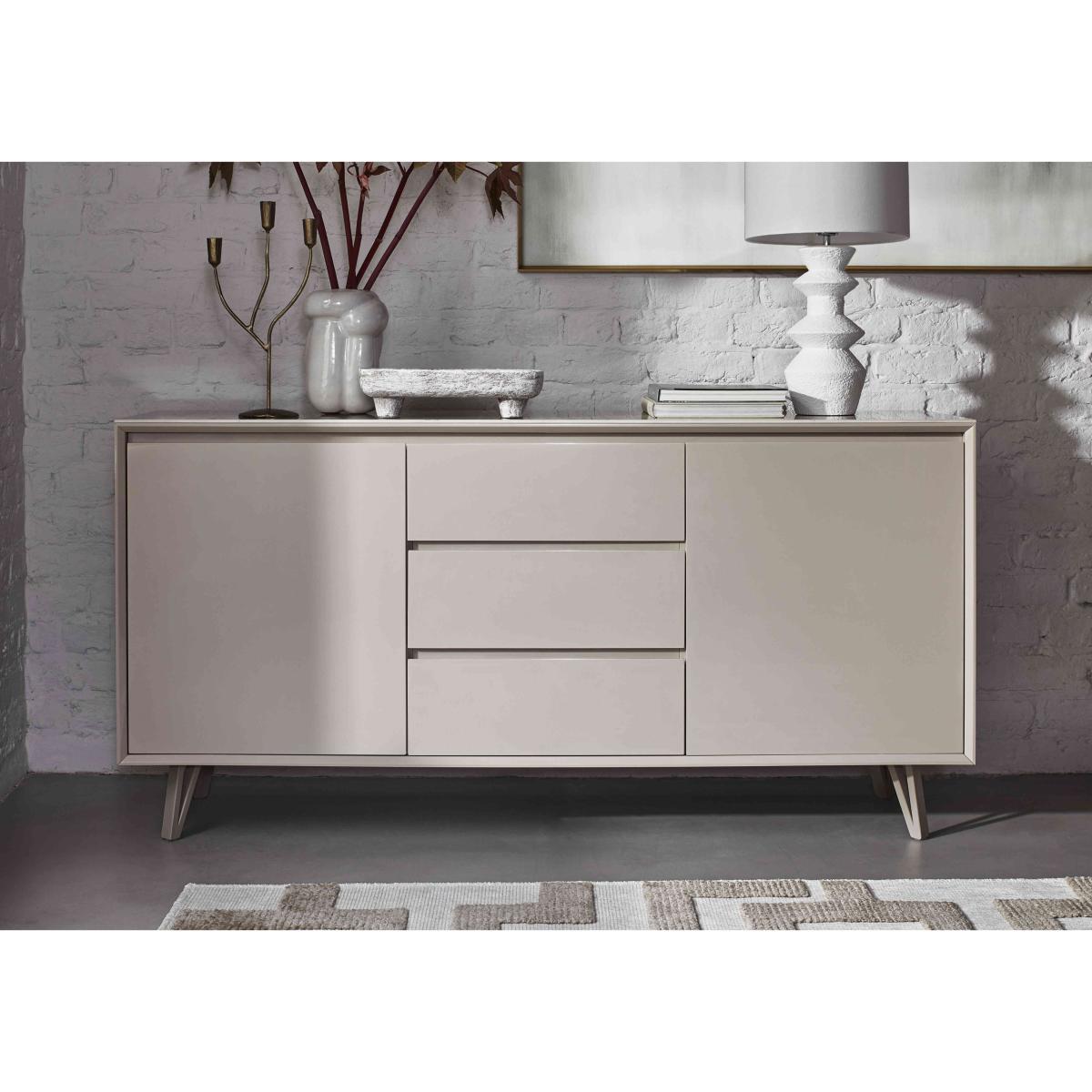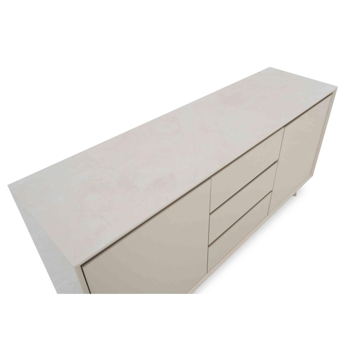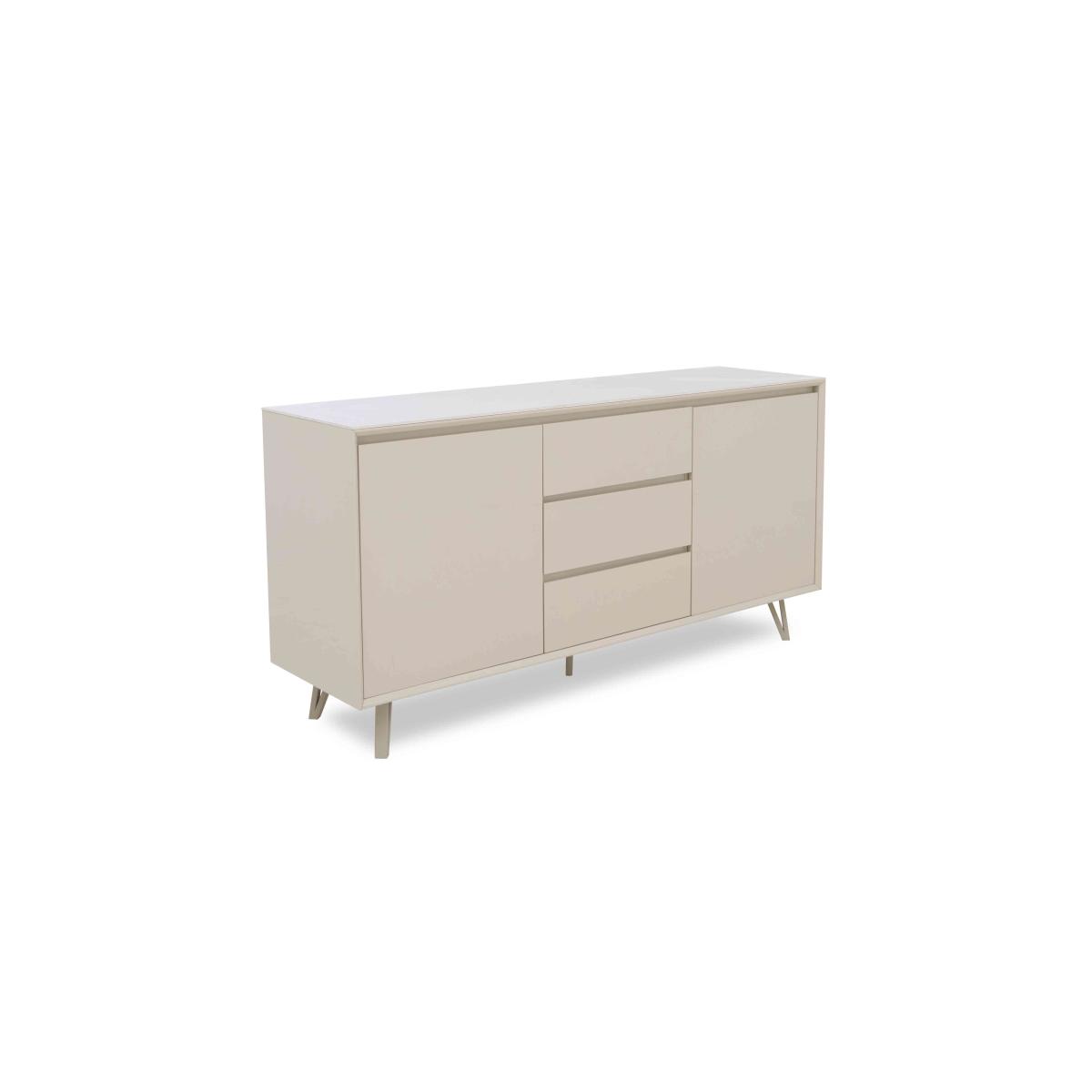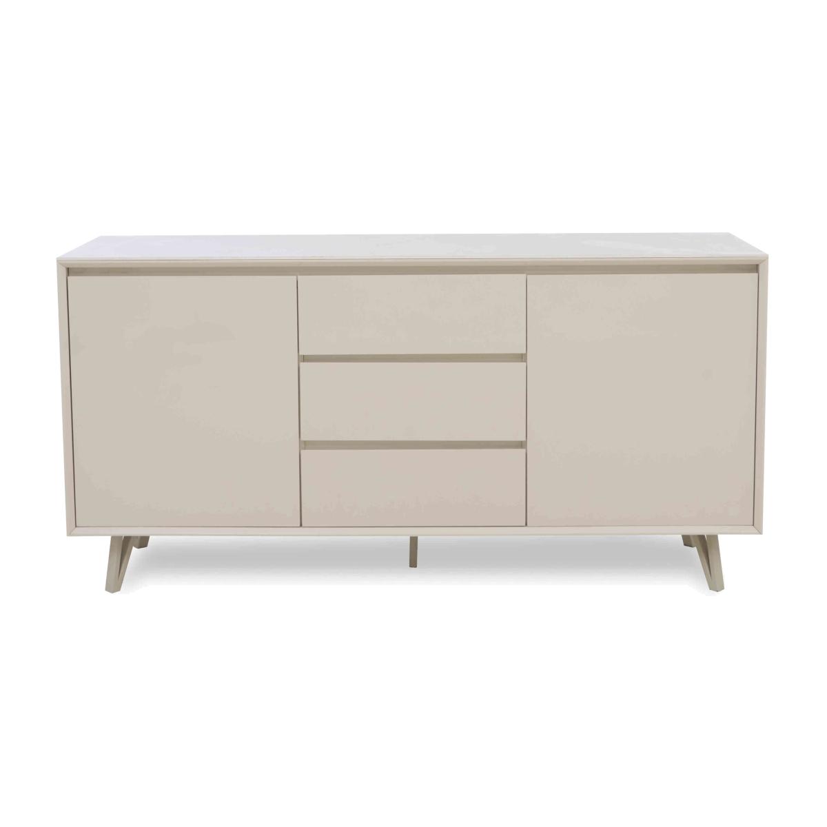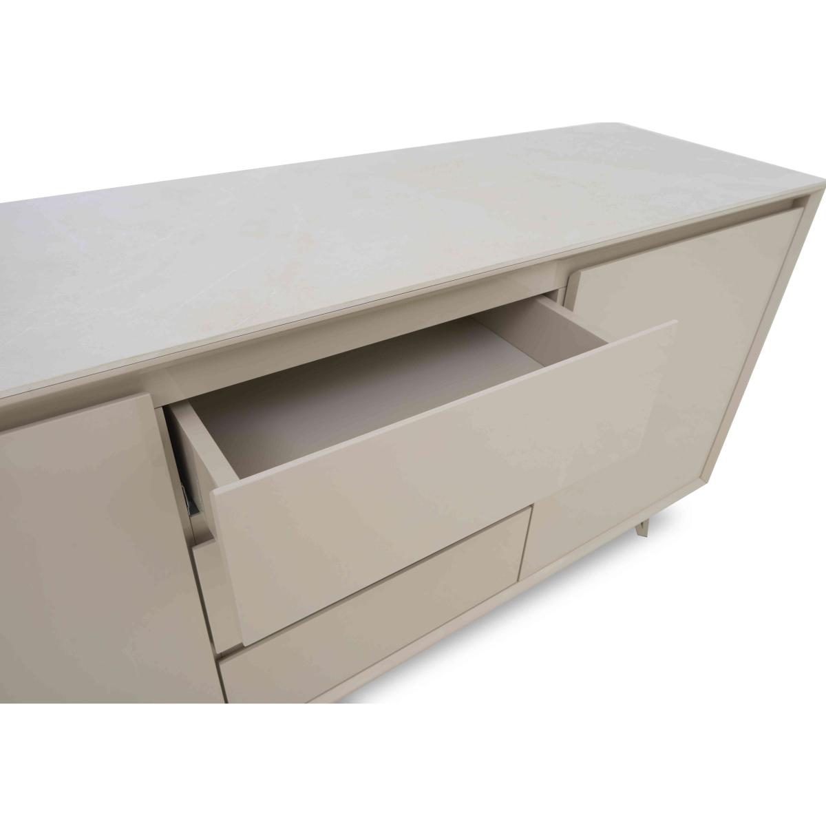 It’s not a Mirage. Our new Mirage collection puts fabulous contemporary furniture most definitely within reach. The collection’s statement boat-shaped extending dining tables display architectural bases and high-gloss ceramic tops with travertine marble-inspired patterning. Dining chairs have auto-return swivel bases and pocket sprung seats for dining comfort like never before. And the range’s storage and occasional pieces – sideboards, a coffee table, a TV unit and more – make it easy to bring Mirage’s high-end look into living spaces as well as dining rooms. The Mirage range is exclusively available at Furniture Village. This stunning and spacious sideboard is the very definition of cool modern style thanks to its beautiful marble-effect ceramic top and high-gloss lacquered frame. Why you'll love it Stylish angles, sleek finishes and an on-trend, tone-on-tone colour palette. Stunning modern sideboard with a gorgeous lacquered frame. High-gloss ceramic top has a travertine marble-inspired finish. Roomy storage with soft-closing cupboard doors and drawers. Ceramic is heatproof, scratch-resistant and chip-resistant. Bonded to tempered glass, the ceramic top is extremely durable. The Mirage range is only available at Furniture Village. This sideboard is part of our Mirage range. What you need to know Double-door cupboard has 1 adjustable shelf. We recommend using coasters and placemats at all times. Lacquered surfaces may show small circular marks as a result of the polishing process. Easy to care for. Simply wipe with a clean damp cloth and dry with a soft duster. Do not use abrasive cleaning products.