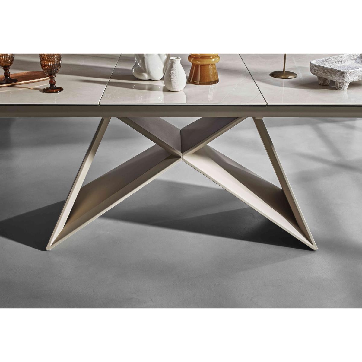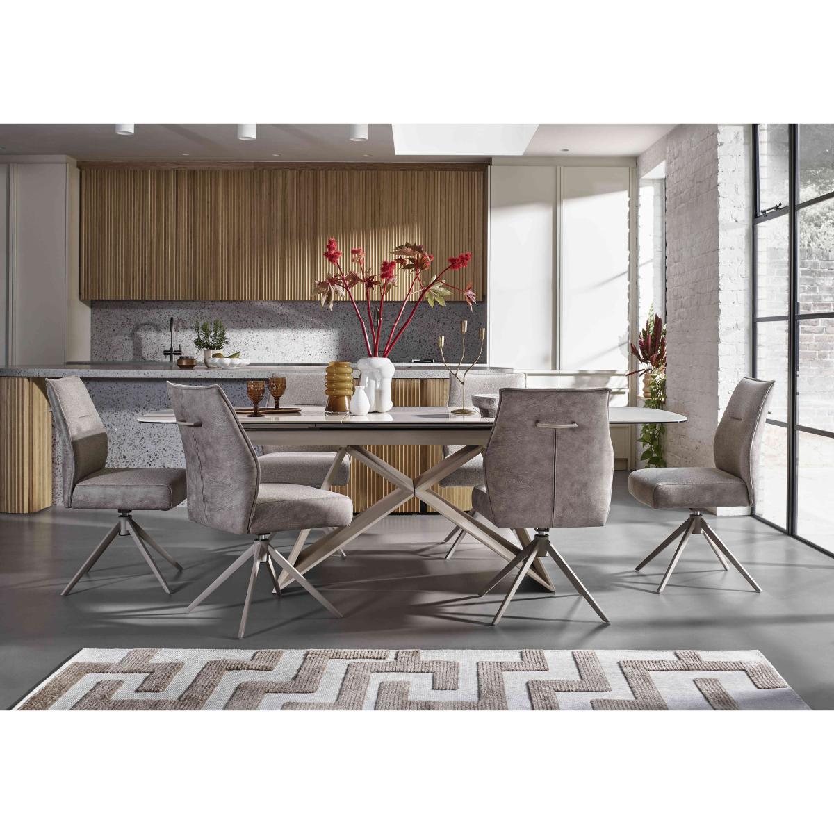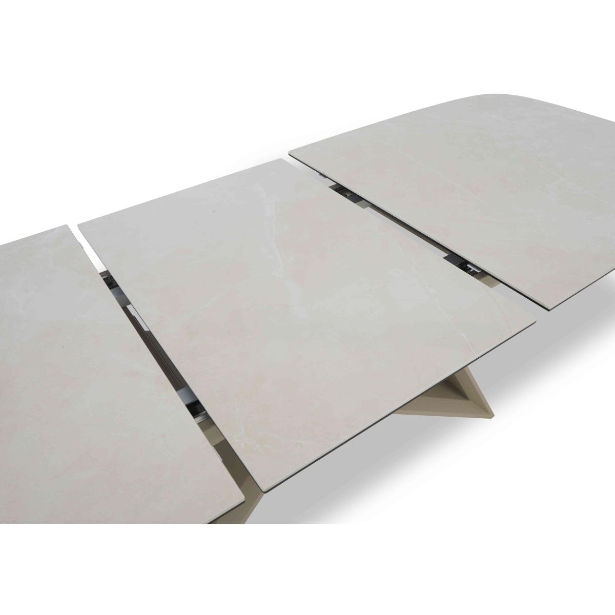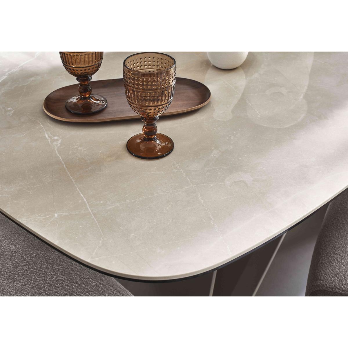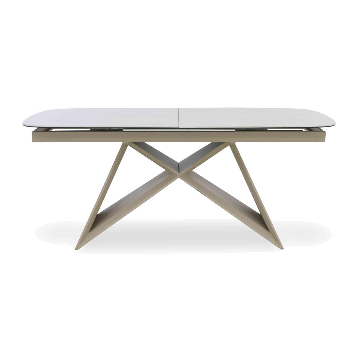 It’s not a Mirage. Our new Mirage collection puts fabulous contemporary furniture most definitely within reach. The collection’s statement boat-shaped extending dining tables display architectural bases and high-gloss ceramic tops with travertine marble-inspired patterning. Dining chairs have auto-return swivel bases and pocket sprung seats for dining comfort like never before. And the range’s storage and occasional pieces – sideboards, a coffee table, a TV unit and more – make it easy to bring Mirage’s high-end look into living spaces as well as dining rooms. The Mirage range is exclusively available at Furniture Village. Beyond cool, this large extending dining table really stands out from the crowd with its beautiful glossy ceramic finish and bold sculptural base. Exclusive. Why you'll love it Stylish angles, sleek finishes and an on-trend, tone-on-tone colour palette. Large boat-shaped extending dining table with a stunning high-gloss ceramic top. In a sophisticated neutral with a travertine marble-inspired finish. Eye-catching, architectural base with a modern powder-coated finish. Table quickly and safely extends to seat 10 – extension leaves pull out from the table ends. Ceramic is heatproof, scratch-resistant and chip-resistant. Bonded to tempered glass, the ceramic top is extremely durable. The Mirage range is only available at Furniture Village. This large extending dining table is part of our Mirage range. What you need to know This large 180 cm extending dining table seats 6 closed and extends to 240 cm to seat 10. Top is made of 6 mm ceramic bonded to 6 mm tempered glass. This dining table is very heavy and should not be moved once in place. We recommend using coasters and placemats at all times. Easy to care for. Simply wipe with a clean damp cloth and dry with a soft duster. Do not use abrasive cleaning products.