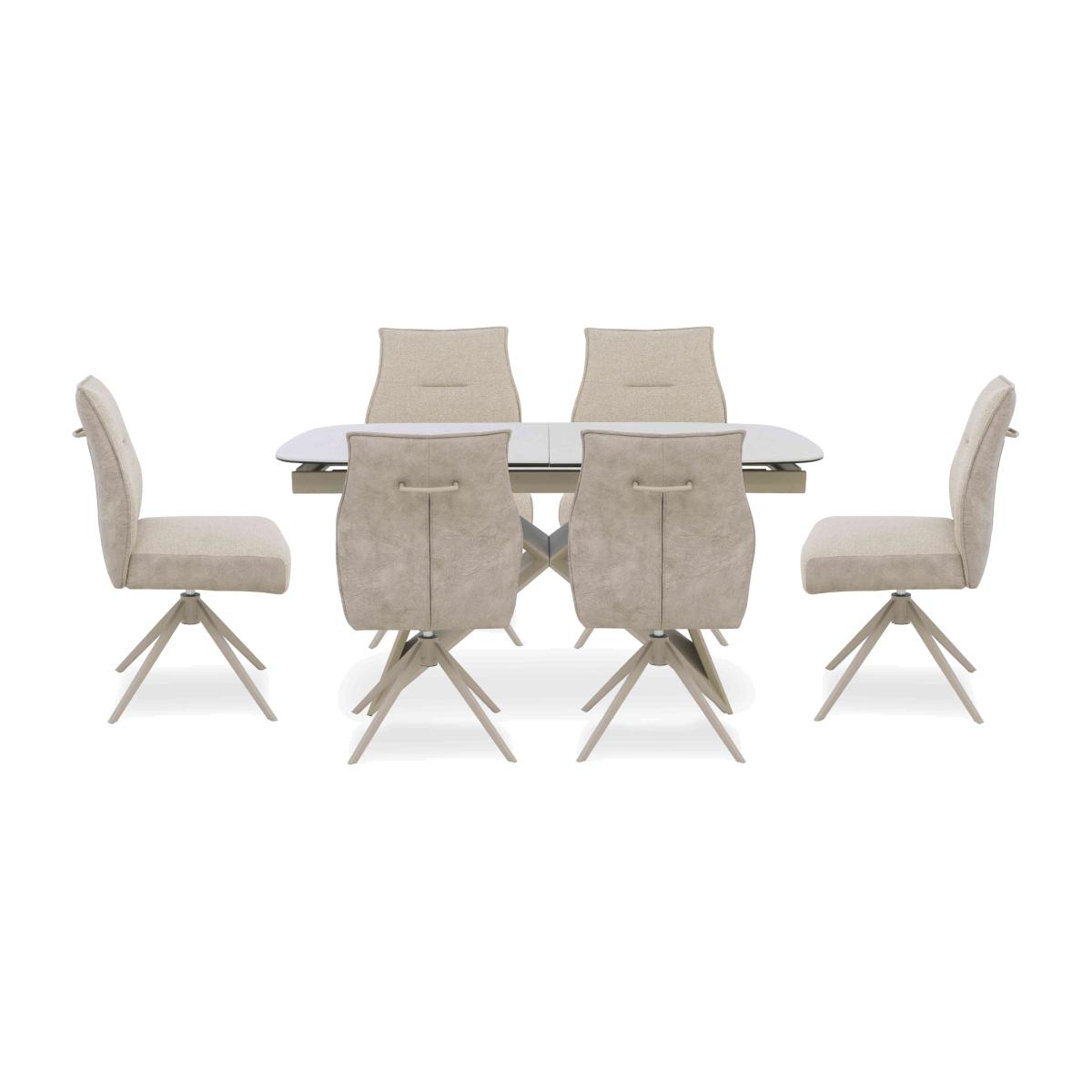 It’s not a Mirage. Our new Mirage collection puts fabulous contemporary furniture most definitely within reach. The collection’s statement boat-shaped extending dining tables display architectural bases and high-gloss ceramic tops with travertine marble-inspired patterning. Dining chairs have auto-return swivel bases and pocket sprung seats for dining comfort like never before. And the range’s storage and occasional pieces – sideboards, a coffee table, a TV unit and more – make it easy to bring Mirage’s high-end look into living spaces as well as dining rooms. The Mirage range is exclusively available at Furniture Village. Seat up to eight in bold contemporary style with this beautiful dining set. The extending table has a glossy ceramic top and sculptural metal base. With six swivel-base dining chairs. Why you'll love it Stylish angles, sleek finishes and an on-trend, tone-on-tone colour palette. Small extending dining table with a boat-shaped ceramic top in a sophisticated neutral. High-gloss with a travertine marble-inspired finish. Eye-catching, architectural base with a modern powder-coated finish. Table quickly and safely extends to seat 8 – extension leaves pull out from the table ends. Ceramic is heatproof, scratch-resistant and chip-resistant. Bonded to tempered glass, the ceramic top is extremely durable. Set includes 6 swivel dining chairs with contemporary curves. Pocket sprung seats have 8 cm-deep springs and foam cushioning. Auto-return swivel bases – chairs will always return to face forward. Neutral fabric upholstery and powder-coated metal legs. The Mirage range is only available at Furniture Village. This dining set is part of our Mirage range. What you need to know Dining chairs have metal frames and legs and are cushioned with foam. Small 140 cm extending dining table seats 6 closed and extends to 170 cm to seat 8. Top is made of 6 mm ceramic bonded to 6 mm tempered glass. This dining table is very heavy and should not be moved once in place. We recommend using coasters and placemats at all times. Easy to care for. Simply wipe with a clean damp cloth and dry with a soft duster. Do not use abrasive cleaning products.