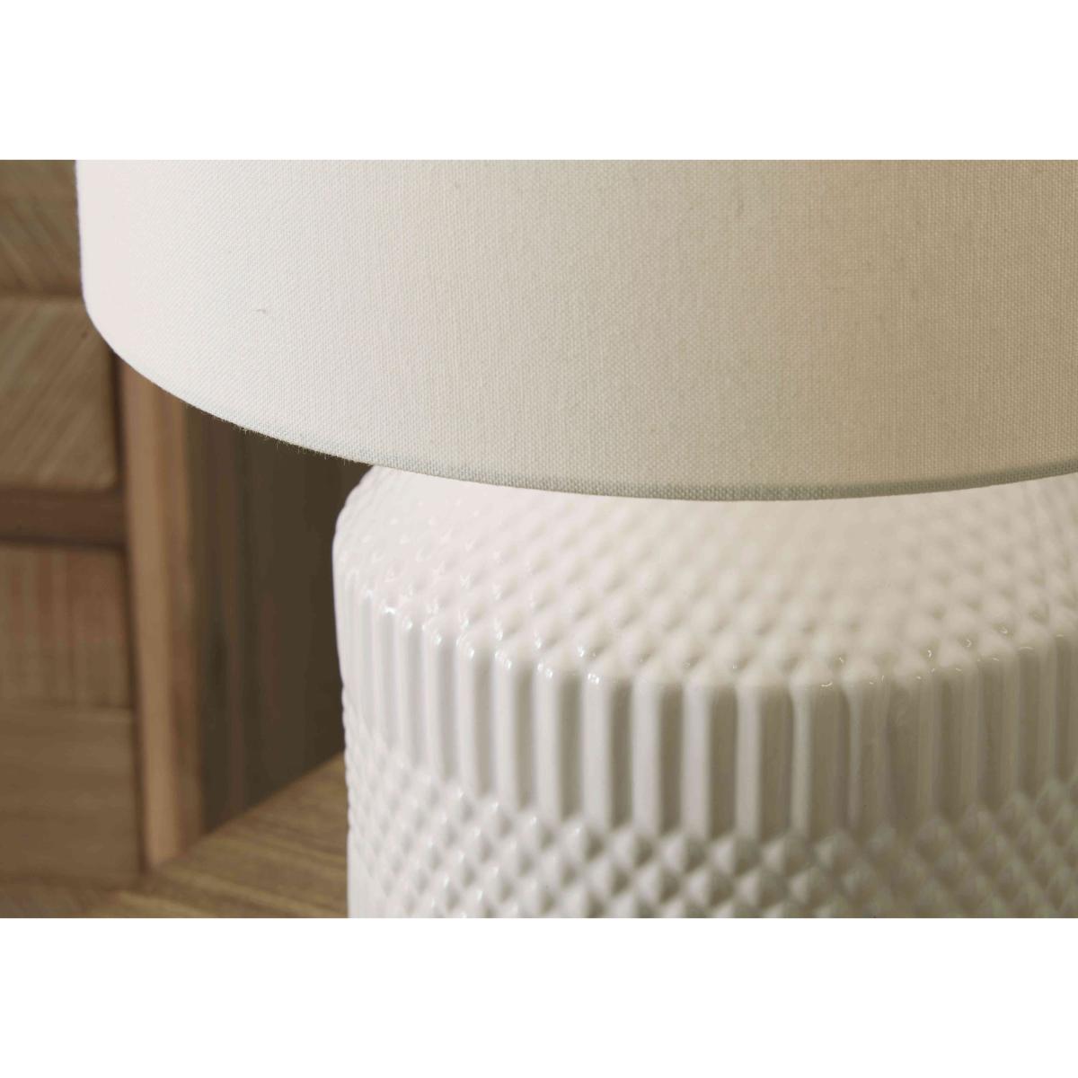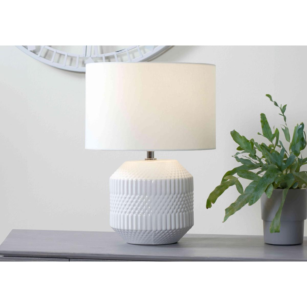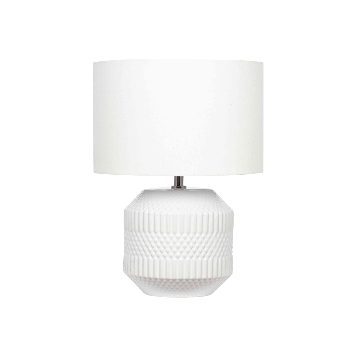 This beautiful white ceramic table lamp is so versatile. Its delicate geometric patterning ensures that it’s inviting in a living space as well as elegant in a bedroom or guest room. Why you'll love it Simple yet striking small table lamp. Ceramic base is finished in a white glaze. Tactile geometric pattern has a handcrafted feel. Elegant white drum-shaped lampshade. Clean, simple and minimal – a versatile choice for any room. This table lamp is part of the Furniture Village lighting collection. What you need to know Ceramic base, polycotton shade. Supplied with 150 cm cable. Requires 1 x ES/E27 GLS max. 10-12 W LED bulb (not included). Please do not exceed this wattage. To clean, wipe gently with a clean soft cloth. Be sure to disconnect from the power outlet before cleaning. Dimensions including shade Height: 38 cm (15 in). Diameter: 28 cm (11 in).