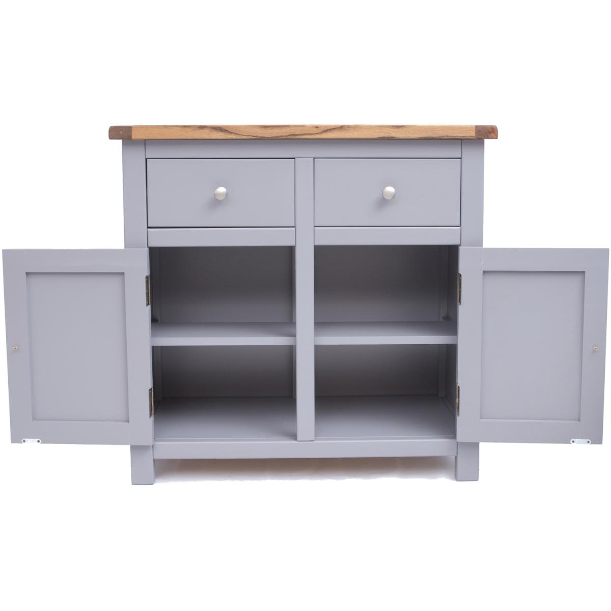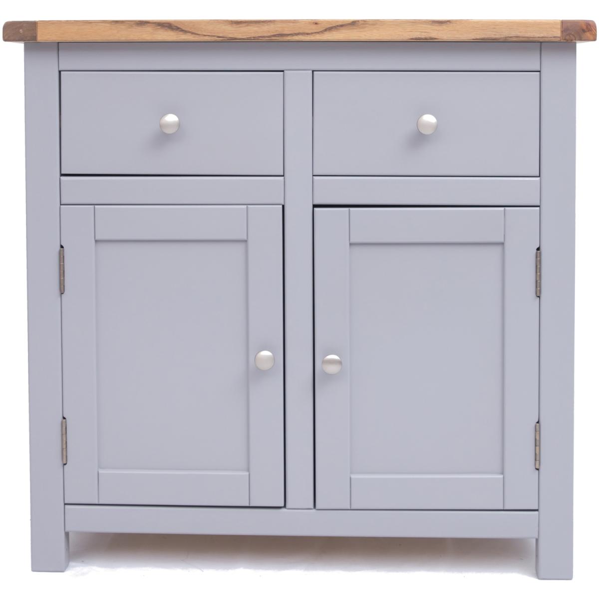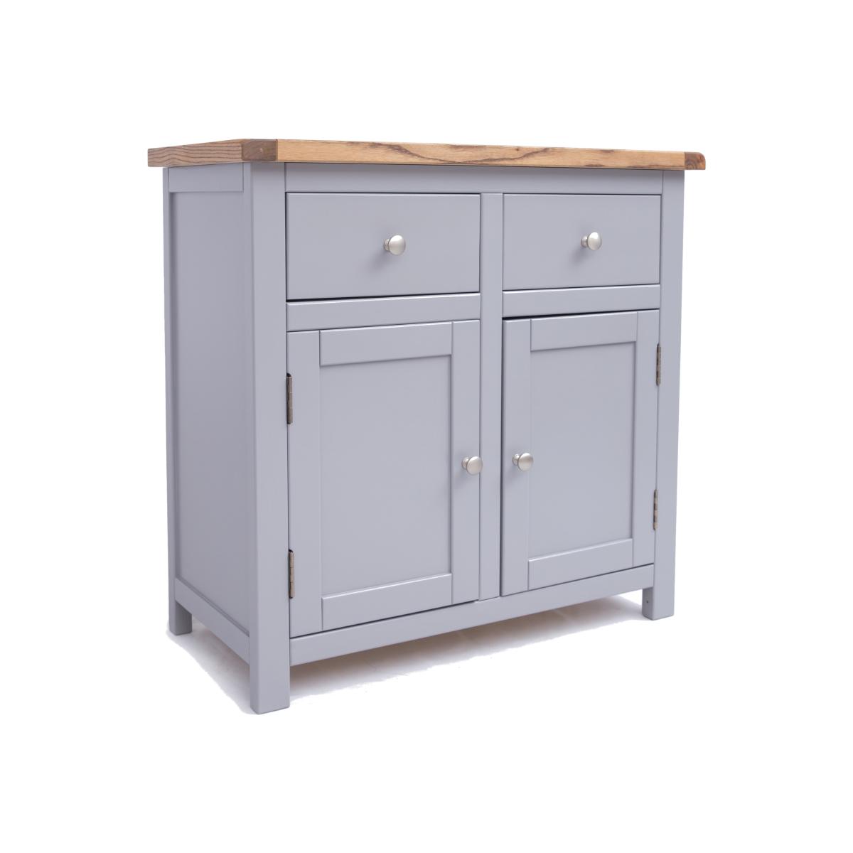 Our Mirano collection has a simple but pleasing design and is produced by our skilled craftsmen to the highest standards using responsibly sourced wood and veneers. All tops are made using a combination of hardwood and ash veneer and are carefully hand waxed giving it a great look. The body is finished with a high quality eco-friendly water base paint on a grey colour. A compact 2 door 2 drawer sideboard ideal for your kitchen, dining room or lounge. The two doors conceal a large cupboard space for storing crockery, bottles or glassware and there is a shelf to help you organise your contents too. Above this there are two drawers for cutlery, napkins, place mats or maybe even keeping essential paperwork to hand. These attributes combined with a simple construction for easy assembly makes it a great value product to be taken home today.