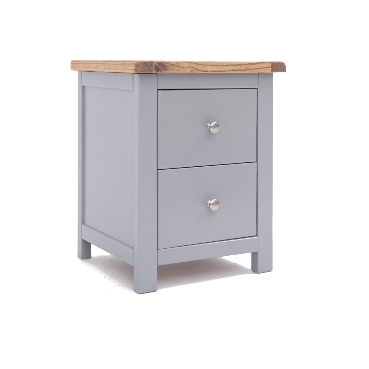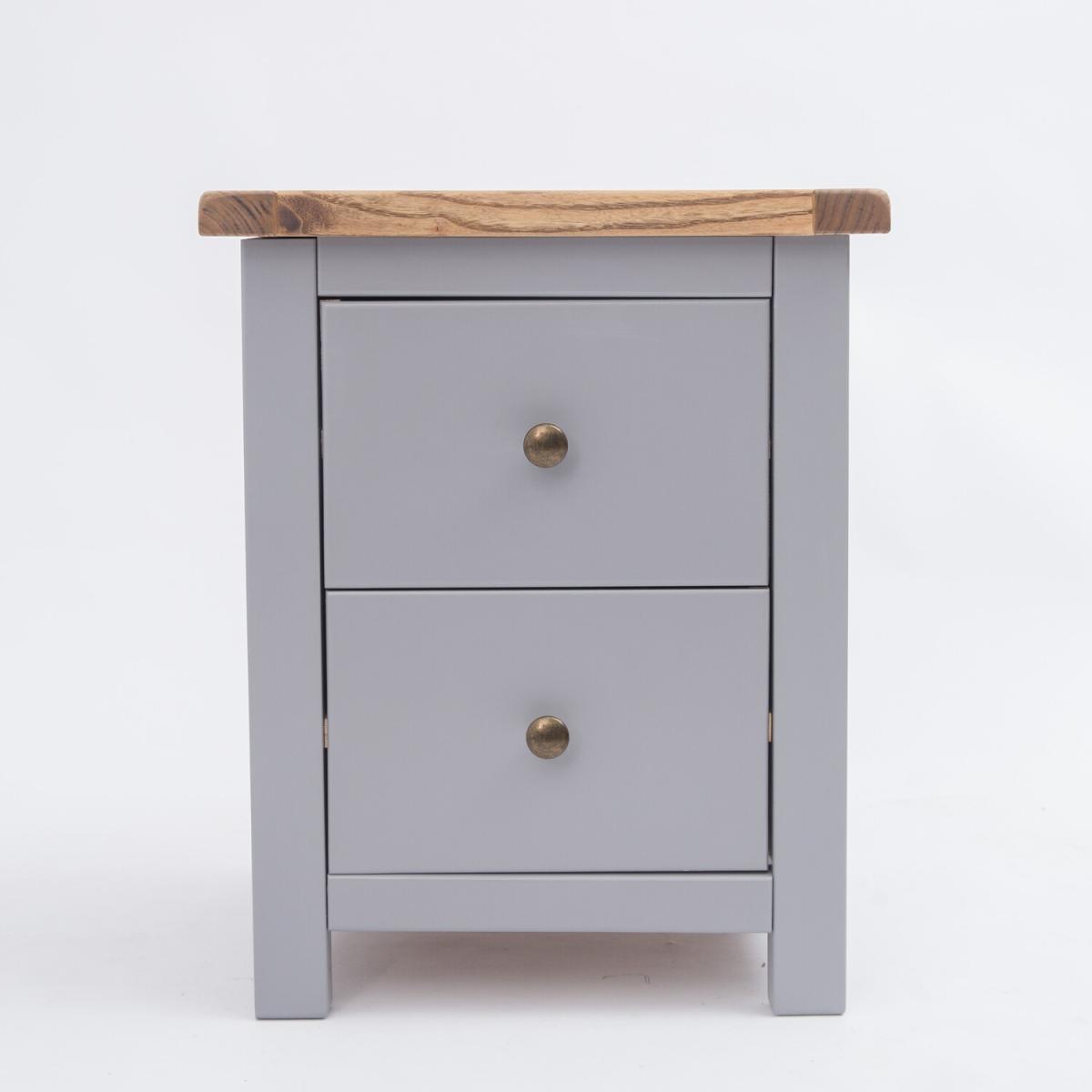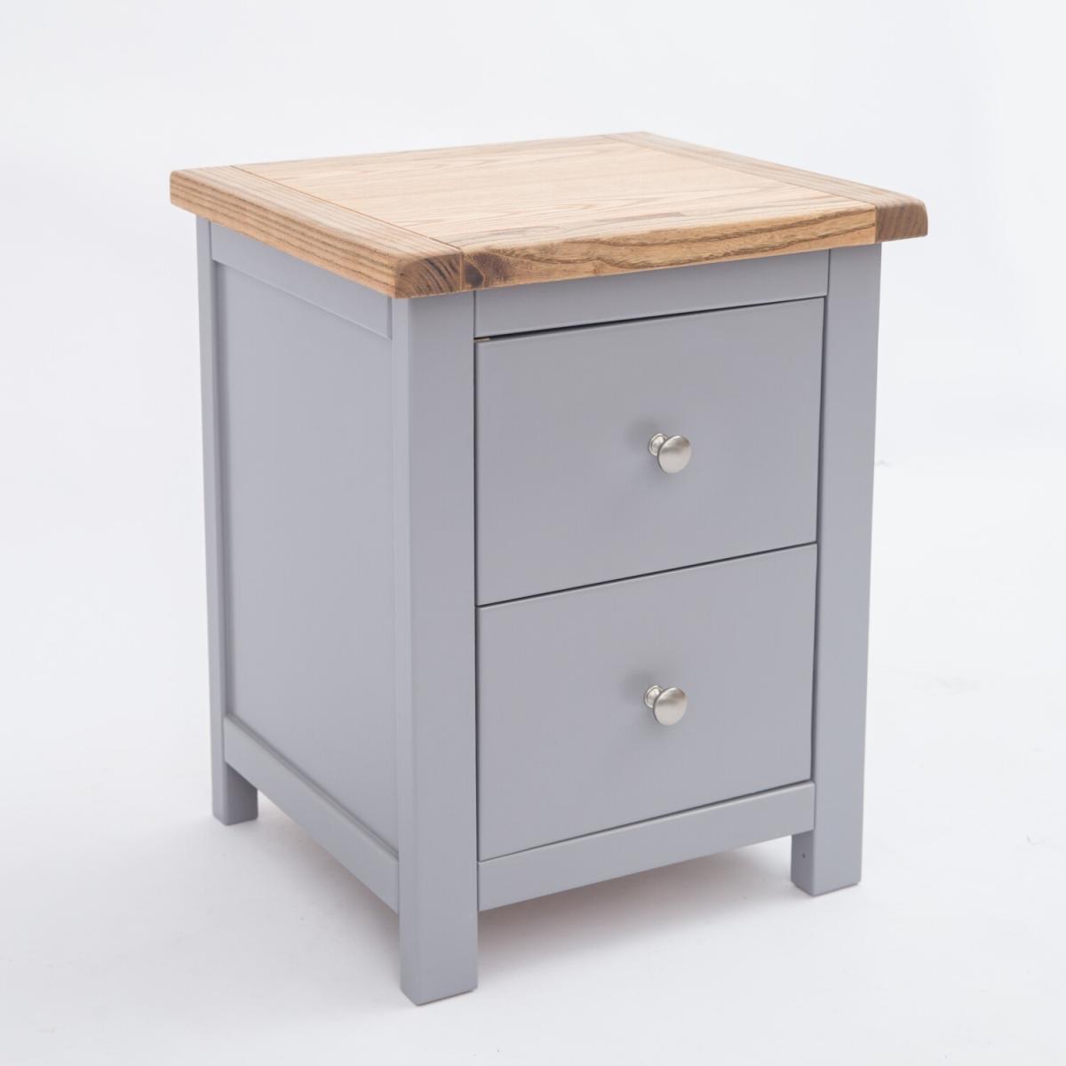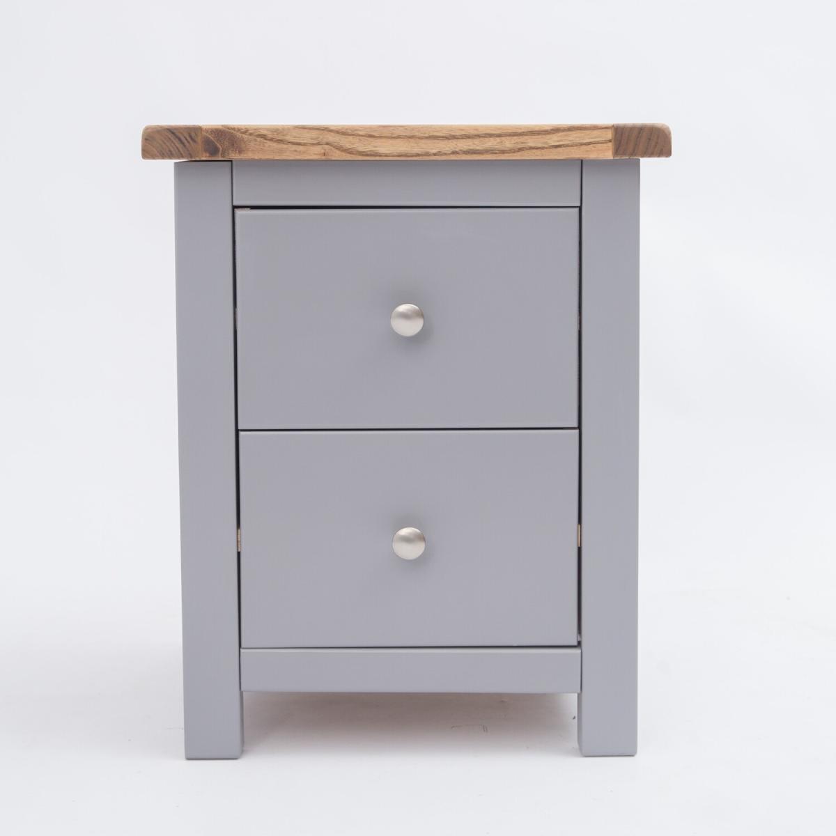 Our Mirano collection has a simple but pleasing design and is produced by our skilled craftsmen to the highest standards using responsibly sourced wood and veneers. All tops are made using a combination of hardwood and ash veneer and are carefully hand-waxed giving them a great look. The body is finished with high-quality eco-friendly water-based paint in a dark grey colour. This 2-drawer bedside cabinet is a perfect fit for your bedroom. With a timeless and traditional design and giving you plenty of storage space. It has 2 deep drawers that can be fitted with chrome or an antique brass knob, giving it great flexibility to fit it into your existing room set. These attributes combined with a simple construction for easy assembly make it a great value product to be taken home today.